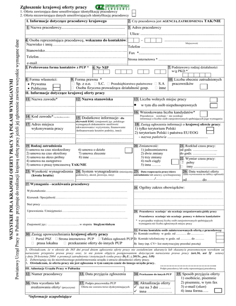 Zgłoszenie krajowej oferty pracy 1. Oferta zawierająca dane umożliwiające identyfikację pracodawcy 2. Oferta niezawierająca danych umożliwiających identyfikację pracodawcy I. Informacje dotyczące pracodawcy krajowego 2. Czy pracodawca jest AGENCJĄ ZATRUDNIENIA TAK/NIE 1. Nazwa pracodawcy................................................................ 3. Adres pracodawcy WSZYSTKIE POLA KRAJOWEJ OFERTY PRACY SĄ POLAMI WYMAGANYMI Powiatowy Urząd Pracy w Pułtusku przyjmuje do realizacji krajową ofertę pracy jeżeli jej zgłoszenie zawiera wszystkie wymagane dane ..................................................................................................... 4. Osoba reprezentująca pracodawcę, wskazana do kontaktów: Nazwisko i imię………………………………………………… Stanowisko……………………………………………………... Telefon………………………………………………….……… Ulica: .................................................................................... - .......................................................... Miejscowość Telefon ................................................................................... Fax *................................................................................... Strona internetowa * ………………………………………… e-mail………………………………………………..…………. 5. Preferowana forma kontaktów z PUP * 6. Nr NIP 7. Podstawowy rodzaj działalności w/g PKD * ................................................................... 8. Forma własności: 9. Forma prawna * S.C. Przedsiębiorstwo państwowe Prywatna Osoba fizyczna prowadząca działalność gosp. Publiczna II. Informacje dotyczące krajowej oferty pracy 11. Nazwa zawodu* 12. Nazwa stanowiska S.A 10. Liczba obecnie zatrudnionych pracowników 13. Liczba wolnych miejsc pracy ……………………………...... .......................................................... w tym dla osób niepełnosprawnych ………………….…................. .......................................................... 16. Wnioskowana liczba kandydatów* Pracodawca oczekuje / nie oczekuje 14. Kod zawodu* 15. Dodatkowe informacje- dla (wg. Klasyfikacji zawodów i informacji o liczbie osób zarejestrowanych spełniających jego wymagania specjalności) ……………………………..... obywateli EOG: (znajomość jęz. polskiego wymaganych dokumentów możliwość .............................................. 17. Adres miejsca 18. Zasięg ogłoszenia informacji o krajowej ofercie pracy: zakwaterowania i wyżywienia, finansowanie wykonywania pracy 1) tylko terytorium Polski /dofinansowanie kosztów podróży, inne): .................................................. ........................................................................ 2) terytorium Polski i państwa EU/EOG ……………………………….. ............................................................. - nazwa państw/a ......................................... .......................................................... ................................ 19. Rodzaj zatrudnienia 1) umowa na czas nieokreślony 6) umowa o dzieło 2) umowa na czas określony 7) umowa zlecenie 3) umowa na okres próbny 8) inne …………………….. 4) umowa na zastępstwo 5) umowa o pracę tymczasową TAK/NIE 20. Zmianowość: 1) jednozmianowa 2) dwie zmiany 3) trzy zmiany 4) ruch ciągły 5) inna …….. 21. Rozkład czasu pracy: od godz. ………………... do godz. ……………….. 22. Wymiar czasu pracy: pełny inny ........................... 26. Data ważności oferty 23. Wysokość wynagrodzenia 24. System wynagradzania (miesięczny, 25. (kwota brutto) godzinowy, akord, prowizja, inny) Data rozpoczęcia pracy/okres zatrudnienia lub umowy cywilnoprawnej (data wywieszenia na tablicy ogłoszeń) ................................................. ....................................................... ……………./…………….... od…………do…………. 27. Wymagania - oczekiwania pracodawcy Wykształcenie…..………….....………………………………………………… 28. Ogólny zakres obowiązków: ............................................................................................................... Kierunek /Specjalność….......…………………………………………………… …………………………………………………………………………. Staż pracy ............................................................................................................ ………………………………………………………………………….. Uprawnienia /Umiejętności……...............……………………………………. 29. Pracodawca oczekuje/ nie oczekuje zorganizowania giełdy pracy Pracodawca oczekuje/ nie oczekuje pomocy w doborze kandydatów …………………………………………………………………………………... Znajomość jęz.: ……………………....…w stopniu biegłym/słabym * w przypadku większej liczby osób zarejestrowanych spełniających wymagania niż liczba zgłoszonych miejsc pracy 31. Forma kontaktu osób zainteresowanych ofertą z pracodawcą: Kontakt osobisty w godz. od ………. do ………… 1) 30. Zasięg upowszechniania krajowej oferty pracy Portal PSZ Strona internetowa PUP Tablica ogłoszeń PUP 2) prasa lokalna przekazanie oferty do innych PUP 3) Kontakt telefoniczny w godz. od ………. do ……... Inny (np. CV+ list motywacyjny przesłać pocztą) 1. Oświadczam, że w okresie do 365 dni przed dniem zgłoszenia oferty pracy nie zostałem/am ukarany/a lub skazany/a prawomocnym wyrokiem za naruszenie przepisów prawa pracy oraz, że nie jestem objęty/a postępowaniem dotyczącym naruszenia prawa pracy (art.36, ust 5f z dnia 20 kwietnia 2004 o promocj