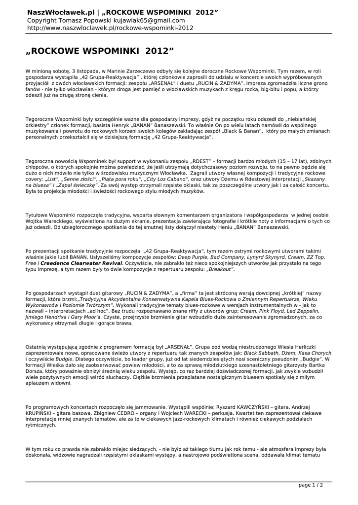NaszWłocławek.pl | „ROCKOWE WSPOMINKI 2012” Copyright Tomasz Popowski [email protected] http://www.naszwloclawek.pl/rockowe-wspominki-2012 „ROCKOWE WSPOMINKI 2012” W minioną sobotę, 3 listopada, w Marinie Zarzeczewo odbyły się kolejne doroczne Rockowe Wspominki. Tym razem, w roli gospodarza wystąpiła „42 Grupa-Reaktywacja” , której członkowie zaprosili do udziału w koncercie swoich wypróbowanych przyjaciół z dwóch włocławskich formacji: zespołu „ARSENAŁ” i duetu „RUCIN & ZADYMA”. Impreza zgromadziła liczne grono fanów - nie tylko włocławian - którym droga jest pamięć o włocławskich muzykach z kręgu rocka, big-bitu i popu, a którzy odeszli już na drugą stronę cienia. Tegoroczne Wspominki były szczególnie ważne dla gospodarzy imprezy, gdyż na początku roku odszedł do „niebiańskiej orkiestry” członek formacji, basista Henryk „BANAN” Banaszewski. To właśnie On po wielu latach namówił do wspólnego muzykowania i powrotu do rockowych korzeni swoich kolegów zakładając zespół „Black & Banan”, który po małych zmianach personalnych przekształcił się w dzisiejszą formację „42 Grupa-Reaktywacja”. Tegoroczna nowością Wspominek był support w wykonaniu zespołu „RDEST” – formacji bardzo młodych (15 – 17 lat), zdolnych chłopców, o których spokojnie można powiedzieć, że jeśli utrzymają dotychczasowy poziom rozwoju, to na pewno będzie się dużo o nich mówiło nie tylko w środowisku muzycznym Włocławka. Zagrali utwory własnej kompozycji i tradycyjne rockowe covery: „List”, „Senne złości”, „Piąta pora roku”, „City Los Cabano”, oraz utwory Dżemu w Rdestowej interpretacji „Skazany na bluesa” i „Zapal świeczkę”. Za swój występ otrzymali rzęsiste oklaski, tak za poszczególne utwory jak i za całość koncertu. Była to projekcja młodości i świeżości rockowego stylu młodych muzyków. Tytułowe Wspominki rozpoczęła tradycyjna, wsparta słownym komentarzem organizatora i współgospodarza w jednej osobie Wojtka Wareckiego, wyświetlona na dużym ekranie, prezentacja zawierająca fotografie i krótkie noty z informacjami o tych co już odeszli. Od ubiegłorocznego spotkania do tej smutnej listy dołączył niestety Heniu „BANAN” Banaszewski. Po prezentacji spotkanie tradycyjnie rozpoczęła „42 Grupa–Reaktywacja”, tym razem ostrymi rockowymi utworami takimi właśnie jakie lubił BANAN. Usłyszeliśmy kompozycje zespołów: Deep Purple, Bad Company, Lynyrd Skynyrd, Cream, ZZ Top, Free i Creedence Clearwater Revival. Oczywiście, nie zabrakło też nieco spokojniejszych utworów jak przystało na tego typu imprezę, a tym razem były to dwie kompozycje z repertuaru zespołu: „Breakout”. Po gospodarzach wystąpił duet gitarowy „RUCIN & ZADYMA”, a „firma” ta jest skróconą wersją dowcipnej „krótkiej” nazwy formacji, która brzmi:„Tradycyjna Akcydentalna Konserwatywna Kapela Blues-Rockowa o Zmiennym Repertuarze, Wieku Wykonawców i Poziomie Twórczym”. Wykonali tradycyjne tematy blues-rockowe w wersjach instrumentalnych w - jak to nazwali – interpretacjach „ad hoc”. Bez trudu rozpoznawano znane riffy z utworów grup: Cream, Pink Floyd, Led Zeppelin, Jimiego Hendrixa i Gary Moor’a. Czyste, przejrzyste brzmienie gitar wzbudziło duże zainteresowanie zgromadzonych, za co wykonawcy otrzymali długie i gorące brawa. Ostatnią występującą zgodnie z programem formacją był „ARSENAŁ”. Grupa pod wodzą niestrudzonego Wiesia Herliczki zaprezentowała nowe, opracowane świeżo utwory z repertuaru tak znanych zespołów jak: Black Sabbath, Dżem, Kasa Chorych i oczywiście Budgie. Dlatego oczywiście, bo leader grupy, już od lat siedemdziesiątych nosi sceniczny pseudonim „Budgie”. W formacji Wieśka dało się zaobserwować powiew młodości, a to za sprawą młodziutkiego szesnastoletniego gitarzysty Bartka Dorsza, który poważnie obniżył średnią wieku zespołu. Występ, co raz bardziej doświadczonej formacji, jak zwykle wzbudził wiele pozytywnych emocji wśród słuchaczy. Ciężkie brzmienia przeplatane nostalgicznym bluesem spotkały się z miłym aplauzem widowni. Po programowych koncertach rozpoczęło się jammowanie. Wystąpili wspólnie: Ryszard KAWCZYŃSKI – gitara, Andrzej KRUPIŃSKI – gitara basowa, Zbigniew CEDRO – organy i Wojciech WARECKI – perkusja. Kwartet ten zaprezentował ciekawe interpretacje mniej znanych tematów, ale za to w ciekawych jazz-rockowych klimatach i również ciekawych podziałach rytmicznych. W tym roku co prawda nie zabrakło miejsc siedzących, - nie było aż takiego tłumu jak rok temu - ale atmosfera imprezy była doskonała, widzowie nagradzali rzęsistymi oklaskami występy, a nastrojowo podświetlona scena, oddawała klimat tematu page 1 / 2 NaszWłocławek.pl | „ROCKOWE WSPOMINKI 2012” Copyright Tomasz Popowski [email protected] http://www.naszwloclawek.pl/rockowe-wspominki-2012 imprezy i prezentowanej muzyki. Ci, którzy pragnęli usłyszeć najbardziej znane rockowe riffy nie zawiedli się, a tytułowy, plakatowy DEEP PURPLE zaistniał w repertuarze gospodarza wieczoru. A wszystko to - ku pamięci tych co odeszli. Spotkanie, z inicjatywy włocławskich rockowych dinozaurów, zorganizowano jak co roku dzięki współpracy z Yacht Club Anwil i pod patronatem włocławskich mediów. Zespoły według kolejności występów zagrały w składach: „REDST” Łukasz BĄKOWSKI - lat 17 - wokal Przemek JASTRZĘBSKI - lat 16 - gitara solowa Adam KUJAWSKI - lat 16 - gitara basowa Krzysztof KRZOS - lat 15 - perkusja „42 GRUPA-REAKTYWACJA” Andrzej SZYMAŃSKI – wokal Robert KARBOWSKI - gitara Andrzej KRUPIŃSKI – gitara basowa Bogdan DRUJCZYK - perkusja Sławek WOJCIECHOWSKI – conga Wojtek WARECKI – instrumenty perkusyjne „RUCIN & ZADYMA”: Zbigniew RUCIŃSKI – gitara Jacek PIOTROWSKI - gitara „ARSENAŁ” Kuba MAJOROWSKI- wokal Wiesław HERL