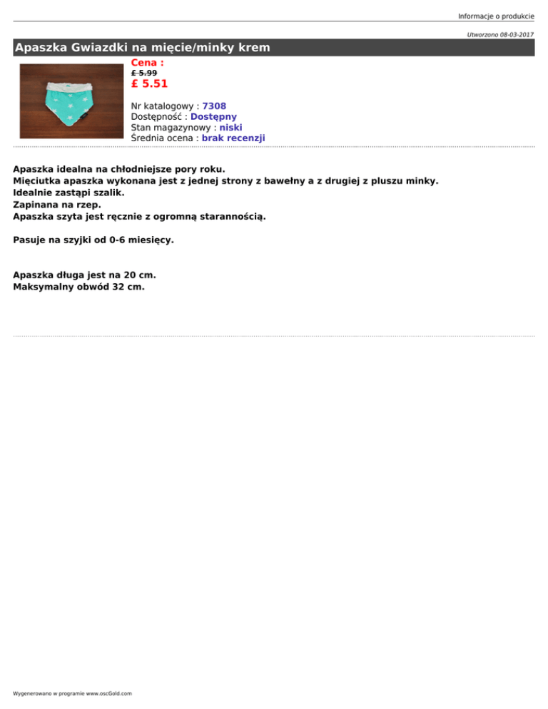 Informacje o produkcie Utworzono 08-03-2017 Apaszka Gwiazdki na mięcie/minky krem Cena : £ 5.99 £ 5.51 Nr katalogowy : 7308 Dostępność : Dostępny Stan magazynowy : niski Średnia ocena : brak recenzji Apaszka idealna na chłodniejsze pory roku. Mięciutka apaszka wykonana jest z jednej strony z bawełny a z drugiej z pluszu minky. Idealnie zastąpi szalik. Zapinana na rzep. Apaszka szyta jest ręcznie z ogromną starannością. Pasuje na szyjki od 0-6 miesięcy. Apaszka długa jest na 20 cm. Maksymalny obwód 32 cm. Wygenerowano w programie www.oscGold.com