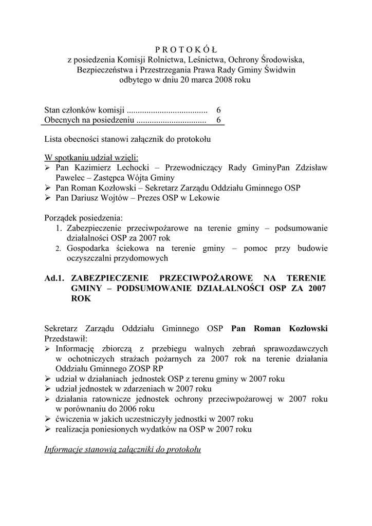 PROTOKÓŁ z posiedzenia Komisji Rolnictwa, Leśnictwa, Ochrony Środowiska, Bezpieczeństwa i Przestrzegania Prawa Rady Gminy Świdwin odbytego w dniu 20 marca 2008 roku Stan członków komisji ..................................... Obecnych na posiedzeniu ................................ 6 6 Lista obecności stanowi załącznik do protokołu W spotkaniu udział wzięli: Pan Kazimierz Lechocki – Przewodniczący Rady GminyPan Zdzisław Pawelec – Zastępca Wójta Gminy Pan Roman Kozłowski – Sekretarz Zarządu Oddziału Gminnego OSP Pan Dariusz Wojtów – Prezes OSP w Lekowie Porządek posiedzenia: 1. Zabezpieczenie przeciwpożarowe na terenie gminy – podsumowanie działalności OSP za 2007 rok 2. Gospodarka ściekowa na terenie gminy – pomoc przy budowie oczyszczalni przydomowych Ad.1. ZABEZPIECZENIE PRZECIWPOŻAROWE NA TERENIE GMINY – PODSUMOWANIE DZIAŁALNOŚCI OSP ZA 2007 ROK Sekretarz Zarządu Oddziału Gminnego OSP Pan Roman Kozłowski Przedstawił: Informację zbiorczą z przebiegu walnych zebrań sprawozdawczych w ochotniczych strażach pożarnych za 2007 rok na terenie działania Oddziału Gminnego ZOSP RP udział w działaniach jednostek OSP z terenu gminy w 2007 roku udział jednostek w zdarzeniach w 2007 roku działania ratownicze jednostek ochrony przeciwpożarowej w 2007 roku w porównaniu do 2006 roku ćwiczenia w jakich uczestniczyły jednostki w 2007 roku realizacja poniesionych wydatków na OSP w 2007 roku Informacje stanowią załączniki do protokołu 2 Radny – Prezes OSP w Rusinowie Pan Mieczysław Kozicki poinformował, że OSP w Rusinowie jest jedną z liczniejszych jednostek. Stan strażaków czynnych to dwudziestu czterech ochotników. Strażacy posiadają aktualne badania. Bolączką jednostki jest brak szkoleń tych strażaków, którzy wyjeżdżają do pożaru. Pan Kozicki ma nadzieję, że jednostki OSP z terenu gminy Świdwin będą miały silniejsze wzmocnienie, ponieważ Prezesem Zarządu Oddziału Powiatowego OSP RP wybrany został Zastępca Wójta Gminy Pan Zdzisław Pawelec. Zdaniem radnego statystyki nie zawsze są obrazem tego co robią strażacy. W Rusinowie modernizowana jest strażnica. Większość prac wykonują strażacy we własnym zakresie przy wsparciu społeczeństwa. Sami pozyskują materiały z rozbiórek zasobów agencyjnych. Fachowym nadzorem budowlanym służy Urząd Gminy. Jednostka czyni starania o pozyskanie środków z zewnątrz. Największą bolączką jest brak przeszkoleń z zakresu BHP oraz sprzętu atestowanego. Pan Kozicki podkreślił, że plotką jest, że strażacy zarabiają na pożarach. Strażacy dostają wynagrodzenie, ale w większości jednostek wszystkie pieniądze przeznaczane są na działalność jednostki. Zastępca Wójta - Prezes OSP Pan Zdzisław Pawelec poinformował, że jednostka OSP w Bierzwnicy reaktywowała się dziewięć lat temu. Również podkreślił, że jednostka zajmuje się nie tylko gaszeniem pożaru. Jest centrum działalności kulturalno oświatowej na wsi, między innymi: organizują Dzień Strażaka uczestniczą w zawodach sportowo – pożarniczych pomagają w organizacji festynu kościelnego organizują festyn strażacki dla mieszkańców obstawiają dożynki powiatowe organizują spotkania opłatkowe są do dyspozycji przy remoncie kościoła obstawiali poświęcenie figurki w Sławie przygotowują sprzęt do przeglądu Ad.2. GOSPODARKA ŚCIEKOWA NA TERENIE GMINY – POMOC PRZY BUDOWIE OCZYSZCZALNI PRZYDOMOWYCH Zastępca Wójta Pan Zdzisław Pawelec poinformował, że zgodnie z założeniami musimy przymierzyć się do pomocy budowy oczyszczalni przydomowych. W związku z powyższym przedstawił projekty: Regulaminu dofinansowania ze środków Gminnego Funduszu Ochrony Środowiska i Gospodarki Wodnej osobom fizycznym na pomoc w dofinansowaniu budowy przydomowych oczyszczali ścieków na terenie gminy 3 Wniosku o przyznanie środków finansowych budowy przydomowych oczyszczalni ścieków Wzoru umowy Celem zapoznania się z treścią, dokumenty zostały przedłożone radnym Projekty dokumentów stanowią załączniki do protokołu O przyznanie środków będą mogły ubiegać się miejscowości, które nie podlegają kanalizacji zbiorowej. Radni wnioskowali, aby przygotować komplet dokumentów obowiązujących przy składaniu wniosków łącznie z informacją, gdzie zainteresowani będą mogli ubiegać się o środki z dodatkowych źródeł. Informację tą rozpropagować na tablicach ogłoszeń oraz zasygnalizować na spotkaniu z sołtysami w dniu 28 marca br. Ze względu na różne ceny budowy oczyszczali, radni zobowiązali Zastępcę Wójta do zebrania folderów firm oferujących się. Komisja zastanawiała się również nad sposobem dofinansowania przez Urząd Gminy – czy będzie to stała kwota, czy stawka procentowa. WOLNE WNIOSKI Radny Pan Antoni Giluk zwrócił się z pytaniem, kiedy Firma EKO FIUK dogada się z Prezesem Międzygminnego Wysypiska Śmieci w Wardyniu Górnym i kiedy będzie wyjaśniona sprawa odpłatności za segregację śmieci. Na tym protokół zakończono. Protokołowała Wiesława Żmudzińska