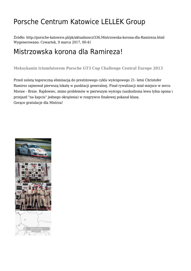 Porsche Centrum Katowice LELLEK Group Źródło: http://porsche-katowice.pl/pk/aktualnosci/336,Mistrzowska-korona-dla-Ramireza.html Wygenerowano: Czwartek, 9 marca 2017, 00:41 Mistrzowska korona dla Ramireza! Meksykanin triumfatorem Porsche GT3 Cup Challenge Central Europe 2013 Przed szóstą tegoroczną eliminacją do prestiżowego cyklu wyścigowego 21- letni Christofer Ramirez zajmował pierwszą lokatę w punktacji generalnej. Finał rywalizacji miał miejsce w sercu Moraw - Brnie. Rajdowiec, mimo problemów w pierwszym wyścigu (uszkodzona lewa tylna opona i przejazd "na kapciu" jednego okrążenia) w rozgrywce finałowej pokazał klasę. Gorące gratulacje dla Mistrza! Tweetnij