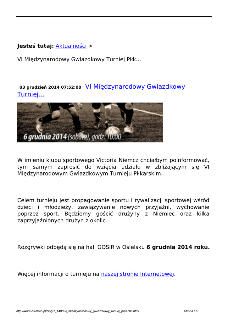 Jesteś tutaj: Aktualności > VI Międzynarodowy Gwiazdkowy Turniej Piłk... 03 grudzień 2014 07:52:00 VI Międzynarodowy Gwiazdkowy Turniej... W imieniu klubu sportowego Victoria Niemcz chciałbym poinformować, tym samym zaprosić do wzięcia udziału w zbliżającym się VI Międzynarodowym Gwiazdkowym Turnieju Piłkarskim. Celem turnieju jest propagowanie sportu i rywalizacji sportowej wśród dzieci i młodzieży, zawiązywanie nowych przyjaźni, wychowanie poprzez sport. Będziemy gościć drużyny z Niemiec oraz kilka zaprzyjaźnionych drużyn z okolic. Rozgrywki odbędą się na hali GOSiR w Osielsku 6 grudnia 2014 roku. Więcej informacji o turnieju na naszej stronie Internetowej. http://www.osielsko.pl/blog/1_1488-vi_miedzynarodowy_gwiazdkowy_turniej_pilkarski.html Strona 1/3 Mamy nadzieję, że pojawicie się Państwo na turnieju. /P-LUKS Victoria Niemcz/ drukuj http://www.osielsko.pl/blog/1_1488-vi_miedzynarodowy_gwiazdkowy_turniej_pilkarski.html Strona 2/3 Wróć http://www.osielsko.pl/blog/1_1488-vi_miedzynarodowy_gwiazdkowy_turniej_pilkarski.html Powered by TCPDF (www.tcpdf.org) Strona 3/3