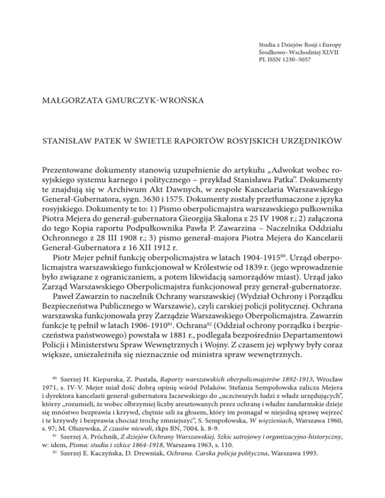 Studia z Dziejów Rosji i Europy Środkowo–Wschodniej XLVII PL ISSN 1230–5057 Małgorzata Gmurczyk‑Wrońska Stanisław Patek w świetle raportów rosyjskich urzędników Prezentowane dokumenty stanowią uzupełnienie do artykułu „Adwokat wobec ro‑ syjskiego systemu karnego i politycznego – przykład Stanisława Patka”. Dokumenty te znajdują się w Archiwum Akt Dawnych, w zespole Kancelaria Warszawskiego Generał‑Gubernatora, sygn. 3630 i 1575. Dokumenty zostały przetłumaczone z języka rosyjskiego. Dokumenty te to: 1) Pismo oberpolicmajstra warszawskiego pułkownika Piotra Mejera do generał‑gubernatora Gieorgija Skałona z 25 IV 1908 r.; 2) załączona do tego Kopia raportu Podpułkownika Pawła P. Zawarzina – Naczelnika Oddziału Ochronnego z 28 III 1908 r.; 3) pismo generał‑majora Piotra Mejera do Kancelarii Generał‑Gubernatora z 16 XII 1912 r. Piotr Mejer pełnił funkcję oberpolicmajstra w latach 1904‑191580. Urząd oberpo‑ licmajstra warszawskiego funkcjonował w Królestwie od 1839 r. (jego wprowadzenie było związane z ograniczaniem, a potem likwidacją samorządów miast). Urząd jako Zarząd Warszawskiego Oberpolicmajstra funkcjonował przy generał‑gubernatorze. Paweł Zawarzin to naczelnik Ochrany warszawskiej (Wydział Ochrony i Porządku Bezpieczeństwa Publicznego w Warszawie), czyli carskiej policji politycznej. Ochrana warszawska funkcjonowała przy Zarządzie Warszawskiego Oberpolicmajstra. Zawarzin funkcje tę pełnił w latach 1906‑191081. Ochrana82 (Oddział ochrony porządku i bezpie‑ czeństwa państwowego) powstała w 1881 r., podlegała bezpośrednio Departamentowi Policji i Ministerstwu Spraw Wewnętrznych i Wojny. Z czasem jej wpływy były coraz większe, uniezależniła się nieznacznie od ministra spraw wewnętrznych. Szerzej H. Kiepurska, Z. Pustała, Raporty warszawskich oberpolicmajstrów 1892‑1913, Wrocław 1971, s. IV‑V. Mejer miał dość dobrą opinię wśród Polaków. Stefania Sempołowska zalicza Mejera i dyrektora kancelarii generał‑gubernatora Jaczewskiego do „uczciwszych ludzi z władz urzędujących”, którzy „rozumieli, że wobec olbrzymiej liczby aresztowanych przez ochranę i władze żandarmskie dzieje się mnóstwo bezprawia i krzywd, chętnie szli za głosem, który im pomagał w niejedną sprawę wejrzeć i te krzywdy i bezprawia chociaż trochę zmniejszyć”, S. Sempołowska, W więzieniach, Warszawa 1960, s. 97; M. Olszewska, Z czasów niewoli, rkps BN, 7004, k. 8‑9. 81 Szerzej A. Próchnik, Z dziejów Ochrany Warszawskiej. Szkic ustrojowy i organizacyjno‑historyczny, w: idem, Pisma: studia i szkice 1864‑1918, Warszawa 1963, s. 110. 82 Szerzej E. Kaczyńska, D. Drewniak, Ochrana. Carska policja polityczna, Warszawa 1993. 80 202 Małgorzata Gmurczyk‑Wrońska Dok. 1 Pismo oberpolicmajstra warszawskiego pułkownika Piotra Mejera do generał‑guber‑ natora Gieorgija Skałona z 25 IV 1908 r. Tajne Do Warszawskiego Generał‑Gubernatora. Przedstawiając przy tym w kopii raport Naczelnika Oddziału Ochronnego z 28‑go marca tego roku pod No 5540, donoszę Waszej Ekscelencji, że przeszukanie w miesz‑ kaniu przysięgłego pełnomocnika P a t k a i areszt jego zostały wykonane na podstawie rozporządzenia Oddziału Ochronnego bez mojego udziału i zarówno ta okoliczność jak i brak oryginalnej korespondencji w sprawie (ołówkiem – podkreślenie w tek‑ ście) owego aresztowania pozbawiają mnie możliwości wydania opinii o zasadności przytoczonych w raporcie danych oskarżycielskich. Zarazem uważam za swój obowiązek zaraportować, iż usunięcie z kraju P. Patka niewątpliwie może wywołać powszechne pretensje ze strony przysięgłych pełno‑ mocników, w oczach których środek ten może okazać się skierowanym przeciwko wszystkim osobom, biorącym na siebie obowiązek obrony w sądach przestępców politycznych. Dodam, iż P. Patek zajmuje określoną (podkreślone w tekście) i wielce solidną pozycję w miejscowej społeczności i był jednym z założycieli polskiej partii postępowej83. W swoich prywatnych kontaktach z władzami zachowywał się lojalnie, z dużym tak‑ tem i na zewnątrz w niczym nie przejawiał swojej politycznej nieprawomyślności. Biorąc pod uwagę wyżej przedstawione, znajduję, iż propozycja Naczelnika Od‑ działu Ochronnego84 o zakazaniu Patkowi zamieszkania powinno się w chwili obecnej pozostawić bez satysfakcji, do czasu przedstawienia dokładniejszych danych, mających ustalić winę Patka, P.o. Ober‑Policmajstra, Pułkownik Mejer Dok. 2 Ściśle Tajne Kopia raportu Naczelnika Oddziału Ochronnego Piotra Zawarzina z 28‑go marca 1908 roku No 5540 Zgodnie z otrzymanymi przez Oddział Ochronny informacjami agenturalnymi, zasługującymi na zaufanie, przysięgły pełnomocnik Stefan Aleksandrow P a t e k 85, zamieszkujący w m. Warszawie, na ulicy Królewskiej, w domu No 25 nie należąc do konkretnej partii rewolucyjnej, współpracował w podziemnych wydawnictwach Polskiej Partii Socjalistycznej i świadczył stałe usługi zarówno tej, jak i innym partiom, nie tylko broniąc bezpłatnie oskarżonych, oddanych pod sąd, ale także występując jako Chodzi o Związek Postępowo‑Demokratyczny. Chodzi o Pawła Zawarzina. 85 Powinno być Stanisław Aleksandrowicz. 83 84 Stanisław Patek w świetle raportów rosyjskich urzędników 203 stały orędownik działaczy politycznych przed władzami administracyjnymi, a także organizując i udzielając swoim współtowarzyszom pomoc materialną. Na początku miesiąca lutego tego roku przypadkowo zostały przechwycone no‑ tatki przetrzymywanej w X‑m Pawilonie Warszawskiej Twierdzy Zofii O w c z a r e k , zatrzymanej w m. Sokołowie, guberni Siedleckiej i oskarżonej w sprawie udziału w napadzie na pocztę w m. Sokołowie i w sprawie zamachu na życie warszawskiego Generał‑Gubernatora – adiutanta Skałona na ulicy Natalijskiej, 5‑go sierpnia 1906 roku, które p