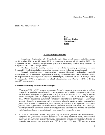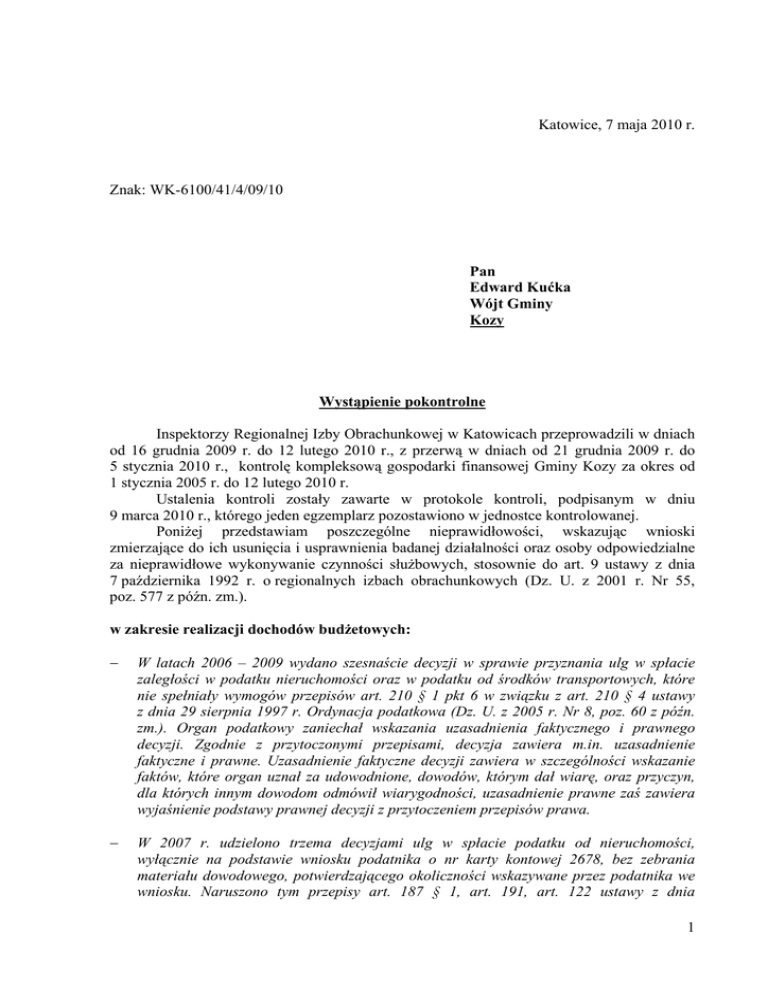 Katowice, 7 maja 2010 r. Znak: WK-6100/41/4/09/10 Pan Edward Kućka Wójt Gminy Kozy Wystąpienie pokontrolne Inspektorzy Regionalnej Izby Obrachunkowej w Katowicach przeprowadzili w dniach od 16 grudnia 2009 r. do 12 lutego 2010 r., z przerwą w dniach od 21 grudnia 2009 r. do 5 stycznia 2010 r., kontrolę kompleksową gospodarki finansowej Gminy Kozy za okres od 1 stycznia 2005 r. do 12 lutego 2010 r. Ustalenia kontroli zostały zawarte w protokole kontroli, podpisanym w dniu 9 marca 2010 r., którego jeden egzemplarz pozostawiono w jednostce kontrolowanej. PoniŜej przedstawiam poszczególne nieprawidłowości, wskazując wnioski zmierzające do ich usunięcia i usprawnienia badanej działalności oraz osoby odpowiedzialne za nieprawidłowe wykonywanie czynności słuŜbowych, stosownie do art. 9 ustawy z dnia 7 października 1992 r. o regionalnych izbach obrachunkowych (Dz. U. z 2001 r. Nr 55, poz. 577 z późn. zm.). w zakresie realizacji dochodów budŜetowych: − W latach 2006 – 2009 wydano szesnaście decyzji w sprawie przyznania ulg w spłacie zaległości w podatku nieruchomości oraz w podatku od środków transportowych, które nie spełniały wymogów przepisów art. 210 § 1 pkt 6 w związku z art. 210 § 4 ustawy z dnia 29 sierpnia 1997 r. Ordynacja podatkowa (Dz. U. z 2005 r. Nr 8, poz. 60 z późn. zm.). Organ podatkowy zaniechał wskazania uzasadnienia faktycznego i prawnego decyzji. Zgodnie z przytoczonymi przepisami, decyzja zawiera m.in. uzasadnienie faktyczne i prawne. Uzasadnienie faktyczne decyzji zawiera w szczególności wskazanie faktów, które organ uznał za udowodnione, dowodów, którym dał wiarę, oraz przyczyn, dla których innym dowodom odmówił wiarygodności, uzasadnienie prawne zaś zawiera wyjaśnienie podstawy prawnej decyzji z przytoczeniem przepisów prawa. − W 2007 r. udzielono trzema decyzjami ulg w spłacie podatku od nieruchomości, wyłącznie na podstawie wniosku podatnika o nr karty kontowej 2678, bez zebrania materiału dowodowego, potwierdzającego okoliczności wskazywane przez podatnika we wniosku. Naruszono tym przepisy art. 187 § 1, art. 191, art. 122 ustawy z dnia 1 29 sierpnia 1997 r. Ordynacja podatkowa (Dz. U. z 2005 r. Nr 8, poz. 60 z późn. zm.). Zgodnie z przytoczonymi przepisami, organ podatkowy jest obowiązany zebrać i w sposób wyczerpujący rozpatrzyć cały materiał dowodowy oraz ocenić na podstawie całego zebranego materiału dowodowego, czy dana okoliczność została udowodniona oraz podjąć wszelkie niezbędne działania w celu dokładnego wyjaśnienia stanu faktycznego oraz załatwienia sprawy w postępowaniu podatkowym. PowyŜsze dotyczyło trzech decyzji: z dnia 28 lutego 2007 r. w sprawie rozłoŜenia na raty zaległości, z dnia 11 czerwca 2007 r. oraz z dnia 28 września 2007 r. w sprawie przesunięcia terminu spłaty rozłoŜonej na raty zaległości. W posiadaniu organu podatkowego były materiały dowodowe zgromadzone dla tego podatnika przy postępowaniu zakończonym wydaniem decyzji w dniu 25 stycznia 2007 r. dotyczącej umorzenia zaległości podatkowej za lata 2004-2005 w wysokości 3.223,43 zł, co uznano za wystarczające. Ponadto w decyzji z dnia 9 maja 2008 r., wydanej podatnikowi o nr karty kontowej 0/12, postanowiono umorzyć w całości podatek za okres od stycznia do kwietnia 2008 r. Nie wskazano w decyzji, Ŝe umorzenie dotyczy zaległości podatkowej. Zgodnie z art. 67 a § 1 wyŜej wymienionej ustawy, organ podatkowy na wniosek podatnika, w przypadkach uzasadnionych waŜnym interesem podatnika lub interesem publicznym, moŜe: odroczyć termin płatności podatku lub rozłoŜyć zapłatę podatku na raty, odroczyć lub rozłoŜyć na raty zapłatę zaległości podatkowej wraz z odsetkami za zwłokę, umorzyć w całości lub w części zaległości podatkowe, odsetki za zwłokę lub opłatę prolongacyjną. W trakcie kontroli stwierdzono równieŜ, Ŝe w pięciu decyzjach postanowiono umorzyć zaległości podatkowe bez podania tytułu podatku. Zadania w zakresie przygotowania projektów ww. decyzji wykonywali pracownicy Referatu Finansów. Nadzór w tym zakresie sprawowała p. Wiesława Karska – Skarbnik Gminy Kozy. Decyzje o udzielenie ulg w spłacie zobowiązań podatkowych wydał p. Edward Kućka – Wójt Gminy Kozy. Wniosek nr 1 Przeanalizować prawidłowość przeprowadzonych w latach 2006 – 2009 postępowań podatkowych zakończonych wydaniem decyzji o udzieleniu ulg w spłacie zobowiązań podatkowych. W przypadku wystąpienia przesłanek określonych w art. 240 ustawy z dnia 29 sierpnia 1997 r. Ordynacja podatkowa (Dz. U. z 2005 r. Nr 8, poz. 60 z późn. zm.), wznowić postępowanie w celu wydania poprawnej decyzji, mając na uwadze przepisy art. 245 oraz art. 67a ww. ustawy. − Zaniechanie dokonania czynności sprawdzających składanych deklaracji na podatek od nieruchomości. Zgodnie z przepisami art. 272 pkt 1 a, pkt 2 i pkt 3 ustawy z dnia 29 sierpnia 1997 r. Ordynacja podatkowa (Dz. U. z 2005 r. Nr 8, poz. 60 z późn. zm.), organy podatkowe dokonują czynności sprawdzających mających na celu: sprawdzenie terminowości składania deklaracji, stwierdzenie formalnej poprawności dokumentów, ustalenie stanu faktycznego w zakresie niezbędnym do stwierdzenia zgodności z przedstawionymi dokumentami. W latach 2007 – 2009 gminne jednostki organizacyjne dla których ustalono trwały zarząd na władanych nieruchomościach składały deklaracje podatkowe, w których nie wykazały pozycji grunty pozostałe jako podstawy opodatkowania. W decyzjach o trwałym zarządzie ustanowionym na rzecz tych jednostek, wyszczególniono powierzchnie nieruchomości 2 gruntowych. PowyŜsze stwierdzono w deklaracjach podatkowych złoŜonych: na 2007 r. przez Centrum Sportowo - Widowiskowe, Szkołę Podstawową nr 2 w Kozach, na 2008 r. przez Liceum Ogólnokształcące, Centrum Sportowo-Widowiskowe, Szkołę Podstawową nr 2, Gimnazjum w Kozach, na 2009 r. przez Liceum Ogólnoksz