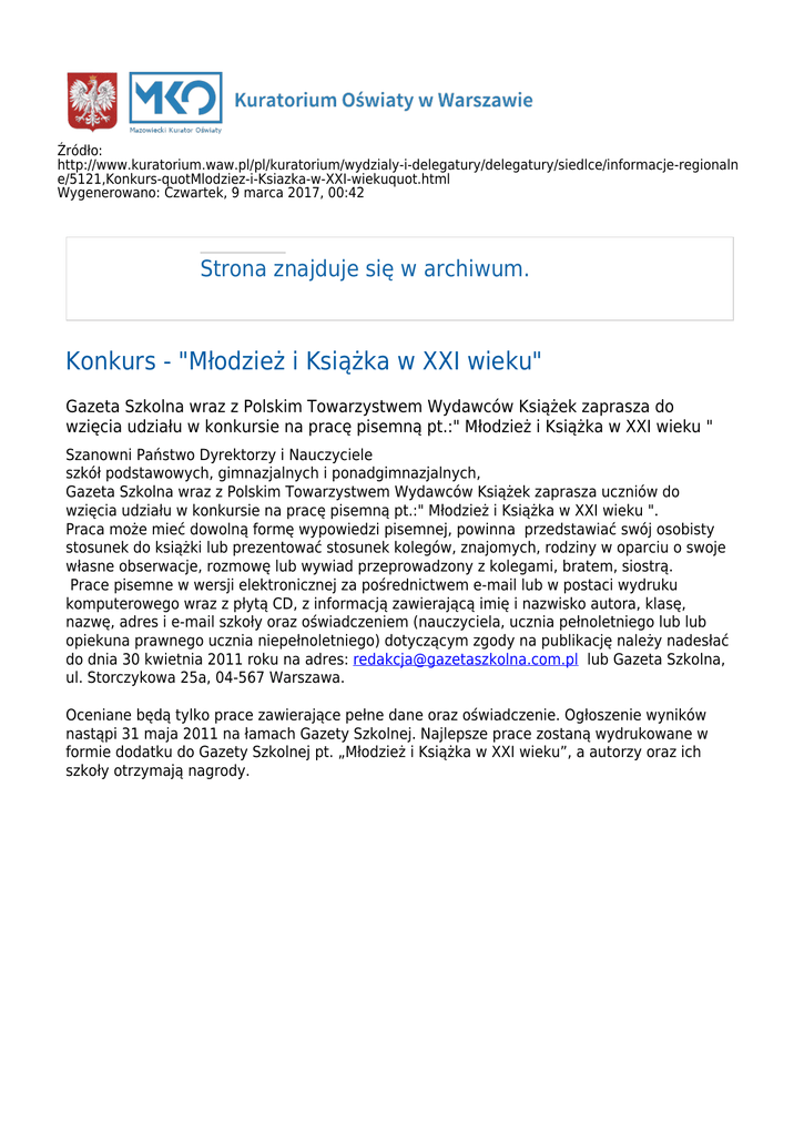 Źródło: http://www.kuratorium.waw.pl/pl/kuratorium/wydzialy-i-delegatury/delegatury/siedlce/informacje-regionaln e/5121,Konkurs-quotMlodziez-i-Ksiazka-w-XXI-wiekuquot.html Wygenerowano: Czwartek, 9 marca 2017, 00:42 Strona znajduje się w archiwum. Konkurs - "Młodzież i Książka w XXI wieku" Gazeta Szkolna wraz z Polskim Towarzystwem Wydawców Książek zaprasza do wzięcia udziału w konkursie na pracę pisemną pt.:" Młodzież i Książka w XXI wieku " Szanowni Państwo Dyrektorzy i Nauczyciele szkół podstawowych, gimnazjalnych i ponadgimnazjalnych, Gazeta Szkolna wraz z Polskim Towarzystwem Wydawców Książek zaprasza uczniów do wzięcia udziału w konkursie na pracę pisemną pt.:" Młodzież i Książka w XXI wieku ". Praca może mieć dowolną formę wypowiedzi pisemnej, powinna przedstawiać swój osobisty stosunek do książki lub prezentować stosunek kolegów, znajomych, rodziny w oparciu o swoje własne obserwacje, rozmowę lub wywiad przeprowadzony z kolegami, bratem, siostrą. Prace pisemne w wersji elektronicznej za pośrednictwem e-mail lub w postaci wydruku komputerowego wraz z płytą CD, z informacją zawierającą imię i nazwisko autora, klasę, nazwę, adres i e-mail szkoły oraz oświadczeniem (nauczyciela, ucznia pełnoletniego lub lub opiekuna prawnego ucznia niepełnoletniego) dotyczącym zgody na publikację należy nadesłać do dnia 30 kwietnia 2011 roku na adres: [email protected] lub Gazeta Szkolna, ul. Storczykowa 25a, 04-567 Warszawa. Oceniane będą tylko prace zawierające pełne dane oraz oświadczenie. Ogłoszenie wyników nastąpi 31 maja 2011 na łamach Gazety Szkolnej. Najlepsze prace zostaną wydrukowane w formie dodatku do Gazety Szkolnej pt. „Młodzież i Książka w XXI wieku”, a autorzy oraz ich szkoły otrzymają nagrody. Plakat Data wytworzenia 11.04.2011 Data publikacji 11.04.2011 Osoba wytwarzająca/odpowiadająca za informację: Iwona Kurek Osoba udostępniająca informację: Iwona Tomczak