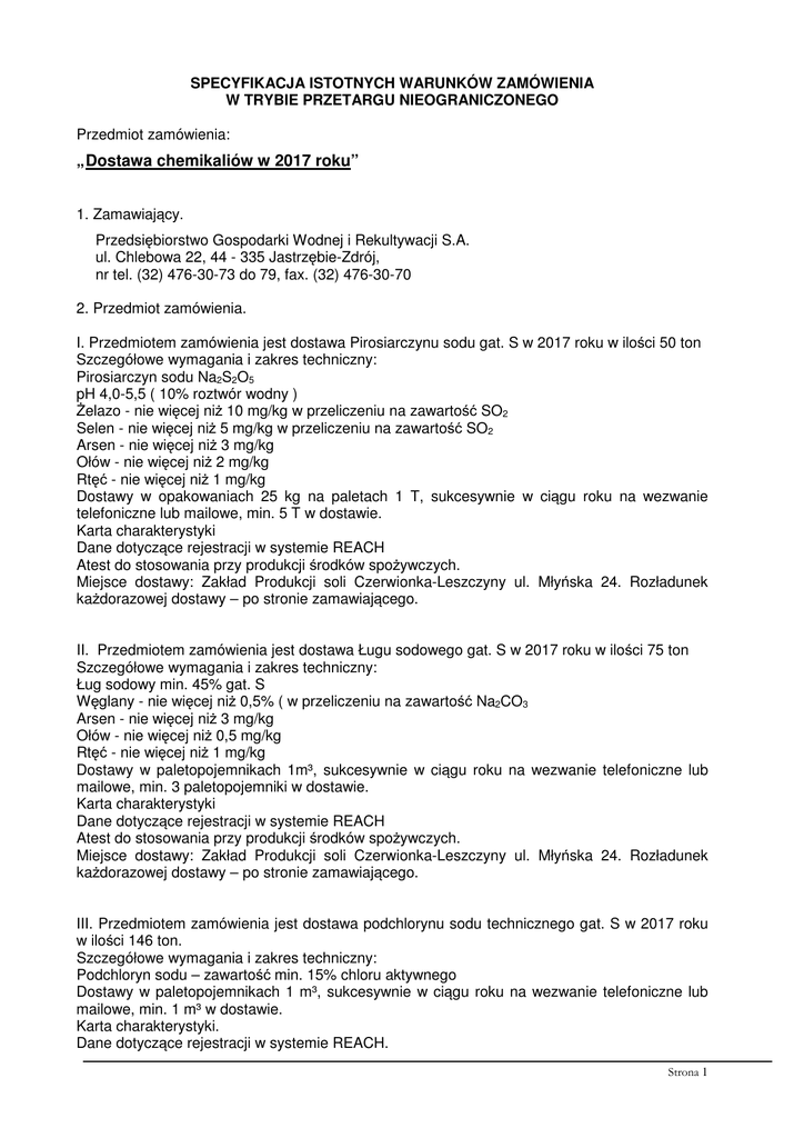 SPECYFIKACJA ISTOTNYCH WARUNKÓW ZAMÓWIENIA W TRYBIE PRZETARGU NIEOGRANICZONEGO Przedmiot zamówienia: „Dostawa chemikaliów w 2017 roku” 1. Zamawiający. Przedsiębiorstwo Gospodarki Wodnej i Rekultywacji S.A. ul. Chlebowa 22, 44 - 335 Jastrzębie-Zdrój, nr tel. (32) 476-30-73 do 79, fax. (32) 476-30-70 2. Przedmiot zamówienia. I. Przedmiotem zamówienia jest dostawa Pirosiarczynu sodu gat. S w 2017 roku w ilości 50 ton Szczegółowe wymagania i zakres techniczny: Pirosiarczyn sodu Na2S2O5 pH 4,0-5,5 ( 10% roztwór wodny ) Żelazo - nie więcej niż 10 mg/kg w przeliczeniu na zawartość SO2 Selen - nie więcej niż 5 mg/kg w przeliczeniu na zawartość SO2 Arsen - nie więcej niż 3 mg/kg Ołów - nie więcej niż 2 mg/kg Rtęć - nie więcej niż 1 mg/kg Dostawy w opakowaniach 25 kg na paletach 1 T, sukcesywnie w ciągu roku na wezwanie telefoniczne lub mailowe, min. 5 T w dostawie. Karta charakterystyki Dane dotyczące rejestracji w systemie REACH Atest do stosowania przy produkcji środków spożywczych. Miejsce dostawy: Zakład Produkcji soli Czerwionka-Leszczyny ul. Młyńska 24. Rozładunek każdorazowej dostawy – po stronie zamawiającego. II. Przedmiotem zamówienia jest dostawa Ługu sodowego gat. S w 2017 roku w ilości 75 ton Szczegółowe wymagania i zakres techniczny: Ług sodowy min. 45% gat. S Węglany - nie więcej niż 0,5% ( w przeliczeniu na zawartość Na2CO3 Arsen - nie więcej niż 3 mg/kg Ołów - nie więcej niż 0,5 mg/kg Rtęć - nie więcej niż 1 mg/kg Dostawy w paletopojemnikach 1m³, sukcesywnie w ciągu roku na wezwanie telefoniczne lub mailowe, min. 3 paletopojemniki w dostawie. Karta charakterystyki Dane dotyczące rejestracji w systemie REACH Atest do stosowania przy produkcji środków spożywczych. Miejsce dostawy: Zakład Produkcji soli Czerwionka-Leszczyny ul. Młyńska 24. Rozładunek każdorazowej dostawy – po stronie zamawiającego. III. Przedmiotem zamówienia jest dostawa podchlorynu sodu technicznego gat. S w 2017 roku w ilości 146 ton. Szczegółowe wymagania i zakres techniczny: Podchloryn sodu – zawartość min. 15% chloru aktywnego Dostawy w paletopojemnikach 1 m³, sukcesywnie w ciągu roku na wezwanie telefoniczne lub mailowe, min. 1 m³ w dostawie. Karta charakterystyki. Dane dotyczące rejestracji w systemie REACH. Strona 1 Atest do stosowania przy produkcji środków spożywczych lub przy produkcji wody pitnej. Miejsca dostawy: 1. Ujęcie Wody Przemysłowej w Godowie, 44-340 Godów, ul. Gliniki 32, w ilości około 30 ton (jednorazowa dostawa około 1000 kg). Rozładunek każdorazowej dostawy poprzez swobodny spływ do zbiorników po stronie zamawiającego PGWiR S.A. (konieczność postoju samochodu dostarczającego podchloryn przez czas rozładunku). 2. Stacja dezynfekcji wody przemysłowej na terenie JSW S.A. KWK „Pniówek”, Pawłowice Śl., ul. Krucza 18, w ilości około 28 ton (jednorazowa dostawa około 1000 kg). Rozładunek każdorazowej dostawy podchlorynu sodu do zbiorników znajdujących się w kontenerze przez Sprzedającego przez przepompowanie poprzez łącze transferowe, zakończone złączem CAMLOCK DN 25 – żeński (wyposażenie stacji dezynfekcji). 3. Stacja dezynfekcji wody przemysłowej na terenie JSW S.A. KWK „Borynia-ZofiówkaJastrzębie” Ruch „Borynia”, Jastrzębie-Zdrój, ul. Węglowa 4, w ilości około 30 ton (jednorazowa dostawa około 1000 kg). Rozładunek każdorazowej dostawy podchlorynu sodu do zbiorników znajdujących się w kontenerze przez Sprzedającego przez przepompowanie poprzez łącze transferowe, zakończone złączem CAMLOCK DN 25 – żeński (wyposażenie stacji dezynfekcji). 4. Stacja dezynfekcji wody przemysłowej na terenie JSW S.A. KWK „Borynia-ZofiówkaJastrzębie” Ruch „Zofiówka”, Jastrzębie-Zdrój, ul. Rybnicka 6, w ilości około 14 ton (jednorazowa dostawa około 1000 kg). Rozładunek każdorazowej dostawy podchlorynu sodu do zbiorników znajdujących się w kontenerze przez Sprzedającego przez przepompowanie poprzez łącze transferowe, zakończone złączem CAMLOCK DN 25 – żeński (wyposażenie stacji dezynfekcji). Realizacja dostaw planowana jest od 1.07.2017 r. 5. Stacja dezynfekcji wody przemysłowej na terenie oczyszczalni ścieków BioBlok-Bio 1000 w Ornontowicach, ul. Nowa oraz Stacja dezynfekcji wody przemysłowej na terenie przyległym do JSW.S.A. KWK „Budryk” w Ornontowicach ul. Zamkowa 10, w ilości łącznie około 30 ton (jednorazowa dostawa około 1500 kg - dla stacji przy ul. Nowej 1000 kg i przy ul. Zamkowej około 500 kg). Rozładunek każdorazowej dostawy podchlorynu sodu do zbiorników znajdujących się w kontenerze przez Sprzedającego przez przepompowanie poprzez łącze transferowe, zakończone złączem CAMLOCK DN 25 – żeński (wyposażenie stacji dezynfekcji). 6. Zakład produkcji soli Czerwionka-Leszczyny ul. Młyńska 24 w ilości 14 ton. Rozładunek każdorazowo na zasadzie wymiany paletopojemników pustego na pełny. IV. Przedmiotem zamówienia jest dostawa inhibitora Ameroyal 363 w 2017 roku w ilości 10 000 kg Szczegółowe wymagania i zakres techniczny Inhibitora Dostawy sukcesywnie w ciągu roku na wezwanie telefoniczne lub mailowe - minimalna ilość w dostawie około 1000 kg Karta charakterystyki Dane dotyczące rejestracji w systemie REACH Atest do stosowania przy produkcji środków spożywczych lub przy produkcji wody pitnej Nie może się rozkładać do temp. 120°C Miejsce dostawy: Zakład Produkcji soli Czerwionka-Leszczyny ul. Młyńska 24. Rozładunek każdorazowej dostawy – po stronie zamawiającego. V. Przedmiotem zamówienia jest dostawa Azotanu srebra cz. w 2017 roku w ilości 12 kg Szczegółowe wymagania i zakres techniczny: Roztwór ma być klarowny po rozpuszczeniu. Dostawy sukcesywnie w ciągu roku na wezwanie telefoniczne lub mailowe Dostawa jednorazowa 1 kg Karta charakterystyki Dane dotyczące rejestracji w systemie REACH Miejsce dostawy: Zakład Produkcji soli Czerwionka-Les