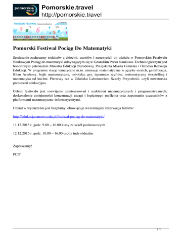 Pomorskie.travel http://pomorskie.travel Pomorski Festiwal Pociąg Do Matematyki Serdecznie zachęcamy rodziców z dziećmi, uczniów i nauczycieli do udziału w Pomorskim Festiwalu Naukowym Pociąg do matematyki odbywającym się w Gdańskim Parku Naukowo-Technologicznym pod honorowym patronatem Ministra Edukacji Narodowej, Prezydenta Miasta Gdańska i Ośrodka Rozwoju Edukacji. W programie stacje tematyczne m.in. animacje matematyczne w języku scratch, gamifikacja, Khan Academy, bajki matematyczne, robotyka, gry, tajemnice szyfrów, matematyczny storytelling i matematyka od kuchni. Pierwszy raz w Gdańsku Laboratorium Szkoły Przyszłości, czyli nowatorska przestrzeń edukacyjna. Celem festiwalu jest rozwijanie zainteresowań i uzdolnień matematycznych i programistycznych, doskonalenie umiejętności koncentracji uwagi i logicznego myślenia oraz zapoznanie uczestników z platformami matematyczno-informatycznymi. Udział w wydarzeniu jest bezpłatny, obowiązuje wcześniejsza rezerwacja biletów: http://edukacjananowo.edu.pl/festiwal-pociag-do-matematyki/ 11.12.2015 r. godz. 9.00 – 16.00 klasy ze szkół podstawowych 12.12.2015 r. godz. 10.00 – 16.00 osoby indywidualne Zapraszamy! PCIT 1/1 Powered by TCPDF (www.tcpdf.org)