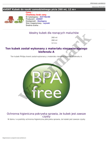 Informacje o produkcie Utworzono 09-03-2017 AVENT Kubek do nauki samodzielnego picia 260 ml, 12 m+ Cena : Chwilowy brak ceny Nr katalogowy : SCF782/00 Producent : AVENT Dostępność : Dostępny Stan magazynowy : wysoki Średnia ocena : Idealny kubek dla rosnących maluchów 260 ml er m ar k 260 ml 12 m+ Ten kubek został wykonany z materiału niezawierającego bisfenolu A w at Ten kubek Philips Avent został wykonany z materiału niezawierającego bisfenolu A. Ochronna higieniczna pokrywka sprawia, że kubek jest zawsze czysty W domu i w podróży ochronna higieniczna pokrywka sprawia, że kubek jest zawsze czysty Wygenerowano w programie www.oscGold.com er m ar k Uchwyty do nauki picia ułatwiają dziecku trzymanie kubka w at Uchwyty do nauki picia ułatwiają dziecku trzymanie kubka i samodzielne picie Picie z dowolnego miejsca wokół krawędzi kubka, podobnie jak w przypadku kubków dla dorosłych Ten kubek bez ustnika i słomki umożliwia picie z dowolnego miejsca wokół krawędzi, podobnie jak kubki dla dorosłych. Zachęca dziecko do nauki samodzielnego picia i zapobiega rozlewaniu Informacje o produkcie er m ar k . Uaktywniany ustami zawór zachęca do samodzielnego picia Wyjątkowy zawór to zupełna nowość opracowana przez ekspertów firmy Philips Avent. Zawór w at jest uaktywniany ustami, co ułatwia dziecku naukę samodzielnego picia . Specy fikacja techni czna Kraj pochodzeni a Chiny Zawór o szybkim wypływie umożliwia wygodne picie Dzięki zaworowi o szybkim wypływie dziecko może wygodnie pić i nie musi ssać z brzegu kubka Wygenerowano w programie www.oscGold.com Dane logistyczne er m ar k at w Wymiary Informacje o produkcie w at er m ar k 114 x 77 x 113 mm (dł. x szer. x wys.) mm Wygenerowano w programie www.oscGold.com Wymiary opakowania — wersja na rynek Unii w at er m ar k Europejskiej Informacje o produkcie w at er m ar k 114 x 85 x 177 mm (dł. x szer. x wys.) mm Wygenerowano w programie www.oscGold.com Wymiary opakowania — wersja na rynek w at er m ar k amerykański Informacje o produkcie 114 x 85 x 162 mm (dł. x szer. x wys.) mm w at er m ar k Etapy rozwoju Wygenerowano w programie www.oscGold.com Etapy 1 miesięcy + Zawartość zestawu 1 szt. Nakrętka z uchwytem 1 szt. System zaworu (3 części) 1 zestaw Instrukcja obsługi 1 szt. er m ar k Pojemnik Dostępne opcje AVENT Kubek do nauki samodzielnego picia 260 ml, 12 m+ w at » AVENT: SCF782 braz, SCF782 Zielony, SCF782 Czerwony.