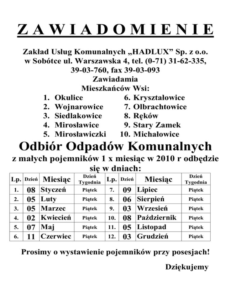 ZAWIADOMIENIE Zakład Usług Komunalnych „HADLUX” Sp. z o.o. w Sobótce ul. Warszawska 4, tel. (0-71) 31-62-335, 39-03-760, fax 39-03-093 Zawiadamia Mieszkańców Wsi: 6. Kryształowice 1. Okulice 2. Wojnarowice 7. Olbrachtowice 3. Siedlakowice 8. Ręków 4. Mirosławice 9. Stary Zamek 5. Mirosławiczki 10. Michałowice Odbiór Odpadów Komunalnych z małych pojemników 1 x miesiąc w 2010 r odbędzie się w dniach: Lp. Dzień Miesiąc Dzień Tygodnia Lp. Dzień 1. 08 05 05 02 07 11 Styczeń Luty Marzec Kwiecień Maj Czerwiec Piątek 7. Piątek 8. Piątek 9. Piątek 10. Piątek 11. Piątek 12. 09 06 03 08 05 03 2. 3. 4. 5. 6. Miesiąc Lipiec Sierpień Wrzesień Październik Listopad Grudzień Dzień Tygodnia Piątek Piątek Piątek Piątek Piątek Piątek Prosimy o wystawienie pojemników przy posesjach! Dziękujemy