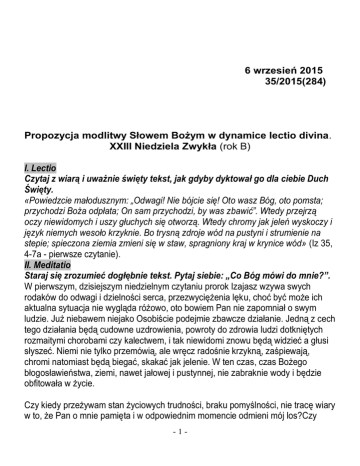 6 wrzesień 2015 35/2015(284) Propozycja modlitwy Słowem Bożym w dynamice lectio divina. XXIII Niedziela Zwykła (rok B) I. Lectio Czytaj z wiarą i uważnie święty tekst, jak gdyby dyktował go dla ciebie Duch Święty. «Powiedzcie małodusznym: „Odwagi! Nie bójcie się! Oto wasz Bóg, oto pomsta; przychodzi Boża odpłata; On sam przychodzi, by was zbawić”. Wtedy przejrzą oczy niewidomych i uszy głuchych się otworzą. Wtedy chromy jak jeleń wyskoczy i język niemych wesoło krzyknie. Bo trysną zdroje wód na pustyni i strumienie na stepie; spieczona ziemia zmieni się w staw, spragniony kraj w krynice wód» (Iz 35, 4-7a - pierwsze czytanie). II. Meditatio Staraj się zrozumieć dogłębnie tekst. Pytaj siebie: „Co Bóg mówi do mnie?”. W pierwszym, dzisiejszym niedzielnym czytaniu prorok Izajasz wzywa swych rodaków do odwagi i dzielności serca, przezwyciężenia lęku, choć być może ich aktualna sytuacja nie wygląda różowo, oto bowiem Pan nie zapomniał o swym ludzie. Już niebawem niejako Osobiście podejmie zbawcze działanie. Jedną z cech tego działania będą cudowne uzdrowienia, powroty do zdrowia ludzi dotkniętych rozmaitymi chorobami czy kalectwem, i tak niewidomi znowu będą widzieć a głusi słyszeć. Niemi nie tylko przemówią, ale wręcz radośnie krzykną, zaśpiewają, chromi natomiast będą biegać, skakać jak jelenie. W ten czas, czas Bożego błogosławieństwa, ziemi, nawet jałowej i pustynnej, nie zabraknie wody i będzie obfitowała w życie. Czy kiedy przeżywam stan życiowych trudności, braku pomyślności, nie tracę wiary w to, że Pan o mnie pamięta i w odpowiednim momencie odmieni mój los?Czy -1- staram się wobec Pana Boga być zawsze wielkoduszny, hojny, otwarty? Czy dziękuję Panu Bogu za dar wzroku, słuchu, mowy, zdrowych nóg i rąk? Czy z tych darów dobrze korzystam każdego dnia, przysparzając Bogu chwały a ludziom dobra i radości? Czy śpieszę z pomocą na miarę moich możliwości ludziom dotkniętym kalectwem, ludziom chorym? Czy nie usiłuję tych ludzi spychać na margines życia, ich nie dostrzegać, nie zauważać? Czy cenię sobie dar wody tej z kranu, tej w rzece czy jeziorze, tej źródlanej? Czy wodę umiem oszczędzać? Czy jej nie marnuję? Czy jeśli jest taka okazja, to pomagam materialnie krajom, w których organizacje charytatywne budują nowe studnie? Czy jestem wdzięczny Panu Bogu za wody chrztu, wody Bożego życia, w których kiedyś zostałem zanurzony? Czy to Boże życie od tamtej pory ciągle się we mnie rozwija? W modlitwie podziękuję Panu Bogu za dar wzroku, słuchu, mowy i inne. Będę prosił, abym używał ich dla Jego chwały i pożytkowi moich bliźnich. Podziękuję też za dar wody a w szczególny sposób za dar wody chrztu świętego. III. Oratio Teraz ty mów do Boga. Otwórz przed Bogiem serce, aby mówić Mu o przeżyciach, które rodzi w tobie słowo. Módl się prosto i spontanicznie – owocami wcześniejszej "lectio" i "meditatio". Pozwól Bogu zstąpić do serca i mów do Niego we własnym sercu. Wsłuchaj się w poruszenia własnego serca. Wyrażaj je szczerze przed Bogiem: uwielbiaj, dziękuj i proś. Może ci w tym pomóc modlitwa psalmu: Pan przywraca wzrok ociemniałym, Pan dźwiga poniżonych, Pan kocha sprawiedliwych, Pan strzeże przybyszów... (Ps 146, 8-9) IV. Contemplatio Trwaj przed Bogiem całym sobą. Módl się obecnością. Trwaj przy Bogu. Kontemplacja to czas bezsłownego westchnienia Ducha, ukojenia w Bogu. Rozmowa serca z sercem. Jest to godzina nawiedzenia Słowa. Powtarzaj w różnych porach dnia: Chwal, duszo moja, Pana, Stwórcę swego ! opracował: ks. Ryszard Stankiewicz SDS Centrum Formacji Duchowej, Salwatorianie - Kraków -2- OGŁOSZENIA DUSZPASTERSKIE XXIII NIEDZIELA ZWYKŁA – 6 września 2015 r. 1. W liturgii wspominamy: we wtorek: święto Narodzenia Najświętszej Maryi Panny 2. Nabożeństwa w naszym kościele:  w poniedziałek po Mszy Św. odmawiamy Litanię do św. Rafała Kalinowskiego  we wtorek przed Mszą Św. modlimy się Koronką do Miłosierdzia Bożego  w środę o godz. 17:40 Nowenna do M.B. Królowej Jezior Mazurskich  w czwartek po Mszy Św. Adoracja Najświętszego Sakramentu i Litania do św. Jana Pawła II 3. Porządek Mszy Św. w naszym kościele:  w niedzielę: 8:00, 10:00, 11:30 (szkolna) i 18:00  w dni powszednie: 18:00  w kaplicy w Gorazdowie: sobota 19:00 4. Pozostałe informacje:  W dzisiejszą niedzielę, 6 września, zapraszamy rodziców dzieci pierwszo komunijnych i dzieci, które będą obchodzić rocznicę Komunii Św., na spotkanie po Mszy Św. o godzinie 11:30.  Katecheza dla dorosłych w piątek po Mszy Św. wieczornej.  Za tydzień ofiary do puszek – na fundusz zakonu kontemplacyjnego Sióstr Karmelitanek Bosych w Ełku. Życzymy parafianom i gościom naszej parafii Bożego błogosławieństwa w nowym tygodniu! -3-  INTENCJE MSZALNE  7 września 18:00 Poniedziałek 8 września Wtorek 18:00 9 września Środa 18.00 W int. śp. StanisławaSzyrwińskiego (7 roczn. śm.) i zmarłych rodziców: Stanisława i Michaliny 10 września Czwartek 18.00 11 września Piątek 18.00 12 września Sobota 18.00 13 września Niedziela 8:00 W int. śp. Kazimierza Olszewskiego, zmarłych z rodziny i zmarłych dziadków 10:00 W int. śp. Józefa, Justyny i Henryka 11:30 W int. śp. Edwarda w 34 rocznicę śmierci i śp. Anny 19.30 ŻYCIE BEZ CELU JEST BŁĄDZENIEM. Seneka Gazetka Parafii św. Rafała Kalinowskiego w Wilkasach E-mail: [email protected] strona internetowa: www.parafiawilkasy.pl Redakcja nie zwraca niezamówionych tekstów oraz zastrzega sobie prawo dokonywania skrótów w nadesłanych materiałach. -4-