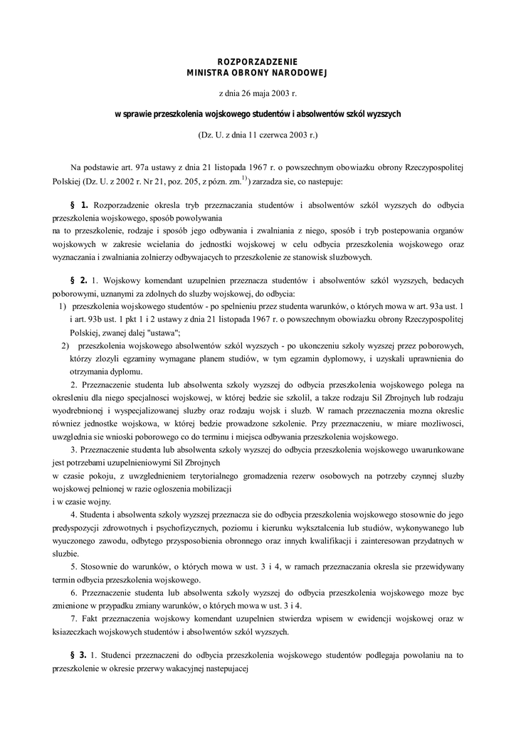 ROZPORZADZENIE MINISTRA OBRONY NARODOWEJ z dnia 26 maja 2003 r. w sprawie przeszkolenia wojskowego studentów i absolwentów szkól wyzszych (Dz. U. z dnia 11 czerwca 2003 r.) Na podstawie art. 97a ustawy z dnia 21 listopada 1967 r. o powszechnym obowiazku obrony Rzeczypospolitej Polskiej (Dz. U. z 2002 r. Nr 21, poz. 205, z pózn. zm.1) ) zarzadza sie, co nastepuje: § 1. Rozporzadzenie okresla tryb przeznaczania studentów i absolwentów szkól wyzszych do odbycia przeszkolenia wojskowego, sposób powolywania na to przeszkolenie, rodzaje i sposób jego odbywania i zwalniania z niego, sposób i tryb postepowania organów wo jskowych w zakresie wcielania do jednostki wojskowej w celu odbycia przeszkolenia wojskowego oraz wyznaczania i zwalniania zolnierzy odbywajacych to przeszkolenie ze stanowisk sluzbowych. § 2. 1. Wojskowy komendant uzupelnien przeznacza studentów i absolwentów szkól wyzszych, bedacych poborowymi, uznanymi za zdolnych do sluzby wojskowej, do odbycia: 1) przeszkolenia woj skowego studentów - po spelnieniu przez studenta warunków, o których mowa w art. 93a ust. 1 i art. 93b ust. 1 pkt 1 i 2 ustawy z dnia 21 listopada 1967 r. o powszechnym obowiazku obrony Rzeczypospolitej Polskiej, zwanej dalej "ustawa"; 2) przeszkolenia wojskowego absolwentów szkól wyzszych - po ukonczeniu szkoly wyzszej przez poborowych, którzy zlozyli egzaminy wymagane planem studiów, w tym egzamin dyplomowy, i uzyskali uprawnienia do otrzymania dyplomu. 2. Przeznaczenie studenta lub absolwenta szkoly wyzszej do odbycia przeszkolenia wojskowego polega na okresleniu dla niego specjalnosci wojskowej, w której bedzie sie szkolil, a takze rodzaju Sil Zbrojnych lub rodzaju wyodrebnionej i wyspecjalizowanej sluzby oraz rodzaju wojsk i sluzb. W ramach przeznaczenia mozna okreslic równiez jednostke wojskowa, w której bedzie prowadzone szkolenie. Przy przeznaczeniu, w miare mozliwosci, uwzglednia sie wnioski poborowego co do terminu i miejsca odbywania przeszkolenia wojskowego. 3. Przeznaczenie studenta lub absolwenta szkoly wyzszej do odbycia przeszkolenia wojskowego uwarunkowane jest potrzebami uzupelnieniowymi Sil Zbrojnych w czasie pokoju, z uwzglednieniem terytorialnego gromadzenia rezerw osobowych na potrzeby czynnej sluzby wo jskowej pelnionej w razie ogloszenia mobilizacji i w czasie woj ny. 4. Studenta i absolwenta szkoly wyzszej przeznacza sie do odbycia przeszkolenia wojskowego stosownie do jego predyspozycji zdrowotnych i psychofizycznych, poziomu i kierunku wyksztalcenia lub studiów, wykonywanego lub wyuczonego zawodu, odbytego przysposobienia obronnego oraz innych kwalifikacji i zainteresowan przydatnych w sluzbie. 5. Stosownie do warunków, o których mowa w ust. 3 i 4, w ramach przeznaczania okresla sie przewidywany termin odbycia przeszkolenia woj skowego. 6. Przeznaczenie studenta lub absolwenta szkoly wyzszej do odbycia przeszkolenia wojskowego moze byc zmienione w przypadku zmiany warunków, o których mowa w ust. 3 i 4. 7. Fakt przeznaczenia wojskowy komendant uzupelnien stwierdza wpisem w ewidencji wojskowej oraz w ksiazeczkach wojskowych studentów i absolwentów szkól wyzszych. § 3. 1. Studenci przeznaczeni do odbycia przeszkolenia wojskowego studentów podlegaja powolaniu na to przeszkolenie w okresie przerwy wakacyjnej nastepujacej po drugim roku studiów wyzszych zawodowych oraz po trzecim roku jednolitych studiów magisterskich lub równorzednych. 2. Absolwenci szkól wyzszych przeznaczeni do odbycia przeszkolenia wo jskowego podlegaja powolaniu na to przeszkolenie w terminie okreslonym w art. 93 ust. 2 ustawy. 3. Do odbycia przeszkolenia wojskowego, o którym mowa w ust. 1 i 2, nie powoluje sie poborowych wymienionych w art. 44 ust. 1 ustawy oraz w przypadku okreslonym w art. 190 ust. 2 ustawy, a takze poborowych, którzy: 1) korzystaja z odroczenia czynnej sluzby wojskowej ; 2) sa tymczasowo aresztowani lub odbywaja kare pozbawienia wolnosci (aresztu), w tym zastepcza kare pozbawienia wolnosci (aresztu), albo jest wobec nich wykonywany srodek karny - pozbawienia praw publicznych. 4. Do odbycia przeszkolenia wojskowego - na wniosek poborowego - nie powoluje sie poborowego, którego rodzic lub brat (siostra) w czasie odbywania czynnej sluzby wo jskowej ulegl wypadkowi, w wyniku którego poniósl smierc albo doznal trwalego kalectwa i zostal uznany za calkowicie niezdolnego do pracy oraz samodzielnej egzystencji. 5. W przypadku zlozenia przez studenta wniosku, o którym mowa w art. 93b ust. 1 pkt 2 ustawy, odpowiednio powiatowa komisja poborowa lub wojskowy komendant uzupelnien uchyla orzeczenie o odroczeniu zasadniczej sluzby wo jskowej. 6. Wzór wniosku, o którym mowa w art. 93b ust. 1 pkt 2 ustawy, okresla zalacznik do rozporzadzenia. § 4. 1. Karte powolania do odbycia przeszkolenia wojskowego dorecza sie nie wczesniej niz na 90 dni i nie pózniej niz na 14 dni przed terminem stawienia sie do czynnej sluzby wojskowej, okreslonym w tej karcie. 2. Terminów, o których mowa w ust. 1, nie stosuje sie do osób, które bez uzasadnionej przyczyny: 1) nie spelnily wojskowego obowiazku meldunkowego; 2) nie stawily sie do rejestracji lub poboru w terminie okreslonym w odrebnych przepisach; 3) nie zglosily sie na wezwanie wo jskowego komendanta uzupelnien w sprawach powszechnego obowiazku obrony. 3. W przypadkach, o których mowa w ust. 2, karta powolania moze byc doreczona w kazdym terminie, nie pózniej jednak niz w okreslonym w niej terminie stawienia sie do czynnej sluzby wojskowej. 4. Za zgoda lub na wniosek poborowego doreczenie karty powolania moze nastapic w innym terminie, niz okreslono w ust. 1. § 5. 1. W przypadku gdy osoba, której doreczono karte powolania, nie moze z powodu obloznej choroby stawic sie do odbycia przeszkolenia wojskowego w terminie okreslonym w tej karcie, niezwlocznie zawiadamia o tym fakcie wo jskowego komendanta uzupelnien. Po ustaniu choroby osoba, której doreczono karte powolania, niezwlocznie zglasza sie do woj skowego komendanta uzu