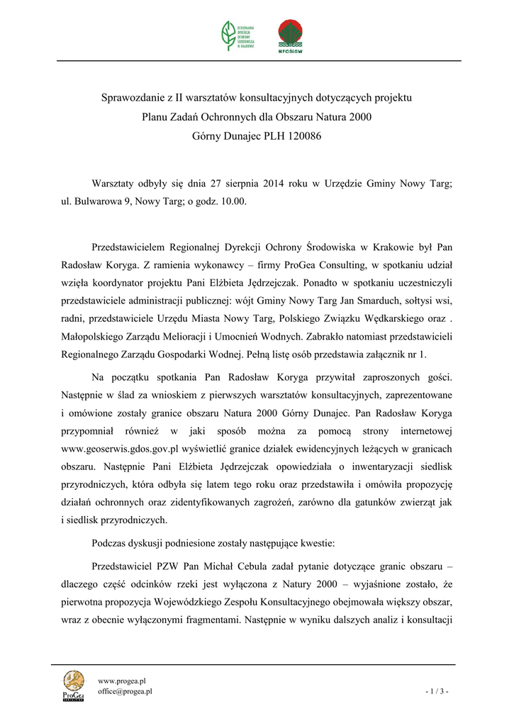 Sprawozdanie z II warsztatów konsultacyjnych dotyczących projektu Planu Zadań Ochronnych dla Obszaru Natura 2000 Górny Dunajec PLH 120086 Warsztaty odbyły się dnia 27 sierpnia 2014 roku w Urzędzie Gminy Nowy Targ; ul. Bulwarowa 9, Nowy Targ; o godz. 10.00. Przedstawicielem Regionalnej Dyrekcji Ochrony Środowiska w Krakowie był Pan Radosław Koryga. Z ramienia wykonawcy – firmy ProGea Consulting, w spotkaniu udział wzięła koordynator projektu Pani Elżbieta Jędrzejczak. Ponadto w spotkaniu uczestniczyli przedstawiciele administracji publicznej: wójt Gminy Nowy Targ Jan Smarduch, sołtysi wsi, radni, przedstawiciele Urzędu Miasta Nowy Targ, Polskiego Związku Wędkarskiego oraz . Małopolskiego Zarządu Melioracji i Umocnień Wodnych. Zabrakło natomiast przedstawicieli Regionalnego Zarządu Gospodarki Wodnej. Pełną listę osób przedstawia załącznik nr 1. Na początku spotkania Pan Radosław Koryga przywitał zaproszonych gości. Następnie w ślad za wnioskiem z pierwszych warsztatów konsultacyjnych, zaprezentowane i omówione zostały granice obszaru Natura 2000 Górny Dunajec. Pan Radosław Koryga przypomniał również w jaki sposób można za pomocą strony internetowej www.geoserwis.gdos.gov.pl wyświetlić granice działek ewidencyjnych leżących w granicach obszaru. Następnie Pani Elżbieta Jędrzejczak opowiedziała o inwentaryzacji siedlisk przyrodniczych, która odbyła się latem tego roku oraz przedstawiła i omówiła propozycję działań ochronnych oraz zidentyfikowanych zagrożeń, zarówno dla gatunków zwierząt jak i siedlisk przyrodniczych. Podczas dyskusji podniesione zostały następujące kwestie: Przedstawiciel PZW Pan Michał Cebula zadał pytanie dotyczące granic obszaru – dlaczego część odcinków rzeki jest wyłączona z Natury 2000 – wyjaśnione zostało, że pierwotna propozycja Wojewódzkiego Zespołu Konsultacyjnego obejmowała większy obszar, wraz z obecnie wyłączonymi fragmentami. Następnie w wyniku dalszych analiz i konsultacji www.progea.pl [email protected] -1/3- część odcinków została usunięta z obszaru głównie z uwagi na obecność dużych skupisk ludzkich w bezpośrednim otoczeniu koryta. Mieszkańcy wyrazili również obawy czy w związku z wyznaczeniem chronionych siedlisk przyrodniczych w niedalekiej odległości od domów, nie zajdzie potrzeba ochrony przyrody kosztem zdrowia i życia ludzkiego. Pani Elżbieta Jędrzejczak wyjaśniła, że w myśl zasady nadrzędnego interesu publicznego zawartej m.in. w ustawie o ochronie przyrody z dnia 16 kwietnia 2004 r., nie jest możliwe stawianie ochrony siedliska przyrodniczego ponad ochroną ludzkiego zdrowia. W związku z powyższym, istniejące zabudowania z pewnością będą podlegać ochronie przeciwpowodziowej, jednakże zasada ta raczej nie będzie mieć zastosowania w odniesieniu do gruntów rolnych. Pan Gabriel Szumal zwrócił się z pytaniem, czy zaplanowane działania ochronne będą dotyczyć również płatów siedlisk poza granicami obszaru Natura 2000. Pani Elżbieta Jędrzejczak wyjaśniła, że zadania ochronne w Planie Zadań Ochronnych mogą się odnosić wyłącznie do terenu wewnątrz granic obszaru. Niemniej, z uwagi na obecność zwartych kompleksów łęgowych, wskazane byłoby prowadzenie podobnych działań na powierzchni całego wyznaczonego siedliska. Padło również pytanie, co wówczas gdy w wyniku zalewów jakieś siedlisko przestanie istnieć lub też przeniesie się w inne miejsce – wyjaśniono, że specyfiką tego typu siedlisk jest właśnie nieustanne zanikanie i odtwarzanie się na nowo. Istotne jest aby ten naturalny rytm pozostał niezmieniony, a dokładna lokalizacja płatu siedliska nie ma większego znaczenia. Pan Dariusz Jabcoń z Urzędu Miasta Nowy Targ zwrócił uwagę na kilka kwestii. Podkreślił, że obecnie jest już realizowane zadanie usuwania roślin inwazyjnych w ramach projektu „Środowisko bez barszczu Sosnowskiego (Heracleum sosnowskyi Manden.)” w związku z czym dobrze aby tak informacja znalazła się w dokumentacji PZO. Ponadto podmiotem odpowiedzialnym za kontrolę nielegalnego poboru żwiru powinien zostać RZGW, podobnie w przypadku usuwania odpadów z koryta rzeki, gdyż zadania takie nie leżą w kompetencji Urzędu Miasta ani Urzędu Gminy. Zawnioskował również o zmianę nazwy „śmieci” na „odpady” – zgodnie z nomenklaturą stosowaną w aktach prawnych. Pani Elżbieta Jędrzejczak zadeklarowała, że wszystkie powyższe zmiany zostaną wprowadzone do dokumentacji. Wójt Gminy Nowy Targ, zawnioskował o przesłanie na adres gminy dokumentacji jaka została opracowana na potrzeby Planu Zadań Ochronnych dla obszaru Natura 2000 www.progea.pl [email protected] -2/3- „Dolina Białki” – Pan Radosław Koryga zapewnił, że dokumenty zostaną przesłane. Ponadto Pan Jan Smarduch wyraził opinię, iż małe budowle hydrotechniczne wyposażone w przepławki, nie stanowią zagrożenia dla zdrowych ryb, dlatego też nie powinno być zakazu stawiania takich obiektów na terenie obszaru. Podkreślił, że tego typu budowle były na rzekach od lat i nie szkodziły populacjom ryb. Zaznaczył też, że wywóz żwiru z jakim mamy do czynienia na tych terenach nie stanowi istotnego zagrożenia ze względu na małą skalę zjawiska. Wnioskował również, wraz z radnymi gminy i sołtysami wsi, aby była możliwość przepychania żwiru w przypadku zmiany biegu koryta rzeki po większych wezbraniach. Jako że powyższe uwagi stoją w opozycji do ustaleń ekspertów przyrodników z pewnością będą szczegółowiej dyskutowane w czasie następnego spotkania. Sołtys wsi Ludźmierz, Pan Władysław Łapczyński, zwrócił uwagę na problem bezpańskich psów. Radosław Koryga wyjaśnił, że w ramach PZO dla obszaru Natura 2000 możemy zapisywać działania mające na celu ochronę wyłącznie ustanowionych przedmiotów ochrony. Z uwagi na specyficzny charakter obszaru Górny Dunajec, cię