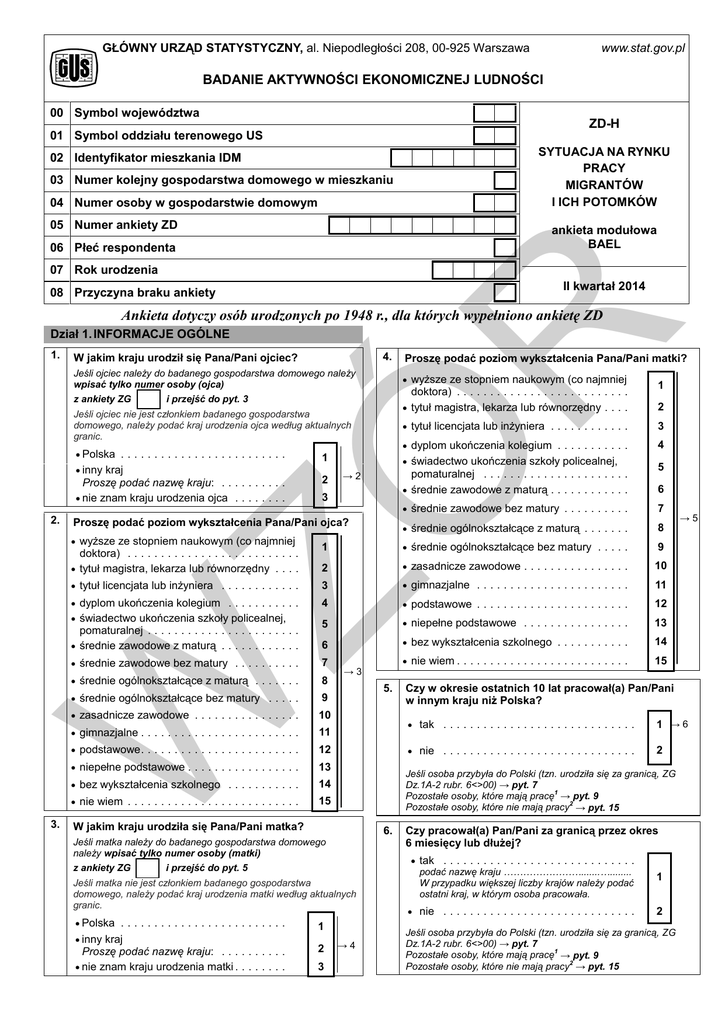 GŁÓWNY URZĄD STATYSTYCZNY, al. Niepodległości 208, 00-925 Warszawa www.stat.gov.pl BADANIE AKTYWNOŚCI EKONOMICZNEJ LUDNOŚCI 00 Symbol województwa ZD-H 01 Symbol oddziału terenowego US SYTUACJA NA RYNKU PRACY MIGRANTÓW I ICH POTOMKÓW 02 Identyfikator mieszkania IDM 03 Numer kolejny gospodarstwa domowego w mieszkaniu 04 Numer osoby w gospodarstwie domowym 05 Numer ankiety ZD ankieta modułowa BAEL 06 Płeć respondenta 07 Rok urodzenia II kwartał 2014 08 Przyczyna braku ankiety R Ankieta dotyczy osób urodzonych po 1948 r., dla których wypełniono ankietę ZD Dział 1. INFORMACJE OGÓLNE 1. 4. W jakim kraju urodził się Pana/Pani ojciec? Jeśli ojciec należy do badanego gospodarstwa domowego należy wpisać tylko numer osoby (ojca) z ankiety ZG i przejść do pyt. 3 • wyższe ze stopniem naukowym (co najmniej doktora) . . . . . . . . . . . . . . . . . . . . . . . . . . • tytuł magistra, lekarza lub równorzędny . . . . • Polska . . . . . . . . . . . . . . . . . . . . . . . . . • inny kraj Proszę podać nazwę kraju: . . . . . . . . . . • nie znam kraju urodzenia ojca . . . . . . . . 2 • dyplom ukończenia kolegium . . . . . . . . . . . 4 pomaturalnej . . . . . . . . . . . . . . . . . . . . . . • średnie zawodowe z maturą . . . . . . . . . . . . →2 3 2 3 • świadectwo ukończenia szkoły policealnej, 5 6 • średnie zawodowe bez matury . . . . . . . . . . 7 • średnie ogólnokształcące z maturą . . . . . . . 8 1 • średnie ogólnokształcące bez matury . . . . . 9 2 • zasadnicze zawodowe . . . . . . . . . . . . . . . . 10 • tytuł licencjata lub inżyniera . . . . . . . . . . . . 3 • gimnazjalne . . . . . . . . . . . . . . . . . . . . . . . 11 • dyplom ukończenia kolegium . . . . . . . . . . . 4 • podstawowe . . . . . . . . . . . . . . . . . . . . . . . 12 5 • niepełne podstawowe . . . . . . . . . . . . . . . . 13 6 • bez wykształcenia szkolnego . . . . . . . . . . . 14 • nie wiem . . . . . . . . . . . . . . . . . . . . . . . . . . 15 Proszę podać poziom wykształcenia Pana/Pani ojca? • wyższe ze stopniem naukowym (co najmniej doktora) . . . . . . . . . . . . . . . . . . . . . . . . . . • tytuł magistra, lekarza lub równorzędny . . . . • świadectwo ukończenia szkoły policealnej, pomaturalnej . . . . . . . . . . . . . . . . . . . . . . . • średnie zawodowe z maturą . . . . . . . . . . . . • średnie zawodowe bez matury . . . . . . . . . . 7 • średnie ogólnokształcące z maturą . . . . . . . 8 • średnie ogólnokształcące bez matury . . . . . 9 • zasadnicze zawodowe . . . . . . . . . . . . . . . . 10 • gimnazjalne . . . . . . . . . . . . . . . . . . . . . . . . 11 • podstawowe . . . . . . . . . . . . . . . . . . . . . . . . 12 • niepełne podstawowe . . . . . . . . . . . . . . . . . 13 • bez wykształcenia szkolnego . . . . . . . . . . . 14 • nie wiem . . . . . . . . . . . . . . . . . . . . . . . . . . 15 W 3. 1 1 • tytuł licencjata lub inżyniera . . . . . . . . . . . . ZÓ Jeśli ojciec nie jest członkiem badanego gospodarstwa domowego, należy podać kraj urodzenia ojca według aktualnych granic. 2. Proszę podać poziom wykształcenia Pana/Pani matki? →3 5. 6. Jeśli matka należy do badanego gospodarstwa domowego należy wpisać tylko numer osoby (matki) z ankiety ZG i przejść do pyt. 5 Jeśli matka nie jest członkiem badanego gospodarstwa domowego, należy podać kraj urodzenia matki według aktualnych granic. • Polska . . . . . . . . . . . . . . . . . . . . . . . . . • inny kraj 1 Proszę podać nazwę kraju: . . . . . . . . . . 2 • nie znam kraju urodzenia matki . . . . . . . . 3 Czy w okresie ostatnich 10 lat pracował(a) Pan/Pani w innym kraju niż Polska? • tak . . . . . . . . . . . . . . . . . . . . . . . . . . . . . 1 →6 • nie . . . . . . . . . . . . . . . . . . . . . . . . . . . . . 2 Jeśli osoba przybyła do Polski (tzn. urodziła się za granicą, ZG Dz.1A-2 rubr. 6<>00) → pyt. 7 Pozostałe osoby, które mają pracę1 → pyt. 9 Pozostałe osoby, które nie mają pracy2 → pyt. 15 W jakim kraju urodziła się Pana/Pani matka? →4 →5 Czy pracował(a) Pan/Pani za granicą przez okres 6 miesięcy lub dłużej? • tak . . . . . . . . . . . . . . . . . . . . . . . . . . . . . podać nazwę kraju …………………….......…........ W przypadku większej liczby krajów należy podać ostatni kraj, w którym osoba pracowała. 1 • nie . . . . . . . . . . . . . . . . . . . . . . . . . . . . . 2 Jeśli osoba przybyła do Polski (tzn. urodziła się za granicą, ZG Dz.1A-2 rubr. 6<>00) → pyt. 7 Pozostałe osoby, które mają pracę1 → pyt. 9 Pozostałe osoby, które nie mają pracy2 → pyt. 15 7. Jaki były przyczyny (ostatniego) przyjazdu Pana/Pani do Polski? Można podać więcej niż jedną przyczynę • praca . . . . . . . . . . . . . . . . . . . . . . . . . . . 1 • sprawy rodzinne, w tym połączenie rodziny 2 • nauka, studia . . . . . . . . . . . . . . . . . . . . . . 3 • ochrona międzynarodowa . . . . . . . . . . . . 4 • inne przyczyny (pobyty turystyczno- wypoczynkowe, służbowe itp.) . . . . . . . . . 5 Jeżeli zaznaczono więcej niż jedną przyczynę należy dopytać o główną przyczynę przyjazdu do Polski i wpisać jej symbol. Jeśli zaznaczono odp. 1 (niezależnie od tego, co wpisano jako symbol przyczyny głównej)→ pyt.8 Jeśli zaznaczono odp. 2-5 i osoba obecnie ma pracę1→ pyt. 9 Jeśli zaznaczono odp. 2-5 i osoba obecnie nie ma pracy2 → pyt. 10b Czy przed przyjazdem miał(a) Pan/Pani zapewnioną pracę lub ofertę pracy w Polsce? • tak . . . . . . . . . . . . . . . . . . . . . . . . . . . . . . 1 • nie . . . . . . . . . . . . . . . . . . . . . . . . . . . . . . 2 Jeśli osoba obecnie ma pracę1→ pyt. 9 Jeśli osoba obecnie nie ma pracy2 → pyt. 10b Dział 2. FUNKCJONOWANIE NA RYNKU PRACY • brak uznawania kwalifikacji uzyskanych za granicą . . . . . . . . . . . . . . . . . . . . . . . . . . 