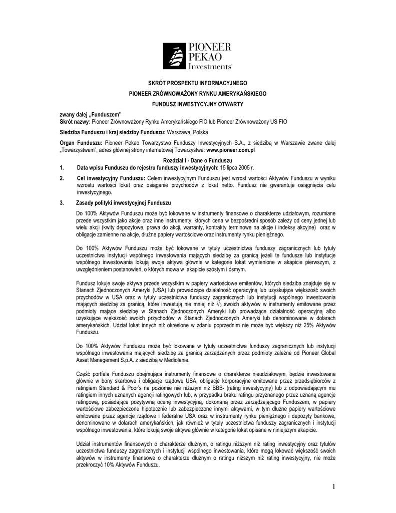 SKRÓT PROSPEKTU INFORMACYJNEGO PIONEER ZRÓWNOWAŻONY RYNKU AMERYKAŃSKIEGO FUNDUSZ INWESTYCYJNY OTWARTY zwany dalej „Funduszem” Skrót nazwy: Pioneer Zrównoważony Rynku Amerykańskiego FIO lub Pioneer Zrównoważony US FIO Siedziba Funduszu i kraj siedziby Funduszu: Warszawa, Polska Organ Funduszu: Pioneer Pekao Towarzystwo Funduszy Inwestycyjnych S.A., z siedzibą w Warszawie zwane dalej „Towarzystwem”, adres głównej strony internetowej Towarzystwa: www.pioneer.com.pl 1. Rozdział I - Dane o Funduszu Data wpisu Funduszu do rejestru funduszy inwestycyjnych: 15 lipca 2005 r. 2. Cel inwestycyjny Funduszu: Celem inwestycyjnym Funduszu jest wzrost wartości Aktywów Funduszu w wyniku wzrostu wartości lokat oraz osiąganie przychodów z lokat netto. Fundusz nie gwarantuje osiągnięcia celu inwestycyjnego. 3. Zasady polityki inwestycyjnej Funduszu Do 100% Aktywów Funduszu może być lokowane w instrumenty finansowe o charakterze udziałowym, rozumiane przede wszystkim jako akcje oraz inne instrumenty, których cena w bezpośredni sposób zależy od ceny jednej lub wielu akcji (kwity depozytowe, prawa do akcji, warranty, kontrakty terminowe na akcje i indeksy akcyjne) oraz w obligacje zamienne na akcje, dłużne papiery wartościowe oraz instrumenty rynku pieniężnego. Do 100% Aktywów Funduszu może być lokowane w tytuły uczestnictwa funduszy zagranicznych lub tytuły uczestnictwa instytucji wspólnego inwestowania mających siedzibę za granicą jeżeli te fundusze lub instytucje wspólnego inwestowania lokują swoje aktywa głównie w kategorie lokat wymienione w akapicie pierwszym, z uwzględnieniem postanowień, o których mowa w akapicie szóstym i ósmym. Fundusz lokuje swoje aktywa przede wszystkim w papiery wartościowe emitentów, których siedziba znajduje się w Stanach Zjednoczonych Ameryki (USA) lub prowadzące działalność operacyjną lub uzyskujące większość swoich przychodów w USA oraz w tytuły uczestnictwa funduszy zagranicznych lub instytucji wspólnego inwestowania mających siedzibę za granicą, które inwestują nie mniej niż 2/3 swoich aktywów w instrumenty emitowane przez podmioty mające siedzibę w Stanach Zjednoczonych Ameryki lub prowadzące działalność operacyjną albo uzyskujące większość swoich przychodów w Stanach Zjednoczonych Ameryki lub denominowane w dolarach amerykańskich. Udział lokat innych niż określone w zdaniu poprzednim nie może być większy niż 25% Aktywów Funduszu. Do 100% Aktywów Funduszu może być lokowane w tytuły uczestnictwa funduszy zagranicznych lub instytucji wspólnego inwestowania mających siedzibę za granicą zarządzanych przez podmioty zależne od Pioneer Global Asset Management S.p.A. z siedzibą w Mediolanie. Część portfela Funduszu obejmująca instrumenty finansowe o charakterze nieudziałowym, będzie inwestowana głównie w bony skarbowe i obligacje rządowe USA, obligacje korporacyjne emitowane przez przedsiębiorców z ratingiem Standard & Poor’s na poziomie nie niższym niż BBB- (rating inwestycyjny) lub z odpowiadającym mu ratingiem innych uznanych agencji ratingowych lub, w przypadku braku ratingu przyznanego przez uznaną agencje ratingową, posiadające pozytywną ocenę inwestycyjną, dokonaną przez zarządzającego Funduszem, w papiery wartościowe zabezpieczone hipotecznie lub zabezpieczone innymi aktywami, w tym dłużne papiery wartościowe emitowane przez agencje rządowe i federalne USA oraz w instrumenty rynku pieniężnego i depozyty bankowe, denominowane w dolarach amerykańskich, jak również w tytuły uczestnictwa funduszy zagranicznych i instytucji wspólnego inwestowania, które lokują swoje aktywa głównie w kategorie lokat opisane w niniejszym akapicie. Udział instrumentów finansowych o charakterze dłużnym, o ratingu niższym niż rating inwestycyjny oraz tytułów uczestnictwa funduszy zagranicznych i instytucji wspólnego inwestowania, które mogą lokować większość swoich aktywów w instrumenty finansowe o charakterze dłużnym o ratingu niższym niż rating inwestycyjny, nie może przekroczyć 10% Aktywów Funduszu. 1 W celu zapewnienia odpowiedniej płynności Aktywów Funduszu, do 20% wartości Aktywów Funduszu może być lokowane w instrumenty finansowe o charakterze dłużnym emitowane, poręczane lub gwarantowane przez Skarb Państwa Rzeczpospolitej Polskiej oraz przez inne Państwa Członkowskie, a także w dopuszczone do obrotu zorganizowanego lub będące w ofercie publicznej na terytorium Rzeczpospolitej Polskiej lub innego Państwa Członkowskiego instrumenty finansowe o charakterze dłużnym emitowane przez innych emitentów posiadających rating Standard & Poor’s na poziomie nie niższym niż BBB- lub odpowiadający mu rating innych uznanych agencji ratingowych lub, w przypadku braku ratingu przyznanego przez uznaną agencję ratingową, posiadających pozytywną ocenę inwestycyjną dokonaną przez zarządzającego Funduszem, oraz instrumenty rynku pieniężnego posiadające rating krótkoterminowy wydany przez Standard & Poor’s nie niższy niż A3 lub odpowiadający mu rating innych uznanych agencji ratingowych lub, w przypadku braku ratingu przyznanego przez uznaną agencję ratingową, posiadające pozytywną ocenę inwestycyjną, dokonaną przez zarządzającego Funduszem, a także w depozyty bankowe. Całkowita wartość lokat w instrumenty finansowe o charakterze udziałowym, w tym w tytuły uczestnictwa funduszy zagranicznych i instytucji wspólnego inwestowania o charakterze akcyjnym nie będzie większa niż 65% Aktywów Funduszu. Uznaje się, że fundusze zagraniczne i instytucje wspólnego inwestowania mają charakter akcyjny, jeśli polityka inwestycyjna tych funduszy zezwala na lokowanie nie mniej niż 2/3 aktywów w instrumenty o charakterze udziałowym, rozumiane przede wszystkim jako akcje oraz inne instrumenty, których cena zależy od ceny jednej lub wielu akcji (np. kwity depozytowe, prawa do akcji, 