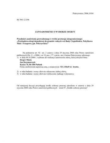 Pokrzywnica, 2006.10.04 RI.7041-2/2/06 ZAWIADOMIENIE O WYBORZE OFERTY Przedmiot zamówienia prowadzonego w trybie przetargu nieograniczonego: „Przebudowa drogi dojazdowej do gruntów rolnych wsi Budy Ciepielińskie, Pobyłkowo Małe i Trzepowo, gm. Pokrzywnica” Na podstawie art. 92 ust. 2 ustawy z dnia 29 stycznia 2004 roku Prawo zamówień publicznych (Dz. U. z 2004 r. nr 19, poz. 177 z późn. zm.) Gmina Pokrzywnica informuje: 1) w dniu 04.10.2006 r. wybrano do realizacji zamówienia ofertę, którą złożyła Firma : Drogi i Mosty Jan Kaczmarczyk Kacice 76, 06-100 Pułtusk Firma zaoferowała najniższą cenę, a mianowicie: 521.130,69 zł. brutto. 2) w toku badania i oceny ofert nie odrzucono żadnej oferty, 3) w toku badania i oceny ofert nie wykluczono żadnego wykonawcy. Od niniejszej decyzji przysługują środki ochrony prawnej określone w ustawie z dnia 29 stycznia 2004 roku Prawo zamówień publicznych – dział IV „Środki ochrony prawnej”.