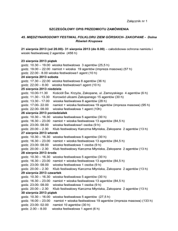 Załącznik nr 1 SZCZEGÓŁOWY OPIS PRZEDMIOTU ZAMÓWIENIA 45. MIĘDZYNARODOWY FESTIWAL FOLKLORU ZIEM GÓRSKICH- ZAKOPANE - Dolna Rówień Krupowa 21 sierpnia 2013 (od 20.00)- 31 sierpnia 2013 (do 8.00) – całodobowa ochrona namiotu i wioski festiwalowej 2 agentów (456 h) 23 sierpnia 2013 piątek godz. 10.30 – 19.00 wioska festiwalowa 3 agentów (25,5 h) godz. 19.00 – 22.00 namiot + wioska 19 agentów (impreza masowa) (57 h) godz. 22.00 - 8.00 wioska festiwalowa1 agent (10 h) 24 sierpnia 2013 sobota godz. 17.30 – 22.00 wioska festiwalowa 8 agentów (36 h) godz. 22.00 – 8.00 wioska festiwalowa1 agent (10 h) 25 sierpnia 2013 niedziela godz. 10.00-11.30 Kościół Św. Krzyża, Zakopane, ul. Zamoyskiego 4 agentów (6 h) godz. 11.30 - 13.30 Korowód ulicami Zakopanego 15 agentów (30 h) godz. 13.30 - 17.00 wioska festiwalowa 8 agentów (28 h) godz. 17.00- 22.00 namiot + wioska festiwalowa 19 agentów (impreza masowa) (95 h) godz. 22.00- 08.00 wioska festiwalowa 1 agent (10h) 26 sierpnia 2013 poniedziałek godz. 10.30 – 16.30 wioska festiwalowa 5 agentów (30 h) godz. 16.30 – 23.00 namiot + wioska festiwalowa 13 agentów (84,5 h) godz. 23.00- 08.00 wioska festiwalowa1 osoba (9 h) godz. 20.00 – 2.30 Klub festiwalowy Karczma Młyniska, Zakopane 2 agentów (13 h) 27 sierpnia 2013 wtorek godz. 10.30 – 16.30 wioska festiwalowa 5 agentów (30 h) godz. 16.30 – 23.00 namiot + wioska festiwalowa 13 agentów (84,5 h) godz. 23.00- 08.00 wioska festiwalowa 1 osoba (9 h) godz. 20.00 – 2.30 Klub festiwalowy Karczma Młyniska, Zakopane 2 agentów (13 h) 28 sierpnia 2013 środa godz. 10.30 – 16.30 wioska festiwalowa 5 agentów (30 h) godz. 16.30 – 23.00 namiot + wioska festiwalowa 13 agentów (84,5 h) godz. 23.00- 08.00 wioska festiwalowa 1 osoba (9 h) godz. 20.00 – 2.30 Klub festiwalowy Karczma Młyniska, Zakopane 2 agentów (13 h) 29 sierpnia 2013 czwartek godz. 10.30 – 16.30 wioska festiwalowa 5 agentów (30 h) godz. 16.30 – 23.00 namiot + wioska festiwalowa 13 agentów (84,5 h) godz. 23.00- 08.00 wioska festiwalowa 1 osoba (9 h) godz. 20.00 – 2.30 Klub festiwalowy Karczma Młyniska, Zakopane 2 agentów (13 h) 30 sierpnia 2013 piątek godz. 10.30 – 16.00 wioska festiwalowa 5 agentów (27,5 h) godz. 16.00 – 23.00 namiot + wioska festiwalowa 19 agentów (impreza masowa) (133 h) godz. 23.00- 02.00 namiot 10 agentów (30 h) godz. 2.00 – 8.00 wioska festiwalowa 1 agent (6 h) Uwaga! 1. Zamawiający informuje, że podane powyżej roboczo-godziny agentów ochrony są wyliczone w sposób szacunkowy i w trakcie realizacji przedmiotowej umowy mogą ulec zmianie. 2. Aktualne zapotrzebowanie na pracę agentów ochrony i podanie liczby agentów ochrony nastąpi w formie pisemnej (faxem lub drogą elektroniczną) nie później niż na 5 dni przed dniem rozpoczęcia imprezy. 3. Zamawiający zastrzega, że Wykonawca, któremu zostanie udzielone niniejsze zamówienia, nie później niż w terminie 3 dni przed dniem rozpoczęcia imprezy, przedstawi Zamawiającemu wykaz agentów ochrony wraz z ich numerami licencji, którzy będą realizować przedmiot zamówienia 4. Zamawiający zastrzega, że Wykonawca musi posiadać niezbędną wiedzę i doświadczenie oraz dysponować odpowiednim potencjałem technicznym i osobami zdolnymi do wykonywania zamówienia lub przedstawi pisemne zobowiązanie innych podmiotów do udostępnienia potencjału technicznego i/lub osoby zdolne do wykonania usługi będącej przedmiotem niniejszego zamówienia, czyli: posiadać sprzęt i urządzenia niezbędne do wykonania usługi, posiadać dostateczną ilość pracowników do wykonania usługi, posiadać odpowiednie środki transportu, dysponować czasem pracy niezbędnym do zapewnienia terminowego wykonania usługi 5. Wszystkie osoby, które będą pracować przy realizacji zamówienia muszą biegle władać językiem polskim. Pracownicy powinni posiadać zdolność fizyczną i psychiczną do wykonywania pracy zmianowej w ochronie, poświadczoną aktualnym świadectwem lekarskim. Zamawiający nie dopuszcza możliwości skierowania przez wykonawcę pracowników z orzeczoną grupą inwalidzką.