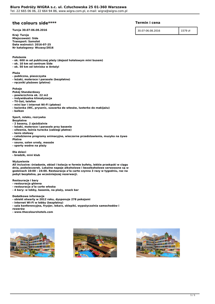 Biuro Podróży WIGRA s.c. ul. Człuchowska 25 01-360 Warszawa Tel. 22 665 06 06, 22 664 94 86, www.wigra.com.pl, e-mail: [email protected] the colours side**** Turcja 30.07-06.08.2016 Termin i cena 30.07-06.08.2016 1579 zł Kraj: Turcja Miejscowość: Side Transport: Samolot Data ważności: 2016-07-25 Nr katalogowy: Wczasy/2016 Położenie - ok. 600 m od publicznej plaży (dojazd hotelowym mini busem) - ok. 10 km od centrum Side - ok. 50 km od lotniska w Antalyi Plaża - publiczna, piaszczysta - leżaki, materace i parasole (bezpłatne) - ręczniki plażowe (płatne) Pokoje Pokój Standardowy - powierzchnia ok. 22 m2 - indywidualna klimatyzacja - TV-Sat, telefon - mini bar i internet Wi-Fi (płatne) - łazienka (WC, prysznic, suszarka do włosów, lusterko do makijażu) - balkon Sport, relaks, rozrywka Bezpłatne - 2 baseny, 2 zjeżdżalnie - leżaki, materace i parasole przy basenie - siłownia, łaźnia turecka (zabiegi płatne) - tenis stołowy - całodzienne programy animacyjne, wieczorne przedstawienia, muzyka na żywo Płatne - sauna, salon urody, masaże - sporty wodne na plaży Dla dzieci - brodzik, mini klub Wyżywienie All inclusive: śniadanie, obiad i kolacja w formie bufetu, lekkie przekąski w ciągu dnia, podwieczorek. Lokalne napoje alkoholowe i bezalkoholowe serwowane są w godzinach 10:00 – 24:00. Restauracja a’la carte czynna 3 razy w tygodniu, raz na pobyt bezpłatna, po wcześniejszej rezerwacji. Restauracje i bary - restauracja główna - restauracja a’la carte włoska - 4 bary: w lobby, basenie, na plaży, snack bar Dodatkowe informacje - obiekt otwarty w 2012 roku, dysponuje 278 pokojami - internet Wi-Fi w lobby (bezpłatny) - sala konferencyjna, fryzjer, lekarz, sklepiki, wypożyczalnia samochodów i rowerów - www.thecolourshotels.com 1/1 Powered by TCPDF (www.tcpdf.org)