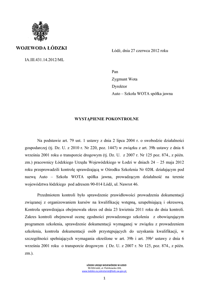 WOJEWODA ŁÓDZKI Wojewoda Łódzki Łódź, dnia 27 czerwca 2012 roku IA.III.431.14.2012/ML Pan Zygmunt Wota Dyrektor Auto – Szkoła WOTA spółka jawna WYSTĄPIENIE POKONTROLNE Na podstawie art. 79 ust. 1 ustawy z dnia 2 lipca 2004 r. o swobodzie działalności gospodarczej (tj. Dz. U. z 2010 r. Nr 220, poz. 1447) w związku z art. 39h ustawy z dnia 6 września 2001 roku o transporcie drogowym (tj. Dz. U. z 2007 r. Nr 125 poz. 874., z późn. zm.) pracownicy Łódzkiego Urzędu Wojewódzkiego w Łodzi w dniach 24 – 25 maja 2012 roku przeprowadzili kontrolę sprawdzającą w Ośrodku Szkolenia Nr 020Ł działającym pod nazwą Auto – Szkoła WOTA spółka jawna, prowadzącym działalność na terenie województwa łódzkiego pod adresem 90-014 Łódź, ul. Nawrot 46. Przedmiotem kontroli było sprawdzenie prawidłowości prowadzenia dokumentacji związanej z organizowaniem kursów na kwalifikację wstępną, uzupełniającą i okresową. Kontrola sprawdzająca obejmowała okres od dnia 23 kwietnia 2011 roku do dnia kontroli. Zakres kontroli obejmował ocenę zgodności prowadzonego szkolenia z obowiązującym programem szkolenia, sprawdzenie dokumentacji wymaganej w związku z prowadzeniem szkolenia, kontrola dokumentacji osób przystępujących do uzyskania kwalifikacji, w szczególności spełniających wymagania określone w art. 39b i art. 39b² ustawy z dnia 6 września 2001 roku o transporcie drogowym ( Dz. U. z 2007 r. Nr 125, poz. 874., z późn. zm.). ŁÓDZKI URZĄD WOJEWÓDZKI W ŁODZI 90‐926 Łódź, ul. Piotrkowska 104, www.lodzkie.eu;[email protected]. 1 Wyniki kontroli przedstawiono w sporządzonym protokole, który podpisany został przez Pana Zygmunta Wotę, bez zastrzeżeń w dniu 06.06.2012 roku. W oparciu o protokół kontroli i w nawiązaniu do ustaleń w nim zawartych, odnosząc się do zaleceń pokontrolnych oraz bieżącej działalności ośrodka szkolenia w zakresie prawidłowości prowadzenia dokumentacji związanej z organizowaniem kursów na kwalifikację wstępną, uzupełniającą i okresową w okresie od dnia 23 kwietnia 2011 roku do dnia kontroli ocenia się pozytywnie z uchybieniami. Na powyższą ocenę składają się poniżej opisane ustalenia i wnioski z przeprowadzonej kontroli. 1. W zakresie prowadzenia zajęć teoretycznych na kwalifikację wstępną, uzupełniającą i okresową zajęcia prowadzone są zgodnie z obowiązującym programem przez wykładowców posiadających umiejętności i wykształcenie niezbędne do zapewnienia prawidłowego przebiegu szkolenia w oparciu o rozporządzenie Ministra Infrastruktury z dnia 1 kwietnia 2010 roku w sprawie szkolenia kierowców wykonujących przewóz drogowy (Dz. U. Nr 53, poz. 314). Szkolenie kursantów w warunkach specjalnych, o których mowa w art. 39g ust.2 pkt. 3 lit. d ustawy z dnia 6 września 2001 roku o transporcie drogowym, § 3 ust. 2 rozporządzenia w sprawie szkolenia kierowców wykonujących przewóz drogowy odbywa się na podstawie umowy zawartej z Test & Training Safety Centre sp. z o.o. spółką komandytową z siedzibą w Bednarach oraz podpisanej w dniu 3.10.2011 roku umowy z firmą AUTOMOBILKLUB POLSKI z siedzibą w Warszawie ul. Pańska 85. Wskazane wyżej podmioty gospodarcze są wpisane do rejestru przedsiębiorców prowadzących ośrodek doskonalenia techniki jazdy. 2. Ośrodek dysponuje pojazdami samochodowymi odpowiednimi do zakresu prowadzonego szkolenia (art. 39g ust.2 pkt. 3 lit. e ustawy z dnia 6 września 2001 r o transporcie drogowym, § 4. rozporządzenia w sprawie szkolenia kierowców wykonujących przewóz drogowy). Do jazdy w warunkach drogowych jest wykorzystywany samochód ciężarowy marki MAN TGL 12.250 będący w leasingu ośrodka oraz autobus marki Autosan typ A.10.10.T. wynajmowany od firmy PKS w Łodzi spółka z o.o. Przedmiotowe pojazdy są wyposażone w wymagane systemy : system przeciwdziałający blokowaniu kół przy hamowaniu, system kontroli trakcji, system stabilizacji toru z techniczną możliwością ich rozłączania. ŁÓDZKI URZĄD WOJEWÓDZKI W ŁODZI 90‐926 Łódź, ul. Piotrkowska 104, www.lodzkie.eu;[email protected]. 2 3. W zakresie prowadzenia dokumentacji związanej z prowadzeniem szkoleń ustalono, że w ośrodku prowadzi się dzienniki zajęć teoretycznych i karty zajęć praktycznych zgodnie z rozporządzeniem w sprawie szkolenia kierowców wykonujących przewóz drogowy. Stwierdzono, że zostały podjęte działania naprawcze polegające na przeszkoleniu w zakresie drugiego bloku programowego tych uczestników szkoleń okresowych, którym wydano nieprawidłowo wypełnione świadectwa kwalifikacji zawodowej. Po przeszkoleniu kierowcy otrzymali nowe świadectwa kwalifikacji, które następnie przekazano do Wydziału Komunikacji i Transportu Starostwa Powiatowego w Pabianicach, przy jednoczesnym wycofaniu błędnych świadectw. Ponadto stwierdzono, że w ośrodku prowadzi się karty zajęć praktycznych z uwzględnieniem ilości godzin przewidzianych dla jazdy w warunkach specjalnych, zgodnie z obowiązującymi przepisami tj. § 7 ust.2 pkt. 2 lit. c rozporządzenia w sprawie szkolenia kierowców wykonujących przewóz drogowy. Wprowadzono zasadę potwierdzania wpisów ilości godzin zajęć zarówno przez AutoSzkołę a Wota sp. j. jak i ośrodki doskonalenia techniki jazdy przeprowadzające zajęcia w ramach jazdy w warunkach specjalnych. Kontrolowany ośrodek szkolenia stosuje prawidłowy wzór świadectwa kwalifikacji zawodowej. Na opracowanym nowym druku słowo „zakres” zostało zastąpione wyrazem „blok programowy” zgodnie z załącznikiem nr 3 do rozporządzenia w sprawie szkolenia kierowców wykonujących przewóz drogowy. Usunięto uchybienia polegające na przekazywanych przez ośrodek do centralnej ewidencji kierowców niewłaściwych będących konsekwencją źle opracowanego wzoru świadectwa informacji, kwalifikacji zawodowej. 4. W odniesieniu do szkoleń okresowych przestrzega się zasady nie łączenia m
