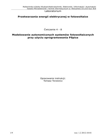 Politechnika Łódzka Wydział Elektrotechniki, Elektroniki, Informatyki i Automatyki Katedra Mikroelektroniki i Technik Informatycznych ul. Wolczańska 221/223 bud. B18 Laboratorium Przetwarzania energii elektrycznej w fotowoltaice Ćwiczenie 4 - 8 Modelowanie autonomicznych systemów fotowoltaicznych przy użyciu oprogramowania PSpice Opracowanie instrukcji: Tomasz Torzewicz 1/9 wer. 1.2 2012-10-01 Politechnika Łódzka Wydział Elektrotechniki, Elektroniki, Informatyki i Automatyki Katedra Mikroelektroniki i Technik Informatycznych ul. Wolczańska 221/223 bud. B18 Zadanie 4: Zmodyfikować netlistę zadanie4.cir do symulacji zmian napięcia baterii i poziomu ładunku SOC przyjmując, że bateria jest połączona ze źródłem sinusoidalnego prądu o amplitudzie 20 A i częstotliwości 1 mHz, rys. 1. Rysunek 1: Analizowany obwód Napięcie nominalne baterii: 24 V Pojemność nominalna: C = 50 Ah k = 0.8 -> efektywność ładowania/rozładowania baterii D = 1e-3 1/h -> współczynnik samo rozładowania SOC1 = 50% -> początkowy poziom naładowania Obwód posiada cztery węzły, w tym węzeł „0” do którego dołączony jest rezystor R44. Rezystor ten służy tylko do monitorowania napięcia i jego wartość nie wynika z żadnych obliczeń. Można przyjąć R44 = 10 kΩ. Pomiar parametru SOC odbywa się na węźle (Node 1), wartość 1 V potencjału tego węzła odpowiada wartości 100 % ładunku akumulatora. Zaobserwować jak zmienia się poziom naładowania akumulatora (napięcie na rezystorze R44) w stosunku do prądu źródła I(sin). Zaobserwować zmiany napięcia na akumulatorze. WAŻNE: Do symulacji wykorzystać plik bat.cir W symulacji przyjąć analizę transient dla czasu maksymalnego 2000 s. Oznaczenia poszczególnych węzłów mogą być inne niż na rysunku 1. Do poprawnej pracy symulatora konieczne jest wskazanie węzła odniesienia „0”. Opis baterii (12 V, 48 Ah) wraz z parametrami xbat1 3 0 7 bat params: ns=6, SOCm=576, k=.7, D=1e-3, SOC1=0.85 .inc bat.cir Węzeł 0 3 7 Funkcja węzeł referencyjny, BAT BAT + Wyjście kontroli ilości ładunku w akumulatorze ns - liczba pojedynczych 2 V ogniw w połączeniu szeregowym SOC – poziom naładowania, parametr określający stosunek zgromadzonego ładunku do całkowitej pojemności baterii SOC = (1 – Q/C ) SOCm – maksymalna pojemność baterii [Wh]; odpowiada iloczynowi maksymalnej pojemności baterii i jej napięcia znamionowego. SOC1 – początkowy poziom naładowania 2/9 wer. 1.2 2012-10-01 Politechnika Łódzka Wydział Elektrotechniki, Elektroniki, Informatyki i Automatyki Katedra Mikroelektroniki i Technik Informatycznych ul. Wolczańska 221/223 bud. B18 Zadanie 5: Zestawić (napisac netlistę ) obwodu składającego się z modułu PV, akumulatora i obciążenia Rload = 4 Ω, rysunek 2. I(xbat1.vcurrent) Rysunek 2: Schemat badanego obwodu Załączyć bibliotekę module_1.lib .inc module_1.lib xmodule_1 0 3 1 module_1 params: iscmr=5, vocmr=22.3,ns=36,np=1,nd=1,pmaxmr=85, ta=20,tr=1 Węzeł 0 1 2 3 Funkcja węzeł referencyjny wejście Virrad do podłączenia źródła wymuszającego wejście temperatury do podłączenia źródła wymuszającego wyjście modułu PV Załączyć baterię wraz z odpowiednimi parametrami .inc bat.cir xbat1 3 0 7 bat params: ns=6, SOCm=576, k=.7, D=1e-3, SOC1=0.85 Węzeł 0 3 7 Funkcja BAT BAT + Wyjście kontroli ilości ładunku w akumulatorze Uruchomić źródło stimulus z profilem nasłonecznienia z pliku Irrad2.stl .inc irrad2.stl vmesur 1 0 stimulus Vgg Czas analizy 120 ks .tran 1s 120000s 0.1s 3/9 wer. 1.2 2012-10-01 Politechnika Łódzka Wydział Elektrotechniki, Elektroniki, Informatyki i Automatyki Katedra Mikroelektroniki i Technik Informatycznych ul. Wolczańska 221/223 bud. B18 Moduł PV: liczba pojedynczych ogniw w szeregu, ns = 36 prąd zwarciowy, iscmr = 5 A napięcie wyjściowe bez obciążenia, vocmr = 22.3 V maksymalna moc wyjściowa modułu, pmax = 85 W Akumulator kwasowy: Napięcie nominalne baterii: 12 V Pojemność nominalna: C = 48 Ah k = 0.7 D = 1e-3 1/h początkowy poziom naładowania SOC1 = 85% Wyznaczyć przebieg prądu I(xbat1.vcurrent) oraz napięcia baterii V(3) w czasie. Wyznaczyć wartość poziomu naładowania baterii V(7). Wyznaczyć przebieg prądu obciążenia I(r4) i wyjaśnić rozpływ prądów w węźle Node 3. WAŻNE: Parametry modułu PV, baterii lub jakichkolwiek innych obwodów, w których wymagane jest podawanie parametrów, muszą być podawane z nazwą dokładnie taką jaka jest użyta w danym pliku .cir lub .lib. 4/9 wer. 1.2 2012-10-01 Politechnika Łódzka Wydział Elektrotechniki, Elektroniki, Informatyki i Automatyki Katedra Mikroelektroniki i Technik Informatycznych ul. Wolczańska 221/223 bud. B18 Zadanie 6: Zestawić netlistę odwzorowującą układ z rysunku 3. Rysunek 3: System fotowoltaiczny z przetwornicą śledzącą PMM i stałym obciążeniem Oznaczenia węzłów modułu PV: .inc generator_beh.lib xgen 0 1 2 3 405 406 407 20 30 generator_beh (i tak dalej jak jest w opisie) Węzeł Funkcja 0 węzeł referencyjny 1 wejście Virrad, do podłączenia źródła wymuszającego 2 wejście temperatury, do przyłaczenia źrodła wymuszającego 3 wyjście modułu PV 405 wyjście (napięciowe) sygnału prądu zwarciowego iscmr 407 wyjście sygnału napięcia bez obciążenia vocmr 20 wyjście sygnału prądu dla punktu maksymalnej mocy imppr 30 wyjście sygnału napięcia dla punktu maksymalnej mocy vmppr Oznaczenia węzłów przetwornicy: .inc dcdcf.cir xconv 0 3 20 30 40 dcdcf params: n =0.7, vo1=17 Węzeł Funkcja 0 węzeł referencyjny 3 wejście przetwornicy 20 wejście sygnału prądu dla punktu maksymalnej mocy, imppr 30 wejście sygnału napięcia dla punktu maksymalnej mocy, vmppr 40 wyjście przetwornicy 5/9 wer. 1.2 2012-10-01 Politechnika Łódzka Wydział Elektrotechniki, Elektroniki, Informatyki i Automatyki Katedra Mikroelektroniki i Technik Informatycznych ul. Wolczańska 221/223 bud. B18 Zmodyfikować plik ppm.cir 