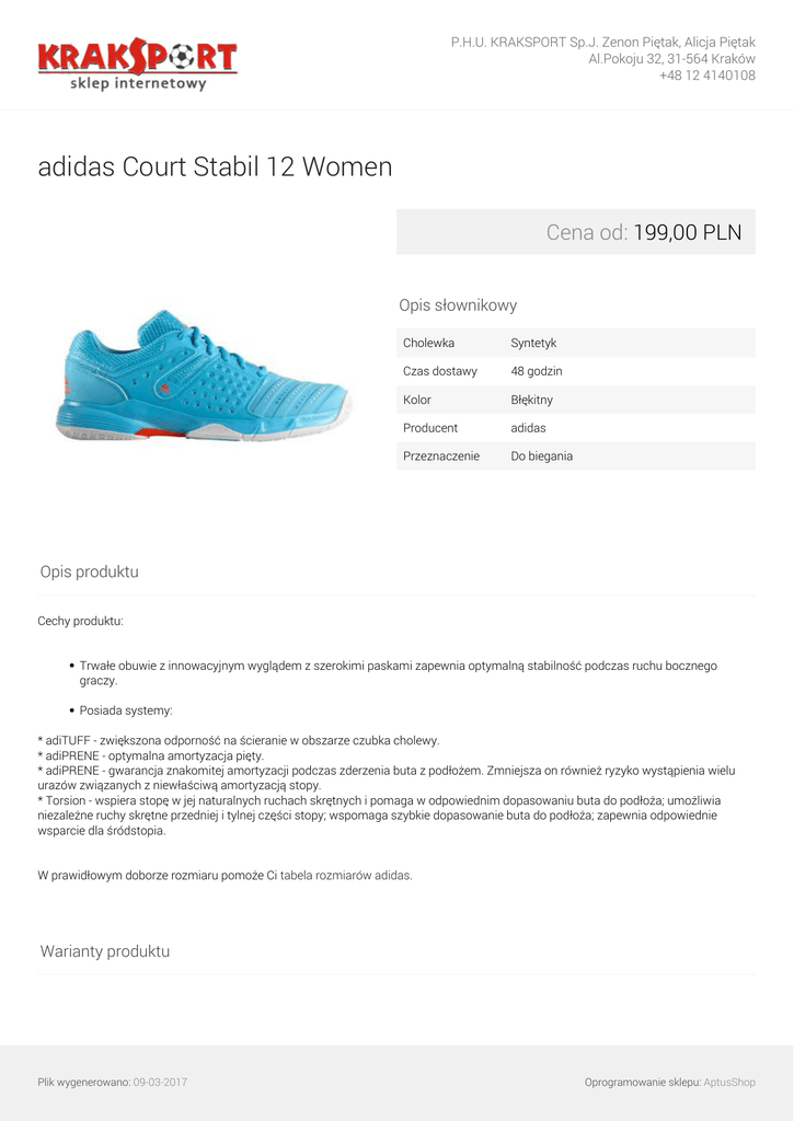 P.H.U. KRAKSPORT Sp.J. Zenon Piętak, Alicja Piętak Al.Pokoju 32, 31-564 Kraków +48 12 4140108 adidas Court Stabil 12 Women Cena od: 199,00 PLN Opis słownikowy Cholewka Syntetyk Czas dostawy 48 godzin Kolor Błękitny Producent adidas Przeznaczenie Do biegania Opis produktu Cechy produktu: Trwałe obuwie z innowacyjnym wyglądem z szerokimi paskami zapewnia optymalną stabilność podczas ruchu bocznego graczy. Posiada systemy: * adiTUFF - zwiększona odporność na ścieranie w obszarze czubka cholewy. * adiPRENE - optymalna amortyzacja pięty. * adiPRENE - gwarancja znakomitej amortyzacji podczas zderzenia buta z podłożem. Zmniejsza on również ryzyko wystąpienia wielu urazów związanych z niewłaściwą amortyzacją stopy. * Torsion - wspiera stopę w jej naturalnych ruchach skrętnych i pomaga w odpowiednim dopasowaniu buta do podłoża; umożliwia niezależne ruchy skrętne przedniej i tylnej części stopy; wspomaga szybkie dopasowanie buta do podłoża; zapewnia odpowiednie wsparcie dla śródstopia. W prawidłowym doborze rozmiaru pomoże Ci tabela rozmiarów adidas. Warianty produktu Plik wygenerowano: 09-03-2017 Oprogramowanie sklepu: AptusShop P.H.U. KRAKSPORT Sp.J. Zenon Piętak, Alicja Piętak Al.Pokoju 32, 31-564 Kraków +48 12 4140108 36 2/3 199,00 PLN Galeria Plik wygenerowano: 09-03-2017 Powered by TCPDF (www.tcpdf.org) Oprogramowanie sklepu: AptusShop