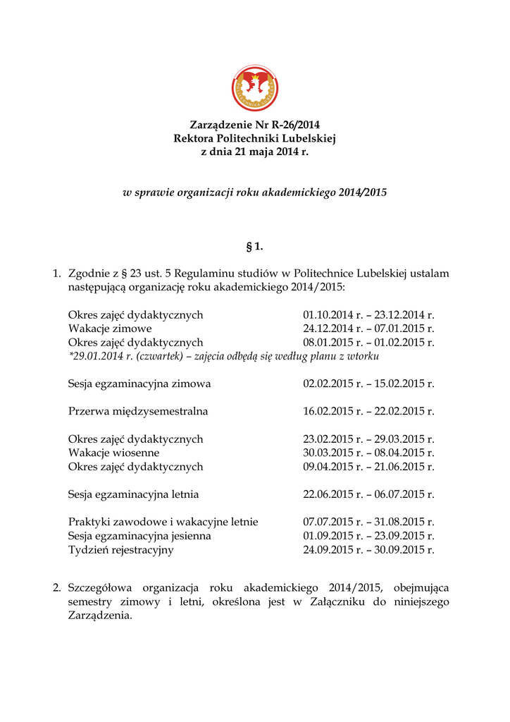 Zarządzenie Nr R-26/2014 Rektora Politechniki Lubelskiej z dnia 21 maja 2014 r. w sprawie organizacji roku akademickiego 2014/2015 § 1. 1. Zgodnie z § 23 ust. 5 Regulaminu studiów w Politechnice Lubelskiej ustalam następującą organizację roku akademickiego 2014/2015: Okres zajęć dydaktycznych 01.10.2014 r. – 23.12.2014 r. Wakacje zimowe 24.12.2014 r. – 07.01.2015 r. Okres zajęć dydaktycznych 08.01.2015 r. – 01.02.2015 r. *29.01.2014 r. (czwartek) – zajęcia odbędą się według planu z wtorku Sesja egzaminacyjna zimowa 02.02.2015 r. – 15.02.2015 r. Przerwa międzysemestralna 16.02.2015 r. – 22.02.2015 r. Okres zajęć dydaktycznych Wakacje wiosenne Okres zajęć dydaktycznych 23.02.2015 r. – 29.03.2015 r. 30.03.2015 r. – 08.04.2015 r. 09.04.2015 r. – 21.06.2015 r. Sesja egzaminacyjna letnia 22.06.2015 r. – 06.07.2015 r. Praktyki zawodowe i wakacyjne letnie Sesja egzaminacyjna jesienna Tydzień rejestracyjny 07.07.2015 r. – 31.08.2015 r. 01.09.2015 r. – 23.09.2015 r. 24.09.2015 r. – 30.09.2015 r. 2. Szczegółowa organizacja roku akademickiego 2014/2015, obejmująca semestry zimowy i letni, określona jest w Załączniku do niniejszego Zarządzenia. § 2. Opracowanie szczegółowej organizacji roku akademickiego 2014/2015 na studiach niestacjonarnych i doktoranckich, uwzględniającej w stosownym zakresie plan organizacyjny, o którym mowa w § 1, powierza się dziekanom wydziałów. § 3. Dziekani wydziałów, w uzasadnionych przypadkach, mogą zmienić terminy realizacji zajęć dydaktycznych w semestrze oraz terminy sesji egzaminacyjnych, zachowując pełną realizację programu studiów. § 4. Terminy studenckich praktyk zawodowych oraz sposób i warunki ich zaliczania ustalają dziekani wydziałów. § 5. Za realizację postanowień niniejszego Zarządzenia odpowiadają dziekani wydziałów i kierownicy jednostek międzywydziałowych. § 6. Zarządzenie wchodzi w życie z dniem podpisania, z mocą obowiązującą od dnia 1 października 2014 r. Rektor Prof. dr hab. inż. Piotr Kacejko Załącznik do Zarządzenia Nr R-26/2014 Rektora Politechniki Lubelskiej z dnia 21 maja 2014 r. Semestr zimowy 2014/2015 Tygodnie Poniedziałek Wtorek Środa Czwartek Piątek I - - 01-10 02-10 03-10 04-10 05-10 II 06-10 07-10 08-10 09-10 10-10 11-10 12-10 I 13-10 14-10 15-10 16-10 17-10 18-10 19-10 II 20-10 21-10 22-10 23-10 24-10 25-10 26-10 I 27-10 28-10 29-10 30-10 - - - II 03-11 04-11 05-11 06-11 07-11 08-11 09-11 I 10-11 - 12-11 13-11 14-11 15-11 16-11 II 17-11 18-11 19-11 20-11 21-11 22-11 23-11 I 24-11 25-11 26-11 27-11 28-11 29-11 30-11 II 01-12 02-12 03-12 04-12 05-12 06-12 07-12 I 08-12 09-12 10-12 11-12 12-12 13-12 14-12 II 15-12 16-12 17-12 18-12 19-12 20-12 21-12 I 22-12 23-12 - - - - - - - - - - - - I - - - 08-01 09-01 10-01 11-01 I 12-01 13-01 14-01 15-01 16-01 17-01 18-01 II 19-01 20-01 21-01 22-01 23-01 24-01 25-01 I 26-01 27-01 28-01 29-01* 30-01 31-01 01-02 *29.01.2014 r. (czwartek) – zajęcia odbędą się według planu z wtorku Sobota Niedziela Semestr letni 2014/2015 Tygodnie Poniedziałek Wtorek Środa Czwartek Piątek Sobota Niedziela I 23-02 24-02 25-02 26-02 27-02 28-02 01-03 II 02-03 03-03 04-03 05-03 06-03 07-03 08-03 I 09-03 10-03 11-03 12-03 13-03 14-03 15-03 II 16-03 17-03 18-03 19-03 20-03 21-03 22-03 I 23-03 24-03 25-03 26-03 27-03 28-03 29-03 - - - - - - - I/II - - - 09-04 10-04 11-04 12-04 II 13-04 14-04 15-04 16-04 17-04 18-04 19-04 I 20-04 21-04 22-04 23-04 24-04 25-04 26-04 II 27-04 28-04 29-04 30-04 - - - I 04-05 05-05 06-05 07-05 08-05 09-05 10-05 II 11-05 12-05 13-05 14-05 15-05 16-05 17-05 I 18-05 19-05 20-05 21-05 22-05 23-05 24-05 II 25-05 26-05 27-05 28-05 29-05 30-05 31-05 I 01-06 02-06 03-06 - 05-06 06-06 07-06 II 08-06 09-06 10-06 11-06 12-06 13-06 14-06 I 15-06 16-06 17-06 18-06 19-06 20-06 21-06