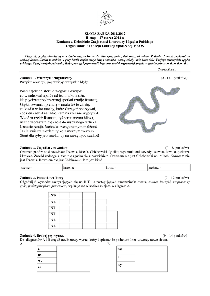 ZŁOTA ŻABKA 2011/2012 II etap – 17 marca 2012 r. Konkurs w Dziedzinie Znajomości Literatury i Języka Polskiego Organizator: Fundacja Edukacji Społecznej EKOS Cieszę się, że zdecydowałeś się na udział w naszym konkursie. Na rozwiązanie zadań masz 60 minut. Zadanie 1 musisz wykonać na osobnej kartce. Zanim to zrobisz, u góry kartki napisz swoje imię i nazwisko, nazwę szkoły, imię i nazwisko Twojego nauczyciela języka polskiego. Czytaj uważnie polecenia, dbaj o precyzję i poprawność językową swoich wypowiedzi, przede wszystkim jednak myśl, myśl, myśl ... Twoja Żabka (0 - 13 – punktów) Zadanie 1. Wierszyk ortograficzny Przepisz wierszyk, poprawiając wszystkie błędy. Posłuhajcie chistorii o węgożu Grzegożu, co wendrował uparće od jeziora ku możu. Na płyciźńe przybrzerznej spotkał rzmiję Rzanetę, Gipką, zwinną i pręrzną – miała też te zaletę, że łowiła w lot móchy, które Grzegoż sporzywał, codzień czekał na jadło, sam na rzer nie wypływał. Wkońcu rzekł: Rzaneto, tyś sercu memu bliska, wienc zapraszam cię czóle do wspulnego tarliska. Lecz się rzmija żachneła: wengorz mym mełżem? Ja się zwiąrzę węzłem tylko z mężnym węrzem. Stont dla ryby jest naóka, by na rzonę ryby szukać! Zadanie 2. Zagadka z zawodami (0 – 8 punktów) Czterech panów nosi nazwiska: Trzewik, Miech, Chlebowski, Igiełka; wykonują oni zawody: szewca, kowala, piekarza i krawca. Zawód żadnego z nich nie zgadza się z nazwiskiem. Szewcem nie jest Chlebowski ani Miech. Krawcem nie jest Trzewik. Kowalem nie jest Chlebowski. Kto jest kim? szewc - krawiec - kowal - piekarz - Zadanie 3. Początkowe litery (0 – 12 punktów) Odgadnij 6 wyrazów zaczynających się na INT- o następujących znaczeniach: rozum, zamiar, korzyść, nieproszony gość, podstępny plan, przeczucie; wpisz je we właściwe miejsca w diagramie. INTINTINTINTINTINTZadanie 4. Brakujący wyrazy (0 – 14 punktów) Do diagramów A i B znajdź trzyliterowy wyraz, który dopisany do podanych liter utworzy nowe słowa. A. B. owzte- u- wyza- wy- (0 – 12 punktów) Zadanie 5. Zagadki homonimowe (Przykład: jaki ptak jest owocem? KIWI) Jaki owoc jest niczym? Jakie pastwisko jest budynkiem? Jaka fryzura jest konikiem? Jaki kolor jest owocem? Jaki sweter jest grą sportową? Jaki ptak jest dźwigiem? (0 – 15 punktów) Zadanie 6. Zgadywanka frazeologiczna Z podanych w diagramie wyrazów ułóż trzy związki frazeologiczne związane z : 1.deszczem, 2. podróżowaniem, 3. konsekwencjami zapominania. jak w komu nogach leje ten czas ma z w cebra głowie kto temu nie w ma drogę 1……………………………………………………………………………………………………….. 2……………………………………………………………………………………………………….. 3……………………………………………………………………………………………………….. Zadanie 7. Wierszyki anagramowe (0 – 16 punktów) (Zadanie z poprzednich edycji) Odgadnij brakujące wyrazy i wpisz je do wierszyków (są to anagramy - wyrazy składające się z tych samych liter). A. SPACER Z PSAMI Gdy idę zimą na _ _ _ _ _, Towarzyszą mi dwa wierne _ _ _ _ _. B. NIEPOSŁUSZNY WNUK Prosiła babcia: miej _ _ _ _ _, wkładaj czapkę w zimie! Kto mimo _ _ _ _ _ chodzi z gołą głową, tego choroba nie minie. C. PRZYGODA W LESIE D. NAD LEKCJAMI Musiały _ _ _ _ nogi za pas misie łakome, Marszczył czoło, paznokcie _ _ _ _ _ _ _ _, potem szybko pisał minut dziesięć: Gdy pszczoły wzięły swoją _ _ _ _ w obronę. W zeszycie same _ _ _ _ _ _ _ _, więc przepisać trzeba, choć nie chce się. Zadanie 8. Rozumiemy słowo pisane (0 – 10 punktów) Przeczytaj tekst, a następnie zdania w ramce. Oznacz literą F zdania fałszywe, literą P - prawdziwe, N - jeśli na podstawie tekstu nie można odpowiedzieć na pytanie. Popatrz! Żył kiedyś człowiek bardzo bogaty. Żył kiedyś człowiek bardzo biedny. Każdy z nich miał syna, a żyli po przeciwnych stronach wielkiego wzgórza. Pewnego dnia bogacz wyprowadził swego syna na szczyt wzgórza i ogarniając krajobraz obszernym ruchem ręki, tak do niego powiedział: - Popatrz, wszystko to wkrótce będzie twoje! W tej samej chwili biedak wyprowadził swego syna na szczyt wzgórza po przeciwnej stronie i, w blasku wschodzącego słońca oświetlającego równinę, powiedział do niego z prostotą: - Popatrz! (Michel Piquemal, Bajki filozoficzne, Warszawa 2004) Narratorami bajki są ojcowie obu synów. Autor dopuścił do głosu samych bohaterów. Bohaterowie żyli w wioskach niedaleko siebie. Utwór jest bajką filozoficzną. Ojcowie przyprowadzili synów na wzgórze tego samego dnia. Bogacz obiecał synowi, że kiedyś ten zostanie właścicielem należących do niego ziem. Bohaterowie mieszkali po różnych stronach tego samego wzgórza. Biedak pokazał synowi wzgórze o zachodzie słońca. Biedak potrafił zachwycić się pięknem świata. Synowie bohaterów byli dorośli.
