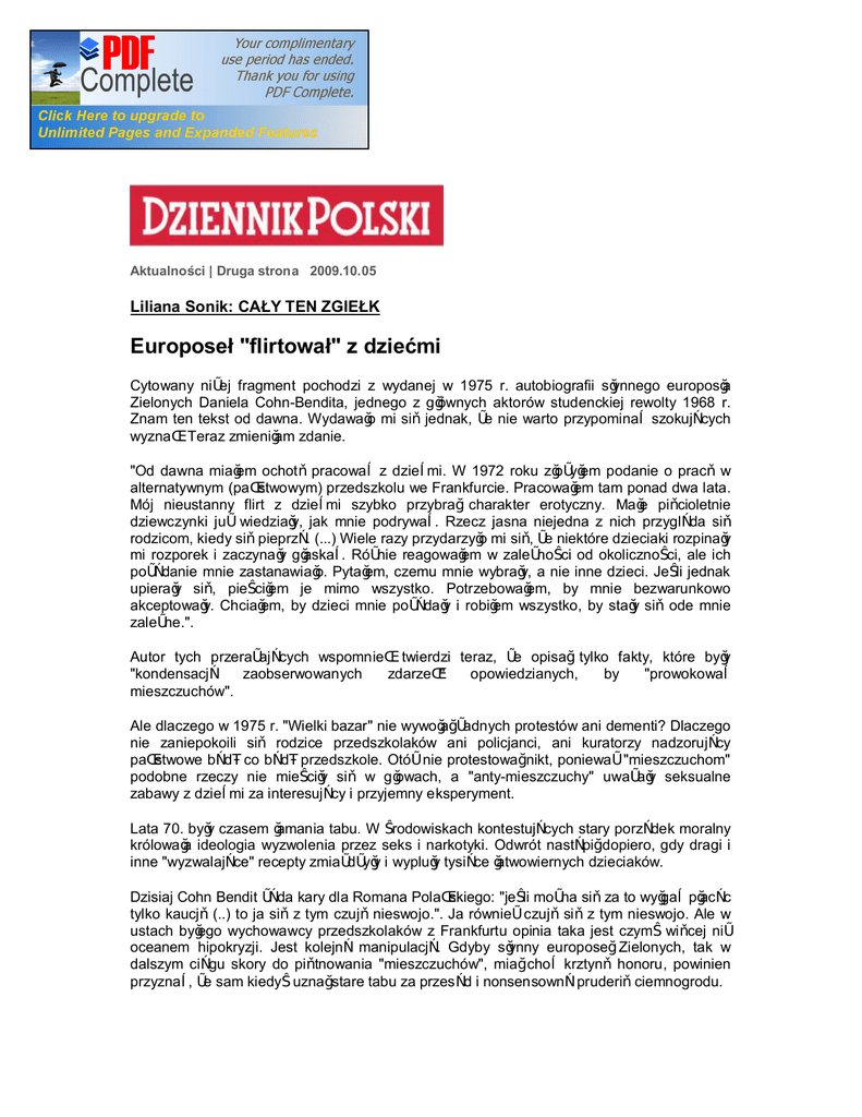 Aktualności | Druga strona 2009.10.05 Liliana Sonik: CAŁY TEN ZGIEŁK Europoseł "flirtował" z dziećmi Cytowany niżej fragment pochodzi z wydanej w 1975 r. autobiografii słynnego europosła Zielonych Daniela Cohn-Bendita, jednego z głównych aktorów studenckiej rewolty 1968 r. Znam ten tekst od dawna. Wydawało mi się jednak, że nie warto przypominać szokujących wyznań. Teraz zmieniłam zdanie. "Od dawna miałem ochotę pracować z dziećmi. W 1972 roku złożyłem podanie o pracę w alternatywnym (państwowym) przedszkolu we Frankfurcie. Pracowałem tam ponad dwa lata. Mój nieustanny flirt z dziećmi szybko przybrał charakter erotyczny. Małe pięcioletnie dziewczynki już wiedziały, jak mnie podrywać. Rzecz jasna niejedna z nich przygląda się rodzicom, kiedy się pieprzą. (...) Wiele razy przydarzyło mi się, że niektóre dzieciaki rozpinały mi rozporek i zaczynały głaskać. Różnie reagowałem w zależności od okoliczności, ale ich pożądanie mnie zastanawiało. Pytałem, czemu mnie wybrały, a nie inne dzieci. Jeśli jednak upierały się, pieściłem je mimo wszystko. Potrzebowałem, by mnie bezwarunkowo akceptowały. Chciałem, by dzieci mnie pożądały i robiłem wszystko, by stały się ode mnie zależne.". Autor tych przerażających wspomnień twierdzi teraz, że opisał tylko fakty, które były "kondensacją zaobserwowanych zdarzeń" opowiedzianych, by "prowokować mieszczuchów". Ale dlaczego w 1975 r. "Wielki bazar" nie wywołał żadnych protestów ani dementi? Dlaczego nie zaniepokoili się rodzice przedszkolaków ani policjanci, ani kuratorzy nadzorujący państwowe bądź co bądź przedszkole. Otóż nie protestował nikt, ponieważ "mieszczuchom" podobne rzeczy nie mieściły się w głowach, a "anty-mieszczuchy" uważały seksualne zabawy z dziećmi za interesujący i przyjemny eksperyment. Lata 70. były czasem łamania tabu. W środowiskach kontestujących stary porządek moralny królowała ideologia wyzwolenia przez seks i narkotyki. Odwrót nastąpił dopiero, gdy dragi i inne "wyzwalające" recepty zmiażdżyły i wypluły tysiące łatwowiernych dzieciaków. Dzisiaj Cohn Bendit żąda kary dla Romana Polańskiego: "jeśli można się za to wyłgać płacąc tylko kaucję (..) to ja się z tym czuję nieswojo.". Ja również czuję się z tym nieswojo. Ale w ustach byłego wychowawcy przedszkolaków z Frankfurtu opinia taka jest czymś więcej niż oceanem hipokryzji. Jest kolejną manipulacją. Gdyby słynny europoseł Zielonych, tak w dalszym ciągu skory do piętnowania "mieszczuchów", miał choć krztynę honoru, powinien przyznać, że sam kiedyś uznał stare tabu za przesąd i nonsensowną pruderię ciemnogrodu. Z tych mrocznych historii można jednego się nauczyć: dobrze sprzedana ideologia potrafi sformatować nawet sprawne umysły. A ofiary odkrywamy dopiero po dziesięcioleciach.