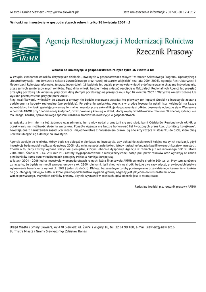 Miasto i Gmina Siewierz - http://www.siewierz.pl/ Data umieszczenia informacji: 2007-03-30 12:41:12 Wnioski na inwestycje w gospodarstwach rolnych tylko 16 kwietnia 2007 r.! Wnioski na inwestycje w gospodarstwach rolnych tylko 16 kwietnia br! W związku z naborem wniosków dotyczących działania „Inwestycje w gospodarstwach rolnych” w ramach Sektorowego Programu Operacyjnego „Restrukturyzacja i modernizacja sektora żywnościowego oraz rozwój obszarów wiejskich” (na lata 2004-2006), Agencja Restrukturyzacji i Modernizacji Rolnictwa informuje, że przez jeden dzień: 16 kwietnia br. będzie przyjmowała wnioski o dofinansowanie składane indywidualnie, przez samych zainteresowanych rolników. Tego dnia wnioski będzie można składać osobiście w Oddziałach Regionalnych Agencji lub przesłać przesyłką pocztową lub kurierską, przy czym datą stempla pocztowego na przesyłce musi być 16 kwietnia 2007 r. Wszystkie wnioski złożone lub wysłane pocztą zostaną przyjęte przez ARiMR. Przy kwalifikowaniu wniosków do zawarcia umowy nie będzie stosowana zasada: kto pierwszy ten lepszy! Środki na inwestycje zostaną podzielone na koperty regionalne (wojewódzkie). Po zebraniu wniosków, Agencja w drodze losowania ustali listy kolejności na każde województwo i wnioski spełniające wymogi formalne i merytoryczne zakwalifikuje do przyznania środków. Losowanie odbędzie się w Warszawie w centrali ARiMR przy "podniesionej kurtynie", przez powołaną komisję w skład, której wejdą przedstawiciele rolników. W obecnej sytuacji nie ma innego, bardziej sprawiedliwego sposobu rozdziału środków na inwestycje w gospodarstwach. W związku z tym nie ma też żadnego uzasadnienia, by rolnicy nadal gromadzili się pod siedzibami Oddziałów Regionalnych ARiMR w oczekiwaniu na możliwość złożenia wniosków. Ponadto Agencja nie będzie honorować list tworzonych przez tzw. „komitety kolejkowe”. Powstają one z naruszeniem zasad uczciwości i niejednokrotnie z naruszeniem prawa. Są one krzywdzące w stosunku do osób, które chcą uczciwie ubiegać się o dotacje na inwestycje. Agencja apeluje do rolników, którzy będą się ubiegać o pieniądze na inwestycje, aby dokładnie zaplanowali kolejne etapy ich realizacji, gdyż inwestycje będą musieli rozliczyć do połowy 2008 roku m.in. na podstawie faktur. Wtedy nastąpi refundacja kwalifikowanych kosztów inwestycji. Chodzi o to, żeby zostały wydane wszystkie pieniądze, którymi obecnie dysponuje Agencja w ramach już realizowanego SPO w latach 2004-2006. Środki te – ok. 230 mln zł – zostały wygospodarowane z niewykorzystanej dotąd puli przez rolników oraz wynikają ze zmian przeliczników kursu euro w rozliczeniach pomiędzy Polską a Komisja Europejską. W latach 2004 – 2006 jedna inwestycja w gospodarstwach rolnych, którą finansowała ARiMR wynosiła średnio 100 tys. zł. Przy tym założeniu oznacza to, że będziemy mogli zawrzeć umowy z ok. 2300 rolnikami. Jeśli chętnych na środki będzie dwa razy więcej, prawdopodobieństwo wylosowania beneficjenta wynosi ok. 50% ( jeden do dwóch). Dlatego bezzasadnym byłoby porównywanie przewidzianego losowania wniosków do gry loteryjnej, takiej jak Lotto, w której prawdopodobieństwo wygrania głównej nagrody jest jak jeden do kilkunastu milionów. Wobec powyższego, wszystkich rolników prosimy, aby nie wystawali w kolejkach, gdyż obecnie jest to stratą czasu. Radosław Iwański, p.o. rzecznik prasowy ARiMR Urząd Miasta i Gminy Siewierz, 42-470 Siewierz, ul. Żwirki i WIgury 16, tel. 32 64 99 400, e-mail: [email protected] Burmistrz Miasta i Gminy Siewierz mgr Zdzisław Banaś