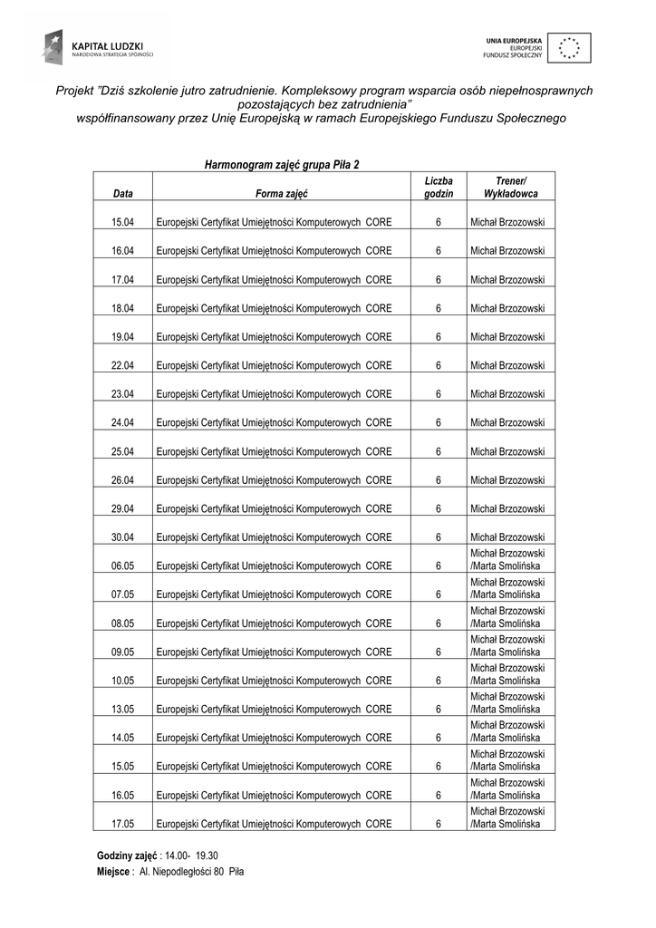 Projekt ”Dziś szkolenie jutro zatrudnienie. Kompleksowy program wsparcia osób niepełnosprawnych pozostających bez zatrudnienia” współfinansowany przez Unię Europejską w ramach Europejskiego Funduszu Społecznego Harmonogram zajęć grupa Piła 2 Data Forma zajęć Liczba godzin Trener/ Wykładowca 15.04 Europejski Certyfikat Umiejętności Komputerowych CORE 6 Michał Brzozowski 16.04 Europejski Certyfikat Umiejętności Komputerowych CORE 6 Michał Brzozowski 17.04 Europejski Certyfikat Umiejętności Komputerowych CORE 6 Michał Brzozowski 18.04 Europejski Certyfikat Umiejętności Komputerowych CORE 6 Michał Brzozowski 19.04 Europejski Certyfikat Umiejętności Komputerowych CORE 6 Michał Brzozowski 22.04 Europejski Certyfikat Umiejętności Komputerowych CORE 6 Michał Brzozowski 23.04 Europejski Certyfikat Umiejętności Komputerowych CORE 6 Michał Brzozowski 24.04 Europejski Certyfikat Umiejętności Komputerowych CORE 6 Michał Brzozowski 25.04 Europejski Certyfikat Umiejętności Komputerowych CORE 6 Michał Brzozowski 26.04 Europejski Certyfikat Umiejętności Komputerowych CORE 6 Michał Brzozowski 29.04 Europejski Certyfikat Umiejętności Komputerowych CORE 6 Michał Brzozowski 30.04 Europejski Certyfikat Umiejętności Komputerowych CORE 6 06.05 Europejski Certyfikat Umiejętności Komputerowych CORE 6 07.05 Europejski Certyfikat Umiejętności Komputerowych CORE 6 08.05 Europejski Certyfikat Umiejętności Komputerowych CORE 6 09.05 Europejski Certyfikat Umiejętności Komputerowych CORE 6 10.05 Europejski Certyfikat Umiejętności Komputerowych CORE 6 13.05 Europejski Certyfikat Umiejętności Komputerowych CORE 6 14.05 Europejski Certyfikat Umiejętności Komputerowych CORE 6 15.05 Europejski Certyfikat Umiejętności Komputerowych CORE 6 16.05 Europejski Certyfikat Umiejętności Komputerowych CORE 6 17.05 Europejski Certyfikat Umiejętności Komputerowych CORE 6 Michał Brzozowski Michał Brzozowski /Marta Smolińska Michał Brzozowski /Marta Smolińska Michał Brzozowski /Marta Smolińska Michał Brzozowski /Marta Smolińska Michał Brzozowski /Marta Smolińska Michał Brzozowski /Marta Smolińska Michał Brzozowski /Marta Smolińska Michał Brzozowski /Marta Smolińska Michał Brzozowski /Marta Smolińska Michał Brzozowski /Marta Smolińska Godziny zajęć : 14.00- 19.30 Miejsce : Al. Niepodległości 80 Piła Projekt ”Dziś szkolenie jutro zatrudnienie. Kompleksowy program wsparcia osób niepełnosprawnych pozostających bez zatrudnienia” współfinansowany przez Unię Europejską w ramach Europejskiego Funduszu Społecznego