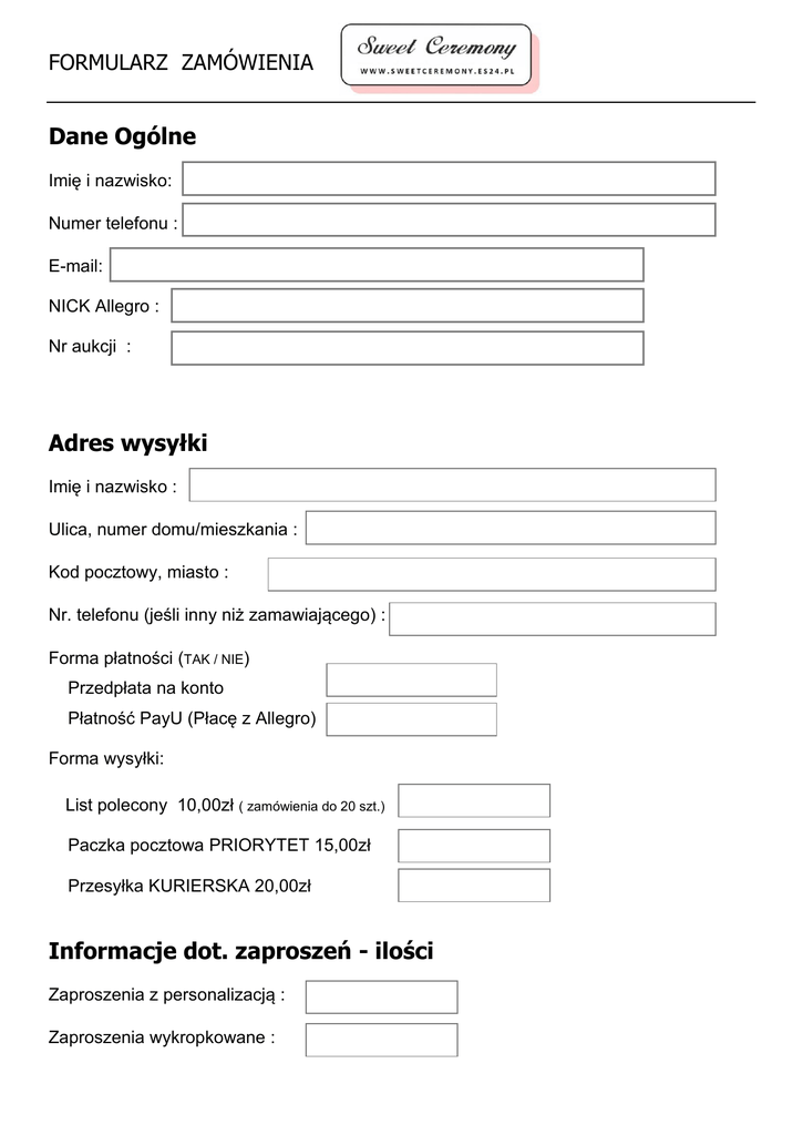 FORMULARZ ZAMÓWIENIA Dane Ogólne Imię i nazwisko: Numer telefonu : E-mail: NICK Allegro : Nr aukcji : Adres wysyłki Imię i nazwisko : Ulica, numer domu/mieszkania : Kod pocztowy, miasto : Nr. telefonu (jeśli inny niż zamawiającego) : Forma płatności (TAK / NIE) Przedpłata na konto Płatność PayU (Płacę z Allegro) Forma wysyłki: List polecony 10,00zł ( zamówienia do 20 szt.) Paczka pocztowa PRIORYTET 15,00zł Przesyłka KURIERSKA 20,00zł Informacje dot. zaproszeń - ilości Zaproszenia z personalizacją : Zaproszenia wykropkowane : Zawiadomienia z personalizacją : Zawiadomienia wykropkowane : Listy gości prosimy przesłać na adres e-mailowy w formie odmienionej w zależności od treści zaproszenia. Prosimy o nieumieszczanie przed nazwiskami: numeracji, zwrotów Sz.P. itp. ADRES E-mail: [email protected] Informacje dot. zaproszeń - wzory Nazwa kolekcji zaproszeń: Link: http://allegro.pl/listing/user.php?us_id=24488848 Wzór zaproszenia nr: Numer czcionki na okładkę PLIK Z CZCIONKAMI W ZAŁĄCZNIKU E-MAILA Numer czcionki do zapisu treści wewnątrz PLIK Z CZCIONKAMI W ZAŁĄCZNIKU E-MAILA Napis na okładce zaproszeń: Napis na okładce zawiadomień: Informacje dot. zaproszeń - detale Kolor tasiemki PLIK W ZAŁĄCZNIKU E-MAILA Rodzaj papieru i kolor PLIK W ZAŁĄCZNIKU E-MAILA Cyrkonia Dekor tekstu: PLIK W ZAŁĄCZNIKU E-MAILA Treść zaproszenia Proszę poniżej wkleić tekst zaproszenia ze swoimi danymi Treść zawiadomienia Proszę poniżej wkleić tekst zawiadomienia ze swoimi danymi Dodatkowe informacje dotyczące zamówienia / układu treści Dodatkowo zamawiane elementy kolekcji: (cennik znajduje się w załączniku e-maila) KOPERTA CZYSTA KOPERTA CZYSTA Z OTWOREM KOPERTA Z NADRUKIEM KOPERTA Z NADRUKIEM I OTWOREM WKŁADKI DO ZAPROSZEŃ WINIETKA/WIZYTÓWKA ZAWIESZKA NA ALKOHOL NUMERACJA STOŁÓW PLAN UROCZYSTOŚCI (może zawierać menu) KARTA MENU A5 KARTA MENU SKŁADANA ETYKIETKA DO PUDEŁEK Z CIASTEM KSIĘGA GOŚCI PLAN STOŁÓW Dziękujemy bardzo za wypełnienie formularza! Zapraszamy do kontaktu Pracujemy od poniedziałku do piątku w godzinach 8.00 - 16.00 Dyżur grafika poniedziałek-sobota 17.00-23.30 Kontakt ONLINE 24h E-mail: [email protected] Kontakt telefoniczny 9.00-16.00 Tel. +48 690 025 208 ________________________________________________________________________ W ciągu 48-72h prześlemy Państwu wstępny projekt do akceptacji. Projekty wysyłamy po godz. 17.00 Zgodnie z naszym Regulaminem mają Państwo możliwość wprowadzania poprawek oraz dwukrotnej nieodpłatnej zmiany aranżacji treści zaproszenia. Regulamin dostępny jest na naszej stronie www.sweetceremony.es24.pl Po zaakceptowaniu ostatecznego składu zaproszenia poprawki i reklamacje nie będą uwzględniane. Nie dokonujemy także odmian ani zmian w personalizacji nazwisk gości po oddaniu zaproszeń do druku.