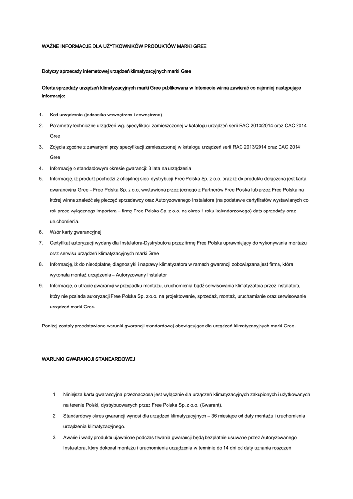 WAŻNE INFORMACJE DLA UŻYTKOWNIKÓW PRODUKTÓW MARKI GREE Dotyczy sprzedaży internetowej urządzeń klimatyzacyjnych marki Gree Oferta sprzedaży urządzeń klimatyzacyjnych marki Gree publikowana w Internecie winna zawierać co najmniej następujące informacje: 1. Kod urządzenia (jednostka wewnętrzna i zewnętrzna) 2. Parametry techniczne urządzeń wg. specyfikacji zamieszczonej w katalogu urządzeń serii RAC 2013/2014 oraz CAC 2014 Gree 3. Zdjęcia zgodne z zawartymi przy specyfikacji zamieszczonej w katalogu urządzeń serii RAC 2013/2014 oraz CAC 2014 Gree 4. Informację o standardowym okresie gwarancji: 3 lata na urządzenia 5. Informację, iż produkt pochodzi z oficjalnej sieci dystrybucji Free Polska Sp. z o.o. oraz iż do produktu dołączona jest karta gwarancyjna Gree – Free Polska Sp. z o.o, wystawiona przez jednego z Partnerów Free Polska lub przez Free Polska na której winna znaleźć się pieczęć sprzedawcy oraz Autoryzowanego Instalatora (na podstawie certyfikatów wystawianych co rok przez wyłącznego importera – firmę Free Polska Sp. z o.o. na okres 1 roku kalendarzowego) data sprzedaży oraz uruchomienia. 6. Wzór karty gwarancyjnej 7. Certyfikat autoryzacji wydany dla Instalatora-Dystrybutora przez firmę Free Polska uprawniający do wykonywania montażu oraz serwisu urządzeń klimatyzacyjnych marki Gree 8. Informację, iż do nieodpłatnej diagnostyki i naprawy klimatyzatora w ramach gwarancji zobowiązana jest firma, która wykonała montaż urządzenia – Autoryzowany Instalator 9. Informację, o utracie gwarancji w przypadku montażu, uruchomienia bądź serwisowania klimatyzatora przez instalatora, który nie posiada autoryzacji Free Polska Sp. z o.o. na projektowanie, sprzedaż, montaż, uruchamianie oraz serwisowanie urządzeń marki Gree. Poniżej zostały przedstawione warunki gwarancji standardowej obowiązujące dla urządzeń klimatyzacyjnych marki Gree. WARUNKI GWARANCJI STANDARDOWEJ 1. Niniejsza karta gwarancyjna przeznaczona jest wyłącznie dla urządzeń klimatyzacyjnych zakupionych i użytkowanych na terenie Polski, dystrybuowanych przez Free Polska Sp. z o.o. (Gwarant). 2. Standardowy okres gwarancji wynosi dla urządzeń klimatyzacyjnych – 36 miesiące od daty montażu i uruchomienia urządzenia klimatyzacyjnego. 3. Awarie i wady produktu ujawnione podczas trwania gwarancji będą bezpłatnie usuwane przez Autoryzowanego Instalatora, który dokonał montażu i uruchomienia urządzenia w terminie do 14 dni od daty uznania roszczeń Nabywcy. Okres ten może ulec wydłużeniu w przypadku konieczności importu niezbędnych części zamiennych z zagranicy. 4. Nabywca jest zobowiązany zlecać naprawy i przeglądy gwarancyjne Autoryzowanemu Instalatorowi, który dokonał montażu i rozruchu urządzenia. 5. Karta gwarancyjna ważna jest wyłącznie wtedy, gdy jest ostemplowana przez Sprzedawcę, posiada czytelnie i poprawnie wypełnione rubryki, wypełniony Rejestr Okresowych Przeglądów Konserwacyjnych, bez zmian i skreśleń, po okazaniu dowodu zakupu produktu. Numer seryjny na produkcie musi być czytelny i zgodny z numerem wpisanym w kartę gwarancyjną. 6. Montaż i rozruch urządzeń musi zostać dokonany przez Autoryzowanego Instalatora potwierdzony na niniejszej karcie gwarancyjnej. Instalator zobowiązany jest do sprawdzenia podstawowych parametrów pracy urządzenia i wpisaniu ich w kartę gwarancyjną. 7. Gwarant zapewnia sprawne działanie urządzenia, na które wydana jest niniejsza karta gwarancyjna pod warunkiem instalacji oraz korzystania z urządzenia zgodnie z przeznaczeniem i zaleceniami Instrukcji Obsługi. Gwarancja obejmuje wyłącznie wady powstałe z przyczyn tkwiących w sprzedanym urządzeniu. 8. Użytkownik jest zobowiązany do zlecania przeglądów okresowych urządzenia klimatyzacyjnego Autoryzowanemu Instalatorowi. Przeglądy okresowe muszą być wykonywane nie rzadziej, niż co 6 miesięcy i przeprowadzane przez pracowników Autoryzowanego Instalatora urządzeń marki Gree. Przeglądy okresowe nie dotyczą czynności stanowiących obowiązki użytkownika i są odpłatne wg cennika firmy wykonującej przegląd. 9. Potwierdzenie przeprowadzonych przeglądów okresowych umieszcza się w Rejestrze Przeglądów Konserwacyjnych na karcie gwarancyjnej. 10. Gwarancja nie obejmuje uszkodzeń mechanicznych, transportowych oraz awarii powstałych w wyniku: 1. działania czynników zewnętrznych takich jak: pożar, wyładowania elektryczne, zalanie, działanie środków chemicznych, niewłaściwa wentylacja, siły wyższe, 2. montażu, naprawy lub konserwacji urządzenia dokonywanych przez osoby nieuprawnione przez Gwaranta, 3. innych będących poza kontrolą Gwaranta (np. wahania napięć, przepięcia sieci energetycznej, itd.). 11. Gwarancja dotyczy tylko urządzenia i nie obejmuje instalacji czynnika chłodniczego, skroplin, zasilania i sterowania wykonywanych przez Autoryzowanego Instalatora, które to elementy systemu objęte są oddzielną rękojmią za wady zgodnie z przepisami kodeksu cywilnego. 12. Gwarancji nie podlegają części urządzeń i akcesoriów podlegające zużyciu w czasie eksploatacji np. zarysowania, trudne do usunięcia zabrudzenia, wytarcia napisów itp. 13. Instalacja, czyszczenie zewnętrzne jak i wewnętrzne, okresowa wymiana elementów przewidziana w instrukcji obsługi oraz konserwacja produktu są czynnościami odpłatnymi. W takich wypadkach koszty wezwania serwisu pokrywa użytkownik. 14. Nabywca traci prawa gwarancyjne w przypadku: 1. gdy karta gwarancyjna jest wypełniona nieprawidłowo, zamazana lub zniszczona, 2. dokonania montażu, zmian konstrukcyjnych lub napraw poza Autoryzowanym Instalatorem 3. zerwania lub uszkodzenia założonych plomb, 4. braku okresowych przeglądów według punktu 8. 15. Sprzęt zainstalowany na stałe w miejscu użytkowania naprawiany jest u użytkownika w uzgodnionym terminie. W przypadku naprawy w miejscu użytkowania, użytkownik powinien zapewn
