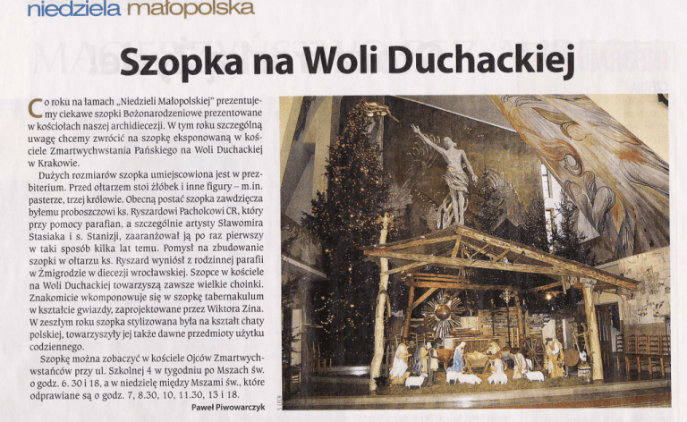 niedlzie!a nryęmfmffixpxsKe Szopkana Woli Duchackiei f o roku na łamach,,NiedzieliMałopolskiej''prezentu1eplezentowane L my ciekaweszopkiBożonarodzeniowe naszejarchidiecezii'W fym roku szczególną w kościotach uwagę chcemy zwróciĆna szopkę eksponowanąw kościele ZmartwychwstaniaPańskiego na Woli Duchackiej w Krakowie. D|riychrozmiarówszopkaumiejscowionajestw prezbiterium. Przed ołtarzemStoi żłóbeki inne figury * m.in. pasterze,trzejkrólowie. obecnąpostaćszopkazawdzięcza byłemuproboszczowiks.RyszardowiPacholcowiCR' który przy pomocy paraffan, a szczegóInie artysty Stawomira Stasiaka i s. Stanizji, zaaranzował'ją po raz pierwszy w taki sposób kilka lat temu. Pomysłna zbudowanie szopki w ołtarnlks. Ryszardwyniósł zrodzinnejpara|i w imigrodzie w diecezjiwrocławskiej.Szopcew kościele na Woli DuchackiejtowarzysząZawszewielkie choinki. Znakomiciewkomponowujesię w szopkętabernakulum w kształciegwiazdy,zaprojektowaneprzezWiktoraZina. W zeszłymroku szopkastylizowanabyłana kształtchaw polskiej,towarzyszyłyjejtakze dawneprzedmiotyużytku codziennego. ChSzopkęmożna zobaczyćw kościele ojców Zmart\hxr wstańców przy u|. Szkolnej4 w tygodniu po Mszach św. o godz.6.30 i 18,a w niedzielęmiędzyMszamiŚw.'które odprawianesąo godz.7,8.30,10, 11'30'13 i 18. Paweł Piwowarczyk