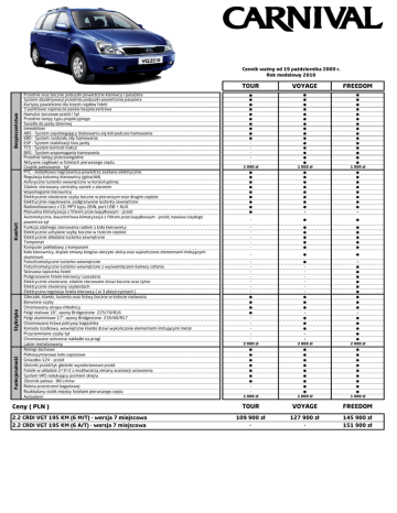 Funkcjonalność Stylistyka Komfort Bezpieczeństwo Cennik ważny od 19 października 2009 r. Rok modelowy 2010 Przednie oraz boczne poduszki powietrzne kierowcy i pasażera System dezaktywacji przedniej poduszki powietrznej pasażera Kurtyny powietrzne dla trzech rzędów foteli 3 punktowe napinacze pasów bezpieczeństwa Hamulce tarczowe przód / tył Przednie lampy typu projekcyjnego Światła do jazdy dziennej Immobilizer ABS - System zapobiegający blokowaniu się kół podczas hamowania EBD - System rozdziału siły hamowania ESP - System stabilizacji toru jazdy TCS - System kontroli trakcji BAS - System wspomagania hamowania Przednie lampy przeciwmgielne Aktywne zagłówki w fotelach pierwszego rzędu Czujnik parkowania - tył PTC - dodatkowa nagrzewnica powietrza zasilana elektrycznie Regulacja kolumny kierownicy (góra/dół) Asferyczne lusterko wewnętrzne w konsoli górnej Zdalnie sterowany centralny zamek z alarmem Wspomaganie kierownicy Elektrycznie otwierane szyby boczne w pierwszym oraz drugim rzędzie Elektrycznie regulowane, podgrzewane lusterka zewnętrzne Radioodtwarzacz z CD, MP3 typu 2DIN, port USB + AUX Manualna klimatyzacja z filtrem przeciwpyłkowym - przód Automatyczna, dwustrefowa klimatyzacja z filtrem przeciwpyłkowym - przód, nawiew ciepłego powietrza tył Funkcja zdalnego sterowania radiem z koła kierownicy Elektrycznie uchylane szyby boczne w trzecim rzędzie Elektrycznie składane lusterka zewnętrzne Tempomat Komputer pokładowy z kompasem Koło kierownicy, drążek zmiany biegów obszyte skórą oraz wykończone elementami imitującymi aluminium Fotochromatyczne lusterko wewnętrzne Fotochromatyczne lusterko wewnętrzne z wyświetlaczem kamery cofania Skórzana tapicerka foteli Podgrzewane fotele kierowcy i pasażera Elektrycznie otwierane, zdalnie sterowane drzwi boczne oraz tylne Elektrycznie otwierany szyberdach Elektryczna regulacja fotela kierowcy ( w 3 płaszczyznach ) Zderzaki, klamki, lusterka oraz listwy boczne w kolorze nadwozia Barwione szyby Chromowany atrapa chłodnicy Felgi stalowe 16", opony Bridgestone 225/70/R16 Felgi aluminiowe 17", opony Bridgestone 235/60/R17 Chromowana listwa pokrywy bagażnika Konsola środkowa, wewnętrzne klamki drzwi wykończone elementami imitującymi metal Przyciemniane szyby tył Chromowane ochronne nakładki na progi Lakier metalizowany Relingi dachowe Pełnowymiarowe koło zapasowe Gniazdko 12V - przód Głośniki przód/tył, głośniki wysokotonowe przód Fotele w układzie 2+3+2 z możliwością zmiany aranżacji ustawienia System VRS redukujący promień skrętu Zbiornik paliwa - 80 Litrów Roleta przestrzeni bagażowej Rozkładany stolik między fotelami pierwszego rzędu Autoalarm Ceny ( PLN ) 2.2 CRDI VGT 195 KM (6 M/T) - wersja 7 miejscowa 2.2 CRDI VGT 195 KM (6 A/T) - wersja 7 miejscowa TOUR VOYAGE FREEDOM ● ● ● ● ● ● ● ● ● ● ● ● ● ● ● ● ● ● ● ● ● ● ● ● ● ● ● ● ● ● ● ● ● ● ● ● ● ● ● ● - 1 000 zł 1 000 zł 1 000 zł ● ● ● ● ● ● ● ● ● ● ● ● ● ● ● ● ● ● ● ● ● ● ● ● ● ● ● ● ● ● ● ● ● ● ● ● ● ● ● ● ● ● ● ● ● ● ● ● ● ● ● ● ● ● - - ● ● ● ● - ● ● ● ● ● ● - 2 000 zł 2 000 zł 2 000 zł ● ● ● ● ● ● ● ● ● ● ● ● ● ● ● ● ● ● ● ● ● ● ● ● ● - 1 000 zł 1 000 zł 1 000 zł TOUR VOYAGE FREEDOM 109 900 zł - 127 900 zł - 145 900 zł 151 900 zł TOUR M/T GBA72FC57 D D264 (10'MY) VOYAGE / FREEDOM M/T FREEDOM A/T GBA72FC5F G GJ87 (10'MY) GBA72FC57 G GJ88 / GJ89 (10'MY) Dane Techniczne 16V, wysokoprężny, rzędowy, 4-cylindrowy z turbodoładowaniem 6 - biegowa mechaniczna Common rail 2199 85.4 x 96.0 16.0:1 136kW ( 195 KM ) / 3800 421/1800-2500 kolumny Mac Persona zawieszenie wielowahaczowe, sprężyny śrubowe 195 16V, wysokoprężny, rzędowy, 4-cylindrowy z turbodoładowaniem 6 - biegowa automatyczna Common rail 2199 85.4 x 96.0 16.0:1 136kW ( 195 KM ) / 3800 436/1800-2500 kolumny Mac Persona zawieszenie wielowahaczowe, sprężyny śrubowe 194 12,9 Przód tarczowe wentylowane / tył tarczowe 41,5 12,3 Przód tarczowe wentylowane / tył tarczowe 41,5 Zużycie paliwa w trybie miejskim (l/100 km) 8,6* 9,9* Zużycie paliwa w trybie pozamiejskim (l/100 km) 5,6* 6,1* Średnie zużycie paliwa (l/100 km) 6,7* 7,4* 5.51/5.82 z łańcuchami 80 364-3440 172-2840 167 2000-2187 2790 5.51/5.82 z łańcuchami 80 364-3440 172-2840 167 2025-2212 2810 Silnik & zawieszenie Uklad napedowy Typ skrzyni biegów System wtrysku paliwa Pojemność skokowa (cm3) Średnica x skok (mm x mm) Stopień sprężania Maksymalna moc (kW/obr./min) Maksymalny moment obrotowy (Nm/obr./min.) Przód Inne Osiągi & Zużycie paliwa Tył Prędkość maksymalna (km/h) Przyśpieszenie 0-100 km/h (sek) Hamulce - typ Droga hamowania 100-0 km/h (m) Promień skrętu (m) Pojemność zbiornika paliwa(l) Pojemność przestrzeni bagażowej (SAE/litr) Pojemność przestrzeni bagażowej (VDA/dm3) Prześwit minimalny ( mm ) Masa własna (kg) Dopuszczalna masa całkowita (kg) * Dane dotyczące zużycia paliwa mają charakter porównawczy, są uzyskane na stanowisku pomiarowym wg. normy 80/1268/EEC ostatnio zmienionej przez 204/3/EEC. Wartości rzeczywiste mogą być wyższe. QDS Gwarancja mechaniczna : 3 lata bez limitu km. Gwarancja perforacyjna : 6 lat. Okresy międzyprzeglądowe : co 15 tys.km. Twój Dealer :