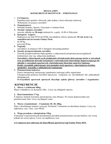 REGULAMIN KONKURENCJI SIŁOWYCH - STRONGMAN 1. 2. 3. 4. Cel imprezy Popularyzacja sportów siłowych, jako jednej z form rekreacji ruchowej. Wyłonienie zwycięzcy zawodów Organizatorzy Ośrodek Kultury, Sportu i Turystyki w Gminie Puck Termin i miejsce zawodów zawody odbędą się 30 maja (sobota) br. o godz. 16 00 w Połczynie Kategorie wagowe Dopuszcza się start WYŁĄCZNIE zawodników, którzy ukończyli 18 rok życia i są zameldowani na terenie Gminy Puck. - do 80 kg. - powyżej 80 kg 5. Nagrody - zawodnicy za miejsca I-III w kategorii otrzymają puchary 6. Zasady przeprowadzania zawodów - Zawody przeprowadzone będą zgodnie z załączonymi przepisami poszczególnych konkurencji oraz wg. załączonej punktacji. - Zawodnicy zobowiązani są do podpisania oświadczenia dotyczącego startu w zawodach oraz przedłożenia dowodu tożsamości i zaświadczenia lekarskiego dopuszczającego do udziału w zawodach sportowych. Zaświadczenie lekarskie musi być imienne. Każdy zawodnik zobowiązany jest posiadać strój sportowy: obowiązkowo krótkie spodenki i koszulkę z odsłoniętymi ramionami. 7. Postanowienia końcowe Prawo interpretacji niniejszego regulaminu zastrzega sobie organizator. Ubezpieczenie podczas zawodów spoczywa wyłącznie na zawodnikach lub jednostkach delegujących. O wszystkich sprawach spornych decyduje sędzia główny zawodów i organizator. KONKURENCJE 1. Marsz z walizkami 40kg. Marsz wahadłowy na dystansie 20m . Liczy się odległość marszu. 2. Rzut kamieniem 17 kg. Z miejsca, kamień trzymany przed piersią, rzut oburącz. Po rzucie dopuszczalne jest przekroczenie linii. Liczy się długość rzutu 3. Marsz z kamieniami – 3 kamienie 20, 30, 40kg. Start z określonego miejsca i pozycji. Przenieść 3 kamienie na określone miejsce. Liczy się najkrótszy czas / max. czas 90sek. 4. Waga przodem z obciążeniem 15kg. Uniesienie wyprostowanych przedramion przodem ponad poziom szczytu barków, nie wyżej jednak niż szczyt głowy. Liczy się najdłuższy czas. w/w impreza jest zaliczana do klasyfikacji sportowej Ligi Gminy Puck 2015. Punktacja : miejsce I II III IV V VI VII VIII punkty 9 7 6 5 4 3 2 1