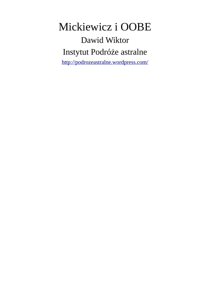 Mickiewicz i OOBE Dawid Wiktor Instytut Podróże astralne http://podrozeastralne.wordpress.com/ Dźwięk mię uderzył - nagle moje ciało, Jak ów kwiat polny, otoczony puchem, Prysło, zerwane anioła podmuchem, I ziarno duszy nagie pozostało. I zdało mi się, żem się nagle zbudził Ze snu strasznego, co mię długo trudził. I jak zbudzony ociera pot z czoła, Tak ocierałem moje przeszłe czyny, Które wisiały przy mnie, jak łupiny Wokoło świeżo rozkwitłego zioła. Ziemię i cały świat, co mię otaczał, Gdzie dawniej dla mnie tyle było ciemnic, Tyle zagadek i tyle tajemnic, I nad którymi jam dawniej rozpaczał, Teraz widziałem jako w wodzie na dnie, Gdy na nią ciemną promień słońca padnie. Teraz widziałem całe wielkie morze, Płynące z środka, jak ze źródła, z Boga, A w nim rozlana była światłość błoga. I mogłem latać po całym przestworze, Biegać, jak promień, przy boskim promieniu Mądrości bożej; i w dziwnym widzeniu I światłem byłem, i źrenicą razem. I w pierwszym, jednym, rozlałem się błysku Nad przyrodzenia całego obrazem; W każdy punkt moje rzuciłem promienie, A w środku siebie, jakoby w ognisku, Czułem od razu całe przyrodzenie. Stałem się osią w nieskończonym kole, Sam nieruchomy, czułem jego ruchy; Byłem w pierwotnym żywiołów żywiole, W miejscu, skąd wszystkie rozchodzą się duchy, Świat ruszające, same nieruchome: Jako promienie, co ze środka słońca Leją potoki blasku i gorąca, A słońce w środku stoi niewidome. I byłem razem na okręgu koła, Które się wiecznie rozszerza bez końca I nigdy bóstwa ogarnąć nie zdoła. I dusza moja, krąg napełniająca, Czułem, że wiecznie będzie się rozżarzać, I wiecznie będzie ognia jej przybywać; Będzie się wiecznie rozwijać, rozpływać, Rosnąć, rozjaśniać, rozlewać się - stwarzać, I coraz mocniej kochać swe stworzenie, I tym powiększać coraz swe zbawienie. Przeszedłem ludzkie ciała, jak przebiega Promień przez wodę, ale nie przylega Do żadnej kropli: wszystkie na wskroś zmaca, I wiecznie czysty przybywa i wraca, I uczy wodę, skąd się światło leje. I słońcu mówi, co się w wodzie dzieje. Stały otworem ludzkich serc podwoje, Patrzyłem w czaszki, jak alchymik w słoje. Widziałem. jakie człek żądze zapalał, Jakiej i kiedy myśli sobie nalał, Jakie lekarstwa. jakie trucizn wary Gotował skrycie. A dokoła stali Duchowie czarni, aniołowie biali, Skrzydłami studząc albo niecąc żary, Nieprzyjaciele i obrońcy duszni, Śmiejąc się, płacząc - a zawsze posłuszni Temu, którego trzymali w objęciu, Jak jest posłuszna piastunka dziecięciu Które jej ojciec, pan wielki, poruczy, Choć ta na dobre, a ta na złe uczy. Adam Mickiewicz „Widzenie”. Tekst wiersza ze strony http://literat.ug.edu.pl/xxx/amwiersz/0077.htm Pierwsze zwrotki wiersza mówią o początku eksterioryzacji. Dźwięk symbolizuje wibracje, które uderzyły w ciało Adama Mickiewicza. Wibracje są początkiem i sygnałem opuszczania ciała fizycznego. Dalej: Prysło, zerwane anioła podmuchem, I ziarno duszy nagie pozostało. I zdało mi się, żem się nagle zbudził Ze snu strasznego, co mię długo trudził. I jak zbudzony ociera pot z czoła, Tak ocierałem moje przeszłe czyny, Które wisiały przy mnie, jak łupiny Wokoło świeżo rozkwitłego zioła. Ziemię i cały świat, co mię otaczał, Gdzie dawniej dla mnie tyle było ciemnic, Tyle zagadek i tyle tajemnic, I nad którymi jam dawniej rozpaczał, Teraz widziałem jako w wodzie na dnie, Te zwrotki ukazują, że ciało astralne Adama Mickiewicza opuściło fizyczne. Mickiewicz ma dostęp do tego, co wcześniej dla niego było niedostępne – do Świata Astralnego. Dalej: Sam nieruchomy, czułem jego ruchy; Byłem w pierwotnym żywiołów żywiole, W miejscu, skąd wszystkie rozchodzą się duchy, Kolejna część, która jest bardzo ważna. Wiedział, że jest nieruchomy, ale ciało astralne się ruszało. Był w Świecie Astralnym, skąd właśnie się duchy rozchodzą. Dalsze części wiersza są opisem jego podróży astralnej, którą odbył. Widać po wierszu, że było to dla niego coś nowego i nieznanego.