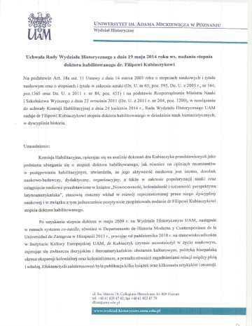 UNIWERSYTET IM. ADAMA MIcKIEwIczA w POZNANIU Wydzial Historyczny Uchwala Rady Wydzialu Historycznego z dnia 19 maja 2014 roku ws. nadania stopnia doktora habilitowanego dr. Filipowi Kubiacrykowi Na podstawieArt. 18aust. 11 Ustawyz dnia 14 marca2003roku o stopniachnaukowychi 6tule naukowymorazo stopniachi t5itulew zakresiesztuki(Dz.U. nr 65,po2.595,D2.U.22005 r., nr 164, Ministra Nauki po2.1365orazDz. U. z 2011 r. nr 84, poz. 455) i na podstawieRozporz4dzenia 2011(Dz.tJ.22011r.nr204, poz.1200),w nawi4zaniu WyZszego z dnia22 wrzednia i Szkolnictwa do uchwaly Komisji Habilitacyjnej z dnia 24 kwietnia 2014 r., Rada Wydzialu Historycztego UAM w dziedzinienaukhumanistycmych, nadajedr Filipowi Kubiaczykowistopniadoktorahabilitowanego w dyscypliniehistoria. Uzasadnienie: jako KomisjaHabilitacyjna,opieraj4csignaanaliziedokonaiidraKubiaczykaprzedstawionych jak r6wnie2 na opiniachrecenzent6w podstawaubieganiasig o stopieirdoktora habilitowanego, w postgpowaniuhabilitacyjnym, stwierdzila, 2e jego aktlrnoSd naukowa jest istotna, dorobek zy, dydaktyczny, organizaryjny, a tak2e w zakresie popularyzacli naruki onz naukowo-badawc perspektywa i to2samo36: kolonialnos6 w ksi4:Zce naukoweprzedstawione osi4gnigcia ,J\lowoczesnos6, latynoamerykanska",stanowi4 znaczny wkJadw rozw6j reprezentowanejprzez niego dyscypliny naukoweji w zwipku z tym jednoczesniepozytywniezaopiniowalanadaniedr Filipowi Kubiaczykowi stopniadoktorahabilitowanego. Po uzyskaniustopniadoktoraw maju 2009 r. na WydzialeHistorycznymUAM' nastgpnie w ramach systemuco-tutelle, rlwniez w Departamentode Historia Modernay contempor'nea de la adiunkta 2010r. na stanowisku universidadde Zaragozaw Hiszpanii2013r., pracuj4cod puadziemika w Instytucie Kultury Europejskiej UAM, dr Kubiaczyk cz],nnie uczestniczytw iryciu naukowym, zajmuj4csig zwlasznzaiberyjskim i iberoamerykanskimobszaremkulturowl/ n, polityk4 hiszpatisk4 relacjimiEdzyplci4 a ponadtor6wniezzagadnioniami kolonialnejorazkolonializmem, okresuekspansji i' i wladz4.Efektemtych zainteresowafibyla publikacjakilku ksi4zekorazkilkunastuargkul6w i recenzj ul.Sw.Marcin78,Collegium Historicum, 61-809 Poznai tel.+4851 82947 02,fax+48518528779 [email protected] Habilitant odbyt staZenaukowew Hiszpanii. Dr Kubiaczykprowadzil zzjgciadydaktycznew Wy2szej SzkoleZawodowej,,Kadry dla Europy" i w WyZszejSzkoleNauk Humanistycznychi Dziennikarstwa w Poznaniu.Jako adiunkt w InstSztucie Kultury EuropejskiejUAM prowadzil 6wiczenia,wyklady i semin+riadyplomowe.Wypromowal siedmiu licencjat6wi jednego magistra.Ponadtodr Filip Kubiaozykbyl wsp6lorganizatoremkonferencjinaukowejPlet i wladza(Gniezno,2012r.). Przyczynil sig takZedo powstaniaczasopisma,,StudiaEuropeaGnesnensia",w kt6rym pelni funkcjg seketarza. Habilitant zajmuje sig r6wnie2 popularyzacj4nauki - zorganizowalKolo Naukowe Iberyst6w przy InsbrfucieKultury Europejskiej,aktywnie uczestniczylw Gnie2nieriskimFestiwalu Nauki i Kultury orazFpstiwaluNauki i SztukiUAM, wsp6lpracujeteZz UniwersltetemTrzeciegoWieku orazszkotami licealqymi Rada Wydziatu Historyczrego podziela opinig Komisji Habilitacyjnej, iZ dorobek naukowy i osi4gnigcia dra Kubiacrykaodpowiadaj4wymogomokeflonym Ustaw4i spekriaj4kryteriaoceny osi4gqigcosoby ubiegaj4cejsig o nadaniestopnia doktora habilitowanegow dziedzinienauk humarlistycznych, a kolonialnos6 i rozprawa ,J.,lowoczesno56, to2samo56: perspektywa j est znacz4cymi oryginalnymosi4gnigciemnaukowym. latyno4merykanska" z chwil4podjgcia. Uchwalatajest prawomocna OZiEKAN *torr"r"'2't2): . llski prof.UAMdr fab Kazrmrerz