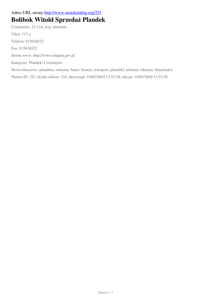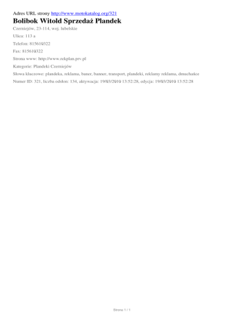 Adres URL strony http://www.motokatalog.org/321 Bolibok Witold Sprzedaż Plandek Czerniejów, 23-114, woj. lubelskie Ulica: 113 a Telefon: 815610322 Fax: 815610322 Strona www: http://www.rekplan.prv.pl Kategorie: Plandeki Czerniejów Słowa kluczowe: plandeka, reklama, baner, banner, transport, plandeki, reklamy reklama, dmuchańce Numer ID: 321, liczba odsłon: 134, aktywacja: 19/03/2010 13:52:28, edycja: 19/03/2010 13:52:28 Strona 1 / 1