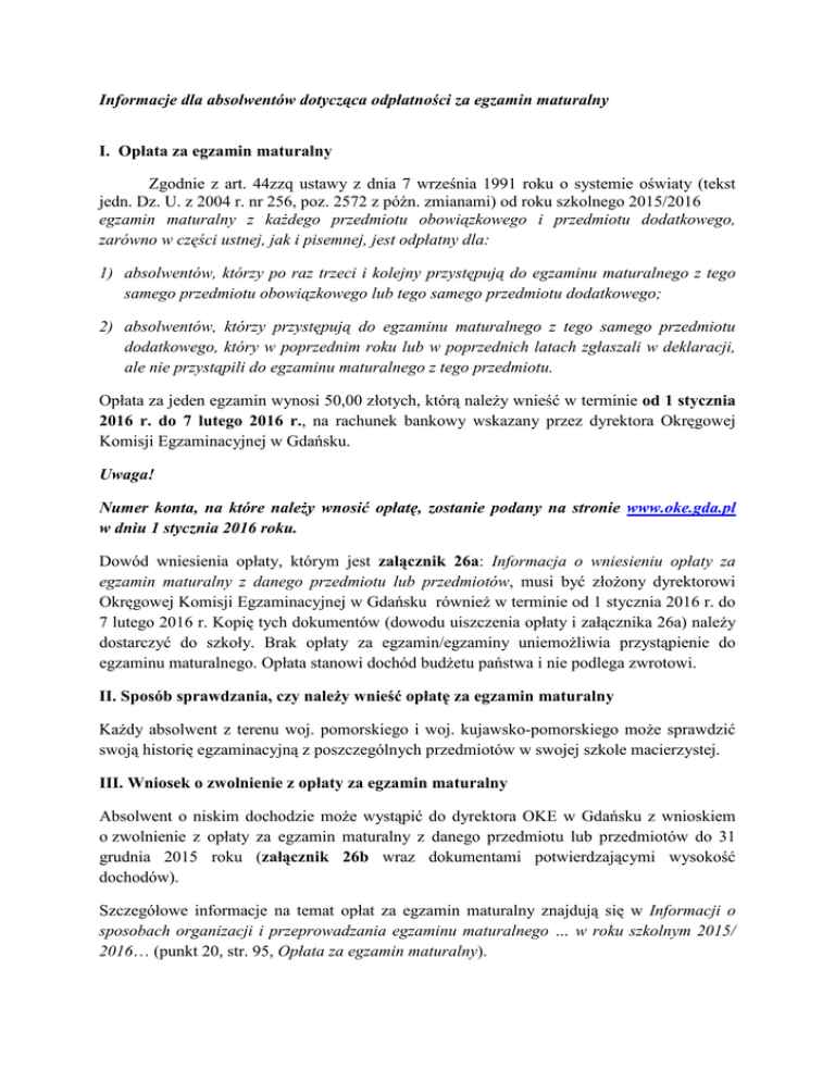 Informacje dla absolwentów dotycząca odpłatności za egzamin maturalny I. Opłata za egzamin maturalny Zgodnie z art. 44zzq ustawy z dnia 7 września 1991 roku o systemie oświaty (tekst jedn. Dz. U. z 2004 r. nr 256, poz. 2572 z późn. zmianami) od roku szkolnego 2015/2016 egzamin maturalny z kaŜdego przedmiotu obowiązkowego i przedmiotu dodatkowego, zarówno w części ustnej, jak i pisemnej, jest odpłatny dla: 1) absolwentów, którzy po raz trzeci i kolejny przystępują do egzaminu maturalnego z tego samego przedmiotu obowiązkowego lub tego samego przedmiotu dodatkowego; 2) absolwentów, którzy przystępują do egzaminu maturalnego z tego samego przedmiotu dodatkowego, który w poprzednim roku lub w poprzednich latach zgłaszali w deklaracji, ale nie przystąpili do egzaminu maturalnego z tego przedmiotu. Opłata za jeden egzamin wynosi 50,00 złotych, którą naleŜy wnieść w terminie od 1 stycznia 2016 r. do 7 lutego 2016 r., na rachunek bankowy wskazany przez dyrektora Okręgowej Komisji Egzaminacyjnej w Gdańsku. Uwaga! Numer konta, na które naleŜy wnosić opłatę, zostanie podany na stronie www.oke.gda.pl w dniu 1 stycznia 2016 roku. Dowód wniesienia opłaty, którym jest załącznik 26a: Informacja o wniesieniu opłaty za egzamin maturalny z danego przedmiotu lub przedmiotów, musi być złoŜony dyrektorowi Okręgowej Komisji Egzaminacyjnej w Gdańsku równieŜ w terminie od 1 stycznia 2016 r. do 7 lutego 2016 r. Kopię tych dokumentów (dowodu uiszczenia opłaty i załącznika 26a) naleŜy dostarczyć do szkoły. Brak opłaty za egzamin/egzaminy uniemoŜliwia przystąpienie do egzaminu maturalnego. Opłata stanowi dochód budŜetu państwa i nie podlega zwrotowi. II. Sposób sprawdzania, czy naleŜy wnieść opłatę za egzamin maturalny KaŜdy absolwent z terenu woj. pomorskiego i woj. kujawsko-pomorskiego moŜe sprawdzić swoją historię egzaminacyjną z poszczególnych przedmiotów w swojej szkole macierzystej. III. Wniosek o zwolnienie z opłaty za egzamin maturalny Absolwent o niskim dochodzie moŜe wystąpić do dyrektora OKE w Gdańsku z wnioskiem o zwolnienie z opłaty za egzamin maturalny z danego przedmiotu lub przedmiotów do 31 grudnia 2015 roku (załącznik 26b wraz dokumentami potwierdzającymi wysokość dochodów). Szczegółowe informacje na temat opłat za egzamin maturalny znajdują się w Informacji o sposobach organizacji i przeprowadzania egzaminu maturalnego … w roku szkolnym 2015/ 2016… (punkt 20, str. 95, Opłata za egzamin maturalny).