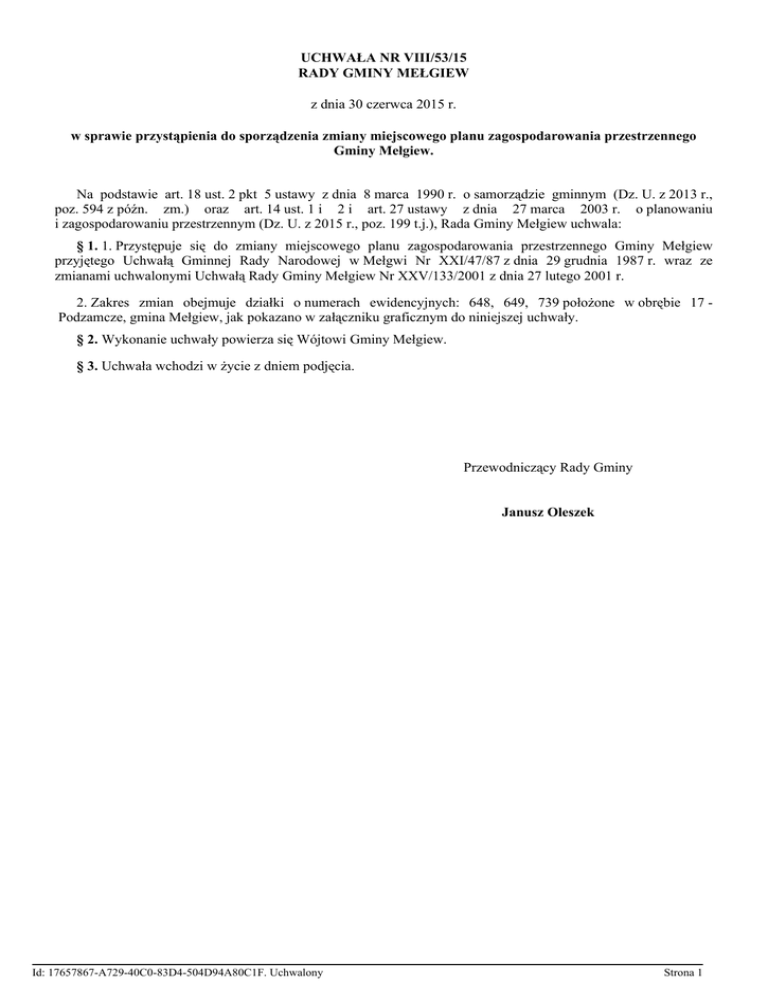 UCHWAŁA NR VIII/53/15 RADY GMINY MEŁGIEW z dnia 30 czerwca 2015 r. w sprawie przystąpienia do sporządzenia zmiany miejscowego planu zagospodarowania przestrzennego Gminy Mełgiew. Na podstawie art. 18 ust. 2 pkt 5 ustawy z dnia 8 marca 1990 r. o samorządzie gminnym (Dz. U. z 2013 r., poz. 594 z późn. zm.) oraz art. 14 ust. 1 i 2 i art. 27 ustawy z dnia 27 marca 2003 r. o planowaniu i zagospodarowaniu przestrzennym (Dz. U. z 2015 r., poz. 199 t.j.), Rada Gminy Mełgiew uchwala: § 1. 1. Przystępuje się do zmiany miejscowego planu zagospodarowania przestrzennego Gminy Mełgiew przyjętego Uchwałą Gminnej Rady Narodowej w Mełgwi Nr XXI/47/87 z dnia 29 grudnia 1987 r. wraz ze zmianami uchwalonymi Uchwałą Rady Gminy Mełgiew Nr XXV/133/2001 z dnia 27 lutego 2001 r. 2. Zakres zmian obejmuje działki o numerach ewidencyjnych: 648, 649, 739 położone w obrębie 17 Podzamcze, gmina Mełgiew, jak pokazano w załączniku graficznym do niniejszej uchwały. § 2. Wykonanie uchwały powierza się Wójtowi Gminy Mełgiew. § 3. Uchwała wchodzi w życie z dniem podjęcia. Przewodniczący Rady Gminy Janusz Oleszek Id: 17657867-A729-40C0-83D4-504D94A80C1F. Uchwalony Strona 1 Załącznik do uchwały Rady Gminy Mełgiew Nr VIII/53/15 z dnia 30 czerwca 2015 r. Analiza zasadności przystąpienia do sporządzenia zmiany miejscowego planu zagospodarowania przestrzennego Gminy Mełgiew (dla działek o nr ewid.: 648, 649, 739, obręb 17 – Podzamcze gm. Mełgiew) Mełgiew, 16 czerwca 2015r. Id: 17657867-A729-40C0-83D4-504D94A80C1F. Uchwalony Wójt Gminy Mełgiew Strona 2 1. PRZEDMIOT ZMIAN Przedmiotem zmian będzie miejscowy plan zagospodarowania przestrzennego Gminy Mełgiew przyjęty Uchwałą Gminnej Rady Narodowej Nr XXI / 47 / 87 z dnia 29 grudnia 1987r. wraz ze zmianami uchwalonymi Uchwała Rady Gminy Mełgiew Nr: XXV / 133 / 2001 z dnia 27 lutego 2001r. 2. ZAKRES ZMIAN Zakres zmian obejmuje działki o numerach ewidencyjnych: 648, 649, 739 położonych w obrębie 17 – Podzamcze, gmina Mełgiew, jak pokazano w załączniku graficznym do niniejszej uchwały. 3. ANALIZA STANU FORMALNEGO Obszar wskazany do objęcia zmianami miejscowego planu zagospodarowania przestrzennego dotyczy terenu będącego własnością prywatną, gminną oraz Lasów Państwowych – Nadleśnictwa Świdnik. 4. ANALIZA STANU PLANISTYCZNEGO Obszar wskazany do objęcia zmianami miejscowego planu zagospodarowania przestrzennego objęty jest ustaleniami: 1) Studium uwarunkowań i kierunków zagospodarowania przestrzennego Gminy Mełgiew, zatwierdzonego Uchwałą Rady Gminy Mełgiew Nr XXIV / 134 / 09 z dnia 15 maja 2009r. 2) Miejscowego planu zagospodarowania przestrzennego Gminy Mełgiew przyjętego Uchwałą Gminnej Rady Narodowej w Mełgwi Nr XXI / 47 / 87 z dnia 29 grudnia 1987 r. wraz ze zmianami uchwalonymi Uchwałą Rady Gminy Mełgiew Nr: XXV/133/2001 z dnia 27 lutego 2001r. 5. ANALIZA STANU REALIZACJI USTALEŃ OBOWIĄZUJĄCEGO MIEJSCOWEGO PLANU ZAGOSPODAROWANIA PRZESTRZENNEGO Zgodnie z art. 32 ust. 1 ustawy z dnia 27 marca 2003 r. o planowaniu i zagospodarowaniu przestrzennym (Dz. U. z 2015 r., poz. 199 t.j.) „(…)w celu oceny aktualności studium i planów miejscowych wójt, burmistrz albo prezydent miasta dokonuje analizy zmian w zagospodarowaniu przestrzennym gminy, ocenia postępy w opracowywaniu planów miejscowych i opracowuje wieloletnie programy ich sporządzania w nawiązaniu do ustaleń studium(…)”. Celem przystąpienia do zmiany planu miejscowego jest zmiana przeznaczenia Id: 17657867-A729-40C0-83D4-504D94A80C1F. Uchwalony Strona 3 terenu objętego planem w celu pełnego wykorzystania obszaru opracowania oraz wypełnienia obowiązków określonych przez ustawodawcę, poprzez dostosowanie rozwiązań planu do istniejącego i planowanego zagospodarowania terenu. 6. USTALENIA W SPRAWIE PRZYGOTOWANIA DO PODJĘCIA OPRACOWANIA ZMIAN PLANU 1) Przygotowano materiały konieczne do wykonania opracowania planistycznego. 2) Ustalono niezbędny zakres prac planistycznych. Zgodnie z Ustawą z dnia 21 sierpnia 1997 r. o ochronie zwierząt (Dz. U. z 2013 poz. 856 z późn. zm.) oraz Ustawą z dnia 13 września 1996 r. o utrzymaniu czystości i porządku w gminach (Dz. U. z 2013 poz. 1399 z późn. zm.) do zadań własnych gminy należy m.in. zapobieganie bezdomności zwierząt oraz zapewnienie bezdomnym zwierzętom miejsca w schronisku dla bezdomnych zwierząt. W związku z końcem okresu umowy dzierżawy obiektu na potrzeby schroniska dla bezdomnych zwierząt w Krzesimowie gm. Mełgiew, który upływa w marcu 2016r., istnieje konieczność wyznaczenia nowego terenu dla potrzeb w/w obiektu. Podczas spotkań Zarządu Powiatu z Burmistrzami Miast oraz Wójtami Gmin Powiatu Świdnickiego, ustalono że najlepszym miejscem na lokalizację schroniska dla bezdomnych zwierząt będą działki o numerach ewidencyjnych: 648, 649, położone w miejscowości Podzamcze gmina Mełgiew. Zmiana Miejscowego Planu Zagospodarowania Przestrzennego Gminy Mełgiew zostanie sporządzona zgodnie z ustaleniami art. 15 ustawy z dnia 27 marca 2003r. o planowaniu i zagospodarowaniu przestrzennym (Dz. U. z 2015 r., poz. 199 t.j.), z uwzględnieniem stosowanych standardów przy zapisywaniu ustaleń projektów tekstu oraz rysunku planu, wprowadzonych Rozporządzeniem Ministra Infrastruktury z dnia 26 sierpnia 2003 r. w sprawie wymaganego zakresu projektu miejscowego planu zagospodarowania przestrzennego (Dz. U. z 2003 r. Nr 164, poz. 1587 z późn. zm.). Podsumowując powyższe, sporządzenie Zmiany Miejscowego Planu Zagospodarowania Przestrzennego Gminy Mełgiew uważam za słuszne i uzasadnione. Zwracam się zatem do Rady Gminy Mełgiew z projektem uchwały w sprawie przystąpienia do sporządzenia zmiany planu miejscowego. Wójt Gminy Mełgiew Id: 17657867-A729-40C0-83D4-504D94A80C1F. Uchwalony Strona 4 Załącznik graficzny do uchwały Rady Gminy Mełgiew Nr VIII/53/15 z dnia 30 czerwca 2015 r. Id: 17657867-A729-40C0-83D4-504D94A80C1F. U