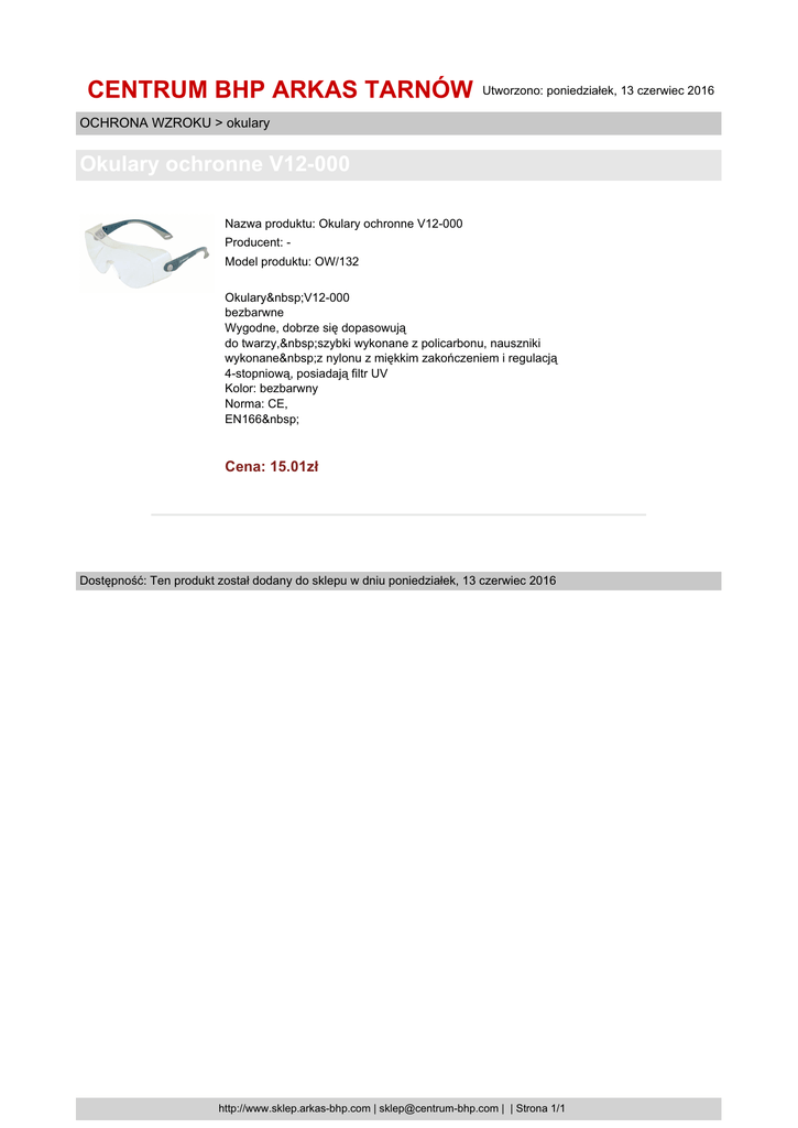 CENTRUM BHP ARKAS TARNÓW Utworzono: poniedziałek, 13 czerwiec 2016 OCHRONA WZROKU > okulary Okulary ochronne V12-000 Nazwa produktu: Okulary ochronne V12-000 Producent: Model produktu: OW/132 Okulary V12-000 bezbarwne Wygodne, dobrze się dopasowują do twarzy, szybki wykonane z policarbonu, nauszniki wykonane z nylonu z miękkim zakończeniem i regulacją 4-stopniową, posiadają filtr UV Kolor: bezbarwny Norma: CE, EN166 Cena: 15.01zł Dostępność: Ten produkt został dodany do sklepu w dniu poniedziałek, 13 czerwiec 2016 http://www.sklep.arkas-bhp.com | [email protected] | | Strona 1/1
