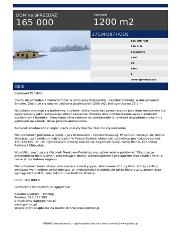 DOM na SPRZEDAŻ 165 000 Smoleń 1200 m2 27534/3877/ODS 165 000 PLN 138 PLN Secondary 1200 90 1980 2 DevelopmentState Opis Szanowni Państwo, mamy do sprzedania nieruchomość w sercu Jury Krakowsko - Częstochowskiej, w miejscowości Smoleń. Znajduje się ona na działce o powierzchni 1200 m2. Jest szeroka na 26,5 m. Na działce znajduje się parterowy budynek, który może być przeznaczony jako dom mieszkalny lub wykorzystany jako restauracja/ sklep/ kawiarnia. Posiada dwa pomieszczenia wraz z aneksem kuchennym i łazienkę. Drewniane okna robione na zamówienie (z roletami antywłamaniowymi) z widokiem na zamek. Drzwi przeciwwłamaniowe. Budynek zbudowany z cegieł, dach pokryty blachą. Stan do wykończenia. Nieruchomość położona w środku Jury Krakowsko - Częstochowskiej. W pobliżu rozciaga się Dolina Wodącej, czyli szlaki po najstarszych w Polsce śladach obecności człowieka, pochodzące sprzed 150-120 tys. lat. Do największych atrakcji zalicza się Zegarowe Skały, Skałę Biśnik, Grodzisko Pańskie i Chłopskie. W pobliżu znajduje się Ośrodek Naukowo-Dydaktyczny, gdzie można podziwiać "Ekspozycje przyrodniczo-historyczne", prezentujące zbiory: archeologiczne i geologiczne oraz faune i florę, a także stroje ludowe regionu. Nieruchomość może służyć jako miejsce inwestycyjne, skierowane do turystów, którzy zechcą zwiedzać wymienione wyżej miejsca. W miejscowości znajduje się także historyczny zamek oraz wyciągi narciarskie, więc nikomu nie braknie atrakcji. Cena: 165 000 zł Serdecznie zapraszam do oglądania! Klaudia Sikorska – Maciąg Telefon: 516 025 585 e-mail: [email protected] www.polnoc.pl Więcej ofert znajdziesz na naszej stronie www.polnoc.pl PÓŁNOC Nieruchomości - ogólnopolska sieć biur nieruchomości www.polnoc.pl * UWAGA! Zamieszczone na naszych stronach oferty nie stanowią oferty w rozumieniu Kodeksu Cywilnego, a dane w nich zawarte mają jedynie charakter informacyjny. Klaudia Sikorska-Maciąg tel. 516-025-585 email: [email protected] PÓŁNOC Nieruchomości - ogólnopolska sieć biur nieruchomości www.polnoc.pl Powered by TCPDF (www.tcpdf.org)