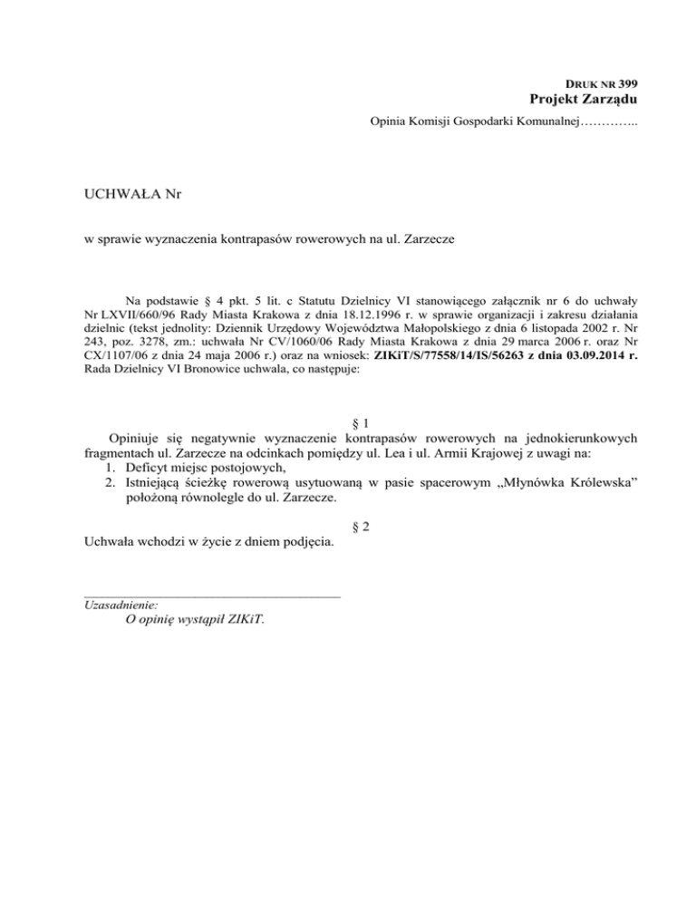 DRUK NR 399 Projekt Zarządu Opinia Komisji Gospodarki Komunalnej………….. UCHWAŁA Nr w sprawie wyznaczenia kontrapasów rowerowych na ul. Zarzecze Na podstawie § 4 pkt. 5 lit. c Statutu Dzielnicy VI stanowiącego załącznik nr 6 do uchwały Nr LXVII/660/96 Rady Miasta Krakowa z dnia 18.12.1996 r. w sprawie organizacji i zakresu działania dzielnic (tekst jednolity: Dziennik Urzędowy Województwa Małopolskiego z dnia 6 listopada 2002 r. Nr 243, poz. 3278, zm.: uchwała Nr CV/1060/06 Rady Miasta Krakowa z dnia 29 marca 2006 r. oraz Nr CX/1107/06 z dnia 24 maja 2006 r.) oraz na wniosek: ZIKiT/S/77558/14/IS/56263 z dnia 03.09.2014 r. Rada Dzielnicy VI Bronowice uchwala, co następuje: §1 Opiniuje się negatywnie wyznaczenie kontrapasów rowerowych na jednokierunkowych fragmentach ul. Zarzecze na odcinkach pomiędzy ul. Lea i ul. Armii Krajowej z uwagi na: 1. Deficyt miejsc postojowych, 2. Istniejącą ścieżkę rowerową usytuowaną w pasie spacerowym „Młynówka Królewska” położoną równolegle do ul. Zarzecze. §2 Uchwała wchodzi w życie z dniem podjęcia. ____________________________________________ Uzasadnienie: O opinię wystąpił ZIKiT.