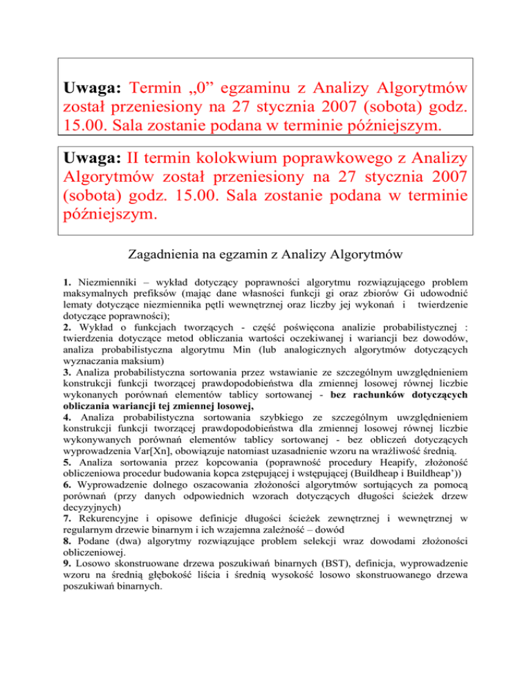 Uwaga: Termin „0” egzaminu z Analizy Algorytmów został przeniesiony na 27 stycznia 2007 (sobota) godz. 15.00. Sala zostanie podana w terminie późniejszym. Uwaga: II termin kolokwium poprawkowego z Analizy Algorytmów został przeniesiony na 27 stycznia 2007 (sobota) godz. 15.00. Sala zostanie podana w terminie późniejszym. Zagadnienia na egzamin z Analizy Algorytmów 1. Niezmienniki – wykład dotyczący poprawności algorytmu rozwiązującego problem maksymalnych prefiksów (mając dane własności funkcji gi oraz zbiorów Gi udowodnić lematy dotyczące niezmiennika pętli wewnętrznej oraz liczby jej wykonań i twierdzenie dotyczące poprawności); 2. Wykład o funkcjach tworzących - część poświęcona analizie probabilistycznej : twierdzenia dotyczące metod obliczania wartości oczekiwanej i wariancji bez dowodów, analiza probabilistyczna algorytmu Min (lub analogicznych algorytmów dotyczących wyznaczania maksium) 3. Analiza probabilistyczna sortowania przez wstawianie ze szczególnym uwzględnieniem konstrukcji funkcji tworzącej prawdopodobieństwa dla zmiennej losowej równej liczbie wykonanych porównań elementów tablicy sortowanej - bez rachunków dotyczących obliczania wariancji tej zmiennej losowej, 4. Analiza probabilistyczna sortowania szybkiego ze szczególnym uwzględnieniem konstrukcji funkcji tworzącej prawdopodobieństwa dla zmiennej losowej równej liczbie wykonywanych porównań elementów tablicy sortowanej - bez obliczeń dotyczących wyprowadzenia Var[Xn], obowiązuje natomiast uzasadnienie wzoru na wrażliwość średnią. 5. Analiza sortowania przez kopcowania (poprawność procedury Heapify, złożoność obliczeniowa procedur budowania kopca zstępującej i wstępującej (Buildheap i Buildheap’)) 6. Wyprowadzenie dolnego oszacowania złożoności algorytmów sortujących za pomocą porównań (przy danych odpowiednich wzorach dotyczących długości ścieżek drzew decyzyjnych) 7. Rekurencyjne i opisowe definicje długości ścieżek zewnętrznej i wewnętrznej w regularnym drzewie binarnym i ich wzajemna zależność – dowód 8. Podane (dwa) algorytmy rozwiązujące problem selekcji wraz dowodami złożoności obliczeniowej. 9. Losowo skonstruowane drzewa poszukiwań binarnych (BST), definicja, wyprowadzenie wzoru na średnią głębokość liścia i średnią wysokość losowo skonstruowanego drzewa poszukiwań binarnych.