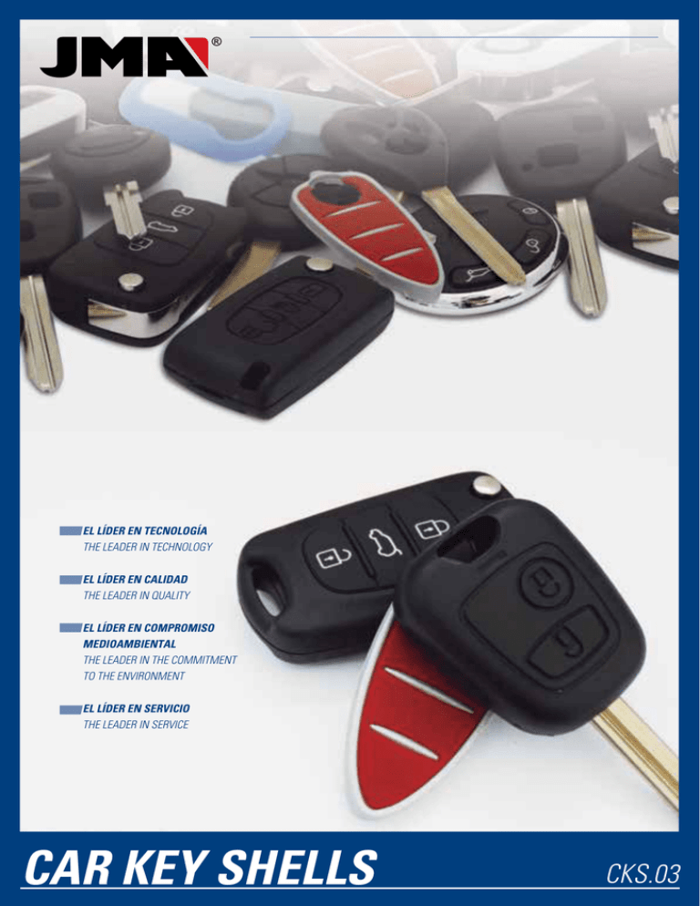 EL LÍDER EN TECNOLOGÍA THE LEADER IN TECHNOLOGY EL LÍDER EN CALIDAD THE LEADER IN QUALITY EL LÍDER EN COMPROMISO MEDIOAMBIENTAL THE LEADER IN THE COMMITMENT TO THE ENVIRONMENT EL LÍDER EN SERVICIO THE LEADER IN SERVICE CAR KEY SHELLS CKS.03 A4 ADVERTENCIA LEGAL Lege-abisua Legal warning Texte Legal Rechtlicher Hinweis Advertência legal Nota prawna A5 SIMBOLOGÍA Sinbologia Symbols Symbologie Symbole Simbologia Symbolika A6-A7ÍNDICE Aurkibidea Index Index Hauptmarke Índice Spis marek 1-57LLAVES GILTZAK KEYS CLES SCHLÜSSEL CHAVES Klucze 2 ALFA ROMEO 3 - 4 AUDI 5 - 7 BMW 7 - 8 CHEVROLET 8 - 10 CHRYSLER 10 - 17 CITROEN 17DACIA 18 - 22 FIAT 22 - 23 FORD 24 - 25 HONDA 25HYUNDAY 26 LANCIA 27 LAND RANGE ROVER 27 - 29 LEXUS 29 - 31 MERCEDES 31 - 32 MINI 32MITSUBISHI 32-33NISSAN 33 - 36 OPEL 37 - 44 PEUGEOT 44 - 49 RENAULT 49ROVER 49SAAB 50SEAT 51SKODA 52 - 53 SMART 53 - 54 SUBARU 54 - 55 SUZUKI 55 - 57 TOYOTA 58 VOLKSWAGEN 59-63OTROS BESTE BATZUK OTHERS AUTRES ANDERE OUTRAS INNE 60ESPADINES EZPATA BLADES LAMES ZUNGE LAMINA Groty 61-62TL TL HORSESHOES INSERTS TL TL TL 63 ACCESORIOS OSAGARRIAK ACCESSORIES ACCESSOIRES ZUBEHÖRTEILE ACESSÓRIOS AKCESORIA A3 Advertencia legal Legal warning ESPAÑOL Conforme a las disposiciones legales vigentes relativas a la propiedad industrial, las marcas o nombres comerciales indicados en este catálogo son propiedad exclusiva de los fabricantes de cilindros y cerraduras, así como de los fabricantes de automóviles. Dichas marcas o nombres comerciales se indican en calidad simplemente informativa con el fin de reconocer con rapidez la cerradura a la que corresponden nuestras piezas. Este catálogo está reservado exclusivamente a profesionales de la reproducción de llaves que utilizan piezas JMA. Los datos referentes a los productos de este catálogo tienen carácter indicativo. Manteniendo siempre las características básicas, nos reservamos el derecho de realizar, sin previo aviso, modificaciones técnicas, estéticas o de otro tipo, por razones de evolución de los productos en cuestión. EUSKERA ENGLISH Industria-jabegoari dagozkion indarrean dauden lege-xedapenekin bat etorriz, katalogo honetan ageri diren marka edo merkataritza-izenak zilindro eta sarrailen fabrikatzaileen jabego esklusibokoak dira, eta baita ibilgailuen fabrikatzaileena. Aipatutako markak edo merkataritza-izenak modu informatiboan soilik aipatzen dira, gure piezak zein sarrailarekin doazen azkar jakin ahal izateko. In accordance to current legal dispositions related to industrial property, the brands or commercial names indicated in this catalogue are the exclusive property of the manufacturers of cylinders and locks, as well as the manufacturers of automobiles. These brands or commercial names are used as mere information in order to quickly recognise the lock to which our parts correspond. Katalogo hau JMA piezak erabiltzen dituzten giltzen bikoizketara dedikatzen diren profesionalei zuzenduta dago. Katalogo honetako produktuei dagozkien datuak azalpen izaera dute. Beti, oinarrizko ezaugarriak mantenduz, aurreko abisurik gabe, produktu horiek eboluzionatzen dutelako, aldaketa teknikoak, estetikoak edo beste motatakoan egiteko eskubidea dugu. This catalogue is exclusively reserved to professional key duplicators that use JMA pieces. The data referring to the products of this catalogue is merely informative. Always maintaining the basic characteristics, we reserve the right to making, without previous notification, technical, aesthetic or other types of modifications, for improvement reasons of the products in question. FRANÇAIS Conformément aux dispositions légales en vigueur relatives à la propriété industrielle, les marques ou les dénominations commerciales citées dans ce catalogue sont la propriété exclusive des fabriquants de cylindres et de serrures ainsi que des constructeurs de voitures, autres constructeurs, distributeurs et utilisateurs. Ces marques ou dénominations commerciales sont indiquées à titre de simple information afin de connaître rapidement à quelle serrure nos ébauches sont destinées. Ce catalogue est exclusivement réservé aux professionnels de la reproduction de clés, utilisant des ébauches JMA. Les renseignements sur les produits de ce catalogue sont donnés à titre indicatif. Tout en gardant les caractéristiques de base, nous nous réservons le droit d’apporter, sans préavis, des modifications techniques, esthétiques ou autres, dues à l’évolution des produits en question. POTUGUESE Em conformidade com as disposições legais vigentes sobre a propriedade industrial, as marcas ou nomes comerciais indicados neste catálogo são propriedade exclusiva dos fabricantes de cilindros e fechaduras, assim como dos fabricantes de automóveis. Ditas marcas ou nomes comerciais mencionam-se com propósitos meramente informativos, com o fim de reconhecer com rapidez a fechadura a que correspondem as nossas peças. Este catálogo está reservado exclusivamente a profissionais da reprodução de chaves que utilizam peças JMA. Os dados referentes aos produtos deste catálogo têm carácter meramente indicativo. Mantendo sempre as características básicas, reservamo-nos o direito de realizar, sem prévio aviso, quaisquer modificações técnicas, estéticas ou de outro tipo, resultantes da evolução dos produtos em questão. A4A4 DEUTSCH Gemäß den geltenden gesetzlichen Bestimmungen bezüglich des gewerblichen Eigentums, der Marken oder Handelsnamen, die in diesem Katalog angegeben sind, sind diese ausschließliches Eigentum der Hersteller der Zylinder und Schlösser sowie der Fahrzeughersteller. Diese Marken oder Handelsnamen werden aus rein informativen Gründen angegeben, um die Schlösser, zu denen unsere Teile gehören, schneller zu erkennen. Dieser Katalog ist ausschließlich für Fachleute auf dem Gebiet der Reproduktion von Schlüsseln gedacht, die Teile von JMA verwenden. Die Daten bezüglich der Produkte dieses Katalogs haben ind