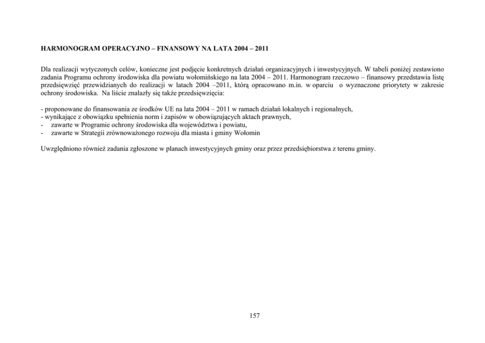 HARMONOGRAM OPERACYJNO – FINANSOWY NA LATA 2004 – 2011 Dla realizacji wytyczonych celów, konieczne jest podjęcie konkretnych działań organizacyjnych i inwestycyjnych. W tabeli poniżej zestawiono zadania Programu ochrony środowiska dla powiatu wołomińskiego na lata 2004 – 2011. Harmonogram rzeczowo – finansowy przedstawia listę przedsięwzięć przewidzianych do realizacji w latach 2004 –2011, którą opracowano m.in. w oparciu o wyznaczone priorytety w zakresie ochrony środowiska. Na liście znalazły się także przedsięwzięcia: - proponowane do finansowania ze środków UE na lata 2004 – 2011 w ramach działań lokalnych i regionalnych, - wynikające z obowiązku spełnienia norm i zapisów w obowiązujących aktach prawnych, - zawarte w Programie ochrony środowiska dla województwa i powiatu, - zawarte w Strategii zrównoważonego rozwoju dla miasta i gminy Wołomin Uwzględniono również zadania zgłoszone w planach inwestycyjnych gminy oraz przez przedsiębiorstwa z terenu gminy. 157 Plan operacyjny dla sektora: Jakość wód i stosunki wodne Lp Typ zadania Termin realizacji Likwidacja nieszczelnych zbiorników gromadzenia ścieków (szamb), kontrola zagospodarowania ścieków bytowo – gospodarczych i przemysłowych na terenach nieskanalizowanych Odmulanie, regulacja i renowacja koryt rzek Zainstalowanie liczników do pomiaru zużytej wody koordynowane Zadania ogólne 2004 - 2007 koordynowane 2004 - 2007 RZWG Warszawa budżet państwa b.d. koordynowane 2004 - 2007 Edukacja mieszkańców w zakresie możliwości i konieczności oszczędzania wody w gospodarstwach domowych koordynowane 2004 - 2007 przedsiębiorstwa wodno kanalizacyjne środki inwestorów fundusze ekologiczne b.d. 4 5 Rozbudowa i modernizacja sieci wodociągowej na pozostałym obszarze powiatu z uwzględnieniem obecnych i przyszłych odbiorców wody Budowa przydomowych oczyszczalni ścieków na pozostałych terenach wiejskich powiatu lub o zabudowie rozproszonej i w aglomeracjach o RLM mniejszej niż 2000 koordynowane 2004 - 2007 przedsiębiorstwa wodociągowe prywatni inwestorzy Starostwo Powiatowe Urzędy Miast i Gmin organizacje samorządowe i pozarządowe Urzędy Miast i Gmin Środki unijne, środki własne, fundusze ekologiczne b.d. koordynowane 2004 - 2007 fundusze ekologiczne środki UE b.d. koordynowane 2004 - 2007 Urzędy Miast i Gmin przedsiębiorstwa wodno – kanalizacyjne prywatni inwestorzy Starostwo Powiatowe Urzędy 1 2 3 6 7 Zadanie Inwentaryzacja i likwidacja nielegalnych wylotów sieci 158 Realizatorzy Źródła finansowania Urzędy Miast i Gmin Straż Miejska fundusze ekologiczne środki właścicieli posesji środki własne Szacunkowy koszt zł 2 000 000 20 000 500 000 Lp Zadanie Typ zadania Termin realizacji Realizatorzy Źródła finansowania Miast i Gmin Przedsiębiorstwa Wodociągów i Kanalizacji fundusze ekologiczne środki podmiotów gospodarczych Gmina Dąbrówka 2004 Gmina Dąbrówka 1 200 000 2005-2006 Gmina Dąbrówka 2004-2007 Gmina Dąbrówka 2005 Gmina Dąbrówka 2005-2006 Gmina Dąbrówka 2008 Gmina Dąbrówka 2009 Gmina Dąbrówka Budowa kanalizacji Ciesic, Czarnów, Stasiopole Budowa kanalizacji Ludwinów 2008-2009 Gmina Dąbrówka 2011 Gmina Dąbrówka Budowa kanalizacji Trojany, Wszebory, Zaścienie, Karolew, Chruściele Budowa wodociągu Dręszew 2001-2011 Gmina Dąbrówka Budżet Gminy Środki strukturalne Budżet Gminy Środki strukturalne Budżet Gminy Środki strukturalne Budżet Gminy Środki strukturalne Budżet Gminy Środki strukturalne Budżet Gminy Środki strukturalne Budżet Gminy Środki strukturalne Budżet Gminy Środki strukturalne Budżet Gminy Środki strukturalne Budżet Gminy Środki strukturalne 2010 Gmina Dąbrówka b.d. Budowa oczyszczalni TrojanyZaścienie 2010 Gmina Dąbrówka Budżet Gminy Środki strukturalne Budżet Gminy Środki strukturalne kanalizacyjnej do cieków wodnych 1 2 3 4 5 6 7 8 9 10 11 12 Budowa wodociągów: Chajęty,i Działy Czarnowskie, Budowa wodociągu Dąbrówce Budowa kanalizacji: Kapin, Lasków, Małopole Budowa oczyszczalni ścieków w Kuligowie Budowa kanalizacji Kuligów,Józefów Budowa wodociągu Lasków, Karpin Budowa wodociągu Małopole koordynowane 159 Szacunkowy koszt zł 2 000 000 6 100 000 b.d. b.d. b.d. b.d. b.d. b.d. b.d. b.d. Lp 1 2 3 4 5 6 7 8 9 10 11 12 Zadanie Rozbudowa oczyszczalni ścieków Krym o dwa ciągi technologiczne Modernizacja przepompowni „Gryczana” Budowa kolektorów sanitarnych –kanały o łącznej długości 40,25 km Budowa kolektorów sanitarnych –przepompownie w ilości 23 szt. Kolektor Fo o długości 1,54 km Budowa kanalizacji deszczowej w Wołominie Budowa magistrali wodociągowej Modernizacja stacji uzdatniania wody SUW Graniczna i SUW Lipińska Budowa małych przydomowych oczyszczalni biologicznych na terenach wiejskich poza zasięgiem sieci miejskiej Wymiana rur azbestowocementowych wodociągowych na długość ok. 7 km Poprawa stanu gospodarki wodnej i zabezpieczenia przeciwpowodziowe Budowa kanalizacji deszczowej Typ zadania Termin realizacji Realizatorzy Gmina Wołomin i Gmina Kobyłka 2009 PWiK, Gmina Kobyłka Gmina Wołomin 2009 PWiK, Gmina Kobyłka Gmina Wołomin 2009 PWiK, Gmina Wołomin Szacunkowy koszt zł Środki własne Fundusz Spójności 30 000 000 Środki własne Fundusz Spójności 2 000 000 Środki własne Fundusz Spójności 18 390 000 2009 PWiK, Gmina Wołomin Środki własne Fundusz Spójności 1 380 000 2009 PWiK, Gmina Wołomin PWiK, Gmina Wołomin PWiK, Gmina Wołomin PWiK, Gmina Wołomin Środki własne Fundusz Spójności Środki własne Fundusz Spójności Środki własne Fundusz Spójności PWiK 3 000 000 2015 PWiK, Gmina Wołomin Środki własne właściciele nieruchomości 10 000 000 2015 PWiK, Gmina Wołomin PWiK 1 600 000 2004-20011 Gmina Wołomin FIOŚiGW 30 000 2004-2011 gmina Wołomin Gmina Wołomin 9 500 000 2009 koordynowane Źródła finansowania 2010 2006 160 8 000 000 1 500 000 4 200 000 Lp 13 14 15 Zadanie Inwestycj
