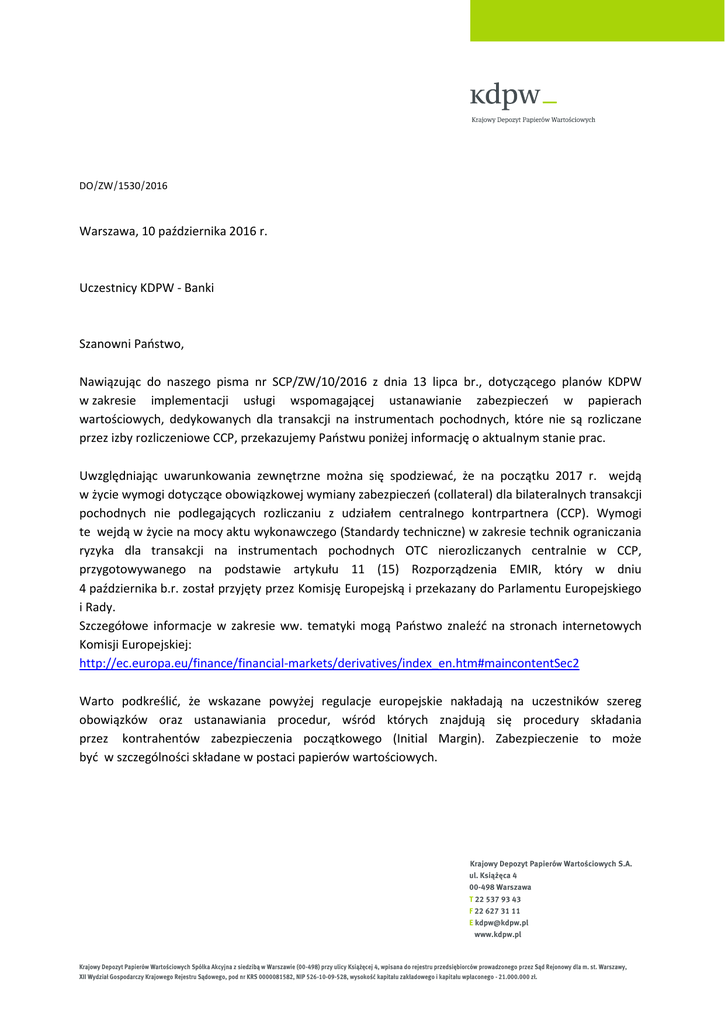 DO/ZW/1530/2016 Warszawa, 10 października 2016 r. Uczestnicy KDPW - Banki Szanowni Państwo, Nawiązując do naszego pisma nr SCP/ZW/10/2016 z dnia 13 lipca br., dotyczącego planów KDPW w zakresie implementacji usługi wspomagającej ustanawianie zabezpieczeń w papierach wartościowych, dedykowanych dla transakcji na instrumentach pochodnych, które nie są rozliczane przez izby rozliczeniowe CCP, przekazujemy Państwu poniżej informację o aktualnym stanie prac. Uwzględniając uwarunkowania zewnętrzne można się spodziewać, że na początku 2017 r. wejdą w życie wymogi dotyczące obowiązkowej wymiany zabezpieczeń (collateral) dla bilateralnych transakcji pochodnych nie podlegających rozliczaniu z udziałem centralnego kontrpartnera (CCP). Wymogi te wejdą w życie na mocy aktu wykonawczego (Standardy techniczne) w zakresie technik ograniczania ryzyka dla transakcji na instrumentach pochodnych OTC nierozliczanych centralnie w CCP, przygotowywanego na podstawie artykułu 11 (15) Rozporządzenia EMIR, który w dniu 4 października b.r. został przyjęty przez Komisję Europejską i przekazany do Parlamentu Europejskiego i Rady. Szczegółowe informacje w zakresie ww. tematyki mogą Państwo znaleźć na stronach internetowych Komisji Europejskiej: http://ec.europa.eu/finance/financial-markets/derivatives/index_en.htm#maincontentSec2 Warto podkreślić, że wskazane powyżej regulacje europejskie nakładają na uczestników szereg obowiązków oraz ustanawiania procedur, wśród których znajdują się procedury składania przez kontrahentów zabezpieczenia początkowego (Initial Margin). Zabezpieczenie to może być w szczególności składane w postaci papierów wartościowych. verte Krajowy Depozyt Papierów Wartościowych S.A. ul. Książęca 4 00-498 Warszawa T 22 537 93 43 F 22 627 31 11 E [email protected] www.kdpw.pl Krajowy Depozyt Papierów Wartościowych Spółka Akcyjna z siedzibą w Warszawie (00-498) przy ulicy Książęcej 4, wpisana do rejestru przedsiębiorców prowadzonego przez Sąd Rejonowy dla m. st. Warszawy, XII Wydział Gospodarczy Krajowego Rejestru Sądowego, pod nr KRS 0000081582, NIP 526-10-09-528, wysokość kapitału zakładowego i kapitału wpłaconego - 21.000.000 zł. Biorąc powyższe pod uwagę pojawia się istotny bodziec do bardziej powszechnego użycia papierów wartościowych jako aktywów zabezpieczających. Warto jednakże podkreślić, że podstawowym wymogiem stawianym przez Standardy techniczne dla Initial Margin w formie innej niż środki pieniężne jest wymóg segregacji, czyli prawnego odseparowania zabezpieczenia zarówno od aktywów dawcy, jak i biorcy zabezpieczenia. Oznacza to, że najbardziej powszechna forma zabezpieczenia stosowana w zakresie transakcji pochodnych, polegająca na przeniesieniu własności na biorcę zabezpieczenia nie będzie mogła być w tym przypadku zastosowana i konieczne stanie się opracowanie takiej formy zabezpieczenia, która zapewnia spełnienie wymogu segregacji zabezpieczenia. Wydaje się, że rozwiązanie zaproponowane przez KDPW spełniałoby powyższe wymogi. Pragniemy przy tej okazji przypomnieć, że szczegółowy opis nowej usługi KDPW został zawarty w naszym piśmie z 13 lipca br., natomiast tym z Państwa, którzy nie mieli okazji do wcześniejszego zapoznania się z tym materiałem, przekazujemy go ponownie w załączeniu do niniejszego pisma. Informujemy jednocześnie, że konsultacje przeprowadzone z bankami w lipcu i sierpniu br. wskazują na potrzebę pewnej modyfikacji rozwiązania zaproponowanego przez KDPW. Zgodnie z przekazaną opinią przejęcie zabezpieczenia, wskazane w pkt 3a, powinno być realizowane na skutek zestawienia odpowiednio zgodnych instrukcji rozrachunku dostarczonych przez obie strony, tj. dawcę i biorcę zabezpieczenia. W celu omówienia ewentualnych dalszych kroków związanych z implementacją nowej funkcjonalności oferowanej przez KDPW, jak również w celu oceny stopnia dopasowania nowej usługi do Państwa oczekiwań, chcemy zaproponować udział w spotkaniu roboczym poświęconym temu tematowi. Prosimy bardzo o ewentualną redystrybucję niniejszego materiału do innych Departamentów Państwa instytucji zainteresowanych tym tematem. Zapraszamy przedstawicieli Państwa instytucji na spotkanie w dniu 26 października 2016 r. o godzinie 15.00 do siedziby KDPW (ul. Książęca 4, sala konferencyjna na VI piętrze). Ze względu na ograniczoną liczbę miejsc prosimy o potwierdzenie obecności do dnia 21 października br. na adres [email protected] Ze strony KDPW zakładamy, że implementacja nowego rozwiązania obejmować będzie: przygotowanie standardu umowy zastawu finansowego na obligacjach skarbowych przechowywyanych przez banki w KDPW oraz przygotowanie opinii prawnych i procedur operacyjnych związanych z wykorzystaniem papierów wartościowych jako zabezpieczeń dla ww. transakcji – zadanie realizowane po stronie banków, z ewentualnym wsparciem zewnętrznego doradcy; udział podmiotu zainteresowanego tym zagadnieniem przewidujemy podczas ww. spotkania, implementacja rozwiązania na poziomie systemu informatycznego i regulacji KDPW. Z poważaniem, Sławomir Panasiuk Wiceprezes Zarządu KDPW S.A. Załączniki: 1/ Koncepcja założeń dotyczących ustanawiania zabezpieczeń w papierach wartościowych na rzecz innych uczestników KDPW 2