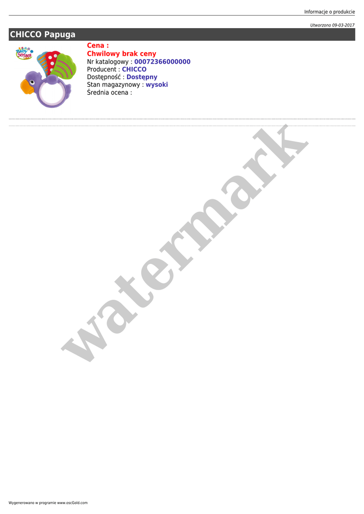 Informacje o produkcie Utworzono 09-03-2017 CHICCO Papuga Cena : Chwilowy brak ceny w at er m ar k Nr katalogowy : 00072366000000 Producent : CHICCO Dostępność : Dostępny Stan magazynowy : wysoki Średnia ocena : Wygenerowano w programie www.oscGold.com