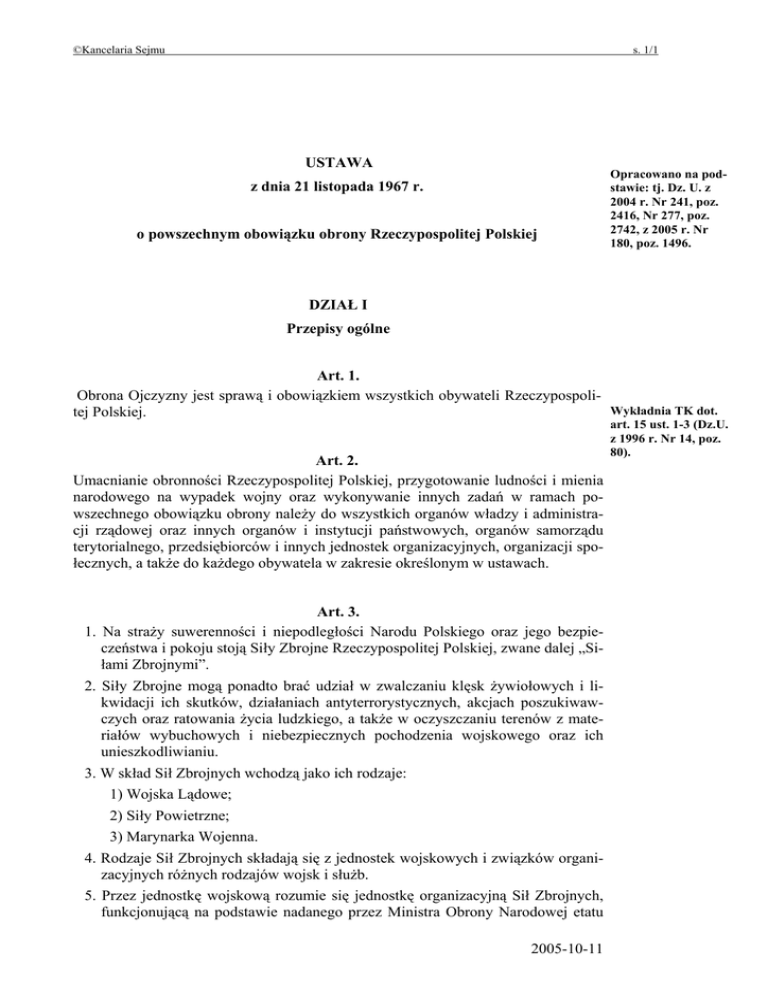 ©Kancelaria Sejmu s. 1/1 USTAWA z dnia 21 listopada 1967 r. o powszechnym obowiązku obrony Rzeczypospolitej Polskiej Opracowano na podstawie: tj. Dz. U. z 2004 r. Nr 241, poz. 2416, Nr 277, poz. 2742, z 2005 r. Nr 180, poz. 1496. DZIAŁ I Przepisy ogólne Art. 1. Obrona Ojczyzny jest sprawą i obowiązkiem wszystkich obywateli RzeczypospoliWykładnia TK dot. tej Polskiej. Art. 2. Umacnianie obronności Rzeczypospolitej Polskiej, przygotowanie ludności i mienia narodowego na wypadek wojny oraz wykonywanie innych zadań w ramach powszechnego obowiązku obrony należy do wszystkich organów władzy i administracji rządowej oraz innych organów i instytucji państwowych, organów samorządu terytorialnego, przedsiębiorców i innych jednostek organizacyjnych, organizacji społecznych, a także do każdego obywatela w zakresie określonym w ustawach. Art. 3. 1. Na straży suwerenności i niepodległości Narodu Polskiego oraz jego bezpieczeństwa i pokoju stoją Siły Zbrojne Rzeczypospolitej Polskiej, zwane dalej „Siłami Zbrojnymi”. 2. Siły Zbrojne mogą ponadto brać udział w zwalczaniu klęsk żywiołowych i likwidacji ich skutków, działaniach antyterrorystycznych, akcjach poszukiwawczych oraz ratowania życia ludzkiego, a także w oczyszczaniu terenów z materiałów wybuchowych i niebezpiecznych pochodzenia wojskowego oraz ich unieszkodliwianiu. 3. W skład Sił Zbrojnych wchodzą jako ich rodzaje: 1) Wojska Lądowe; 2) Siły Powietrzne; 3) Marynarka Wojenna. 4. Rodzaje Sił Zbrojnych składają się z jednostek wojskowych i związków organizacyjnych różnych rodzajów wojsk i służb. 5. Przez jednostkę wojskową rozumie się jednostkę organizacyjną Sił Zbrojnych, funkcjonującą na podstawie nadanego przez Ministra Obrony Narodowej etatu 2005-10-11 art. 15 ust. 1-3 (Dz.U. z 1996 r. Nr 14, poz. 80). ©Kancelaria Sejmu s. 2/2 określającego jej strukturę wewnętrzną, liczbę, rodzaje i rangę wszystkich stanowisk służbowych występujących w tej jednostce, jak również liczbę i rodzaje uzbrojenia, środków transportu i innego wyposażenia należnego jednostce, oraz posługującą się pieczęcią urzędową z godłem Rzeczypospolitej Polskiej i nazwą (numerem) jednostki. 6. Przez związek organizacyjny rozumie się jednostki wojskowe zorganizowane w określoną strukturę, w szczególności w korpus, dywizję lub brygadę, funkcjonującą samodzielnie albo w składzie rodzaju Sił Zbrojnych. 7. W skład Sił Zbrojnych wchodzą również Wojskowe Służby Informacyjne i Żandarmeria Wojskowa, jako ich wyodrębnione i wyspecjalizowane służby. Art. 3a. 1. Jednostki wojskowe i ich związki organizacyjne są rozmieszczone w garnizonach. 2. Minister Obrony Narodowej powierza pełnienie funkcji dowódcy garnizonu żołnierzowi zawodowemu zajmującemu stanowisko służbowe w tym garnizonie, a także zwalnia z tej funkcji. 3. Minister Obrony Narodowej, w drodze rozporządzenia, tworzy, przekształca i znosi garnizony, określa zadania ich dowódców oraz siedziby i terytorialny zasięg właściwości, z uwzględnieniem w szczególności podziału terytorialnego państwa. Art. 4. 1. Powszechnemu obowiązkowi obrony podlegają wszyscy obywatele polscy zdolni ze względu na wiek i stan zdrowia do wykonywania tego obowiązku. Obywatel polski będący równocześnie obywatelem innego państwa nie podlega powszechnemu obowiązkowi obrony, jeżeli stale zamieszkuje poza granicami Rzeczypospolitej Polskiej. 2. W ramach powszechnego obowiązku obrony obywatele polscy są obowiązani do pełnienia służby wojskowej, służby w obronie cywilnej, odbywania przysposobienia obronnego, uczestniczenia w samoobronie ludności, pełnienia służby w jednostkach zmilitaryzowanych oraz do wykonywania świadczeń na rzecz obrony – na zasadach i w zakresie określonych w ustawie. 2a. Przeznaczanie do służby zastępczej, kierowanie do jej odbywania oraz odbywanie służby zastępczej następuje na zasadach określonych w ustawie z dnia 28 listopada 2003 r. o służbie zastępczej (Dz.U. Nr 223, poz. 2217). 3. Ochotnicze spełnianie zadań w ramach powszechnego obowiązku obrony Rzeczypospolitej Polskiej jest prawem wszystkich obywateli polskich. Art. 4a. 1. Prezydent Rzeczypospolitej Polskiej, stojąc na straży suwerenności i bezpieczeństwa państwa, nienaruszalności i niepodzielności jego terytorium, w szczególności: 1) zatwierdza, na wniosek Prezesa Rady Ministrów, strategię bezpieczeństwa narodowego; 2005-10-11 ©Kancelaria Sejmu s. 3/3 2) wydaje, na wniosek Prezesa Rady Ministrów, w drodze postanowienia, Polityczno-Strategiczną Dyrektywę Obronną Rzeczypospolitej Polskiej oraz inne dokumenty wykonawcze do strategii bezpieczeństwa narodowego; 3) zatwierdza, na wniosek Rady Ministrów, plany krajowych ćwiczeń systemu obronnego i kieruje ich przebiegiem; 4) postanawia, na wniosek Prezesa Rady Ministrów, o wprowadzeniu albo zmianie określonego stanu gotowości obronnej państwa; 5) może zwracać się do wszystkich organów władzy publicznej, administracji rządowej i samorządowej, przedsiębiorców, kierowników innych jednostek organizacyjnych oraz organizacji społecznych o informacje mające znaczenie dla bezpieczeństwa i obronności państwa; 6) inicjuje i patronuje przedsięwzięciom ukierunkowanym na kształtowanie postaw patriotycznych i obronnych w społeczeństwie. 2. Informacje, o których mowa w ust. 1 pkt 5, przekazywane są bezzwłocznie. Art. 5. Prezydent Rzeczypospolitej Polskiej, sprawując zwierzchnictwo nad Siłami Zbrojnymi, w szczególności: 1) określa, na wniosek Ministra Obrony Narodowej, główne kierunki rozwoju Sił Zbrojnych oraz ich przygotowań do obrony państwa; 2) może uczestniczyć w odprawach kierowniczej kadry Ministerstwa Obrony Narodowej i Sił Zbrojnych. Art. 6. 1. Do zadań Rady Ministrów wykonywanych w ramach zapewniania zewnętrznego bezpieczeństwa państwa i sprawowania ogólnego kierownictwa w dziedzinie obronności 
