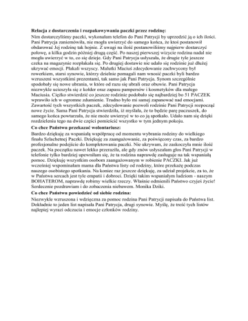 Relacja z dostarczenia i rozpakowywania paczki przez rodzinę: Nim dostarczyliśmy paczki, wykonałam telefon do Pani Patrycji by uprzedzić ją o ich ilości. Pani Patrycja zaniemówiła, nie mogła uwierzyć do samego końca, że ktoś postanowił obdarować Jej rodzinę tak hojnie. Z uwagi na ilość postanowiliśmy najpierw dostarczyć połowę, a kilka godzin później drugą część. Po naszej pierwszej wizycie rodzina nadal nie mogła uwierzyć w to, co się dzieje. Gdy Pani Patrycja usłyszała, że drugie tyle jeszcze czeka na magazynie rozpłakała się. Po drugiej dostawie nie udało się rodzinie już dłużej ukrywać emocji. Płakali wszyscy. Malutki Maciuś zdecydowanie zachwycony był rowerkiem, starsi synowie, którzy dzielnie pomagali nam wnosić paczki byli bardzo wzruszeni wszystkimi prezentami, tak samo jak Pani Patrycja. Synom szczególnie spodobały się nowe ubrania, w które od razu się ubrali oraz obuwie. Pani Patrycja niezwykle ucieszyła się z kołder oraz zapasu pampersów i kosmetyków dla małego Maciusia. Ciężko stwierdzić co jeszcze rodzinie podobało się najbardziej bo 51 PACZEK wprawiło ich w ogromne zdumienie. Trudno było mi samej zapanować nad emocjami. Zawartość tych wszystkich paczek, zdecydowanie pozwoli rodzinie Pani Patrycji rozpocząć nowe życie. Sama Pani Patrycja stwierdziła, iż myślała, że to będzie parę paczuszek, do samego końca powtarzała, że nie może uwierzyć w to co ją spotkało. Udało nam się dzięki rozdzieleniu tego na dwie części pomieścić wszystko w tym jednym pokoju. Co chce Państwu przekazać wolontariusz: Bardzo dziękuję za wspaniałą współpracę od momentu wybrania rodziny do wielkiego finału Szlachetnej Paczki. Dziękuję za zaangażowanie, za poświęcony czas, za bardzo profesjonalne podejście do kompletowania paczki. Nie ukrywam, że zaskoczyła mnie ilość paczek. Na początku nawet lekko przeraziła, ale gdy znów usłyszałam głos Pani Patrycji w telefonie tylko bardziej upewniłam się, że ta rodzina naprawdę zasługuje na tak wspaniałą pomoc. Dziękuję wszystkim osobom zaangażowanym w robienie PACZKI. Jak już wcześniej wspominałam mama dla Państwa listy od rodziny, które przekażę podczas naszego osobistego spotkania. Na koniec raz jeszcze dziękuję, za udział projekcie, za to, że w Państwa sercach jest tyle empatii i dobroci. Dzięki takim wspaniałym ludziom - naszym BOHATEROM, naprawdę robimy wielkie rzeczy. Właśnie odmienili Państwo czyjeś życie! Serdecznie pozdrawiam i do zobaczenia niebawem. Monika Dziki. Co chce Państwu powiedzieć od siebie rodzina: Niezwykle wzruszona i wdzięczna za pomoc rodzina Pani Patrycji napisała do Państwa list. Dokładnie to jeden list napisała Pani Patrycja, drugi synowie. Myślę, że treść tych listów najlepiej wyrazi odczucia i emocje członków rodziny.