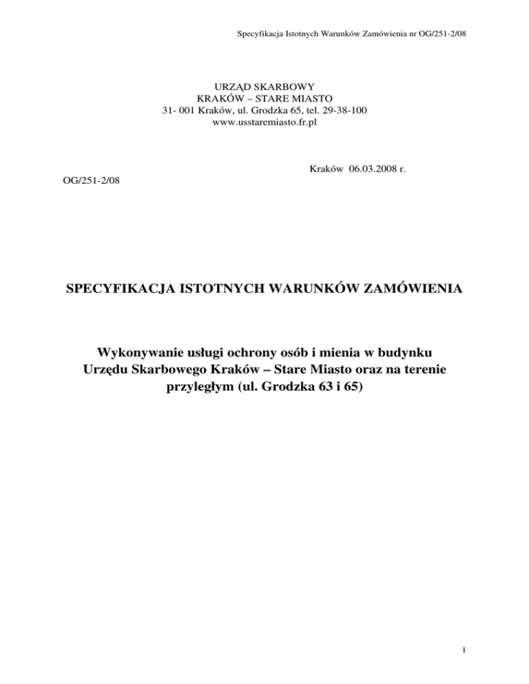 Specyfikacja Istotnych Warunków Zamówienia nr OG/2512/08 URZĄD SKARBOWY KRAKÓW – STARE MIASTO 31 001 Kraków, ul. Grodzka 65, tel. 2938100 www.usstaremiasto.fr.pl Kraków 06.03.2008 r. OG/2512/08 SPECYFIKACJA ISTOTNYCH WARUNKÓW ZAMÓWIENIA Wykonywanie usługi ochrony osób i mienia w budynku Urzędu Skarbowego Kraków – Stare Miasto oraz na terenie przyległym (ul. Grodzka 63 i 65) 1 SPIS TREŚCI I. Informacje o Zamawiającym. II. Tryb udzielenia zamówienia. III.Opis przedmiotu zamówienia. IV.Termin i warunki wykonania zamówienia. V. Opis warunków udziału w postępowaniu oraz opis sposobu dokonywania oceny spełniania tych warunków przez Wykonawców. VI.Informacja o oświadczeniach i dokumentach, jakie mają dostarczyć Wykonawcy w celu potwierdzenia spełnienia warunków udziału w postępowaniu. VII.Informacja o sposobie porozumiewania się Zamawiającego z Wykonawcami oraz przekazywania oświadczeń i dokumentów. VIII.Termin związania ofertą. IX.Wymagania dotyczące wadium. X. Opis sposobu przygotowania oferty. XI.Miejsce oraz termin składania i otwarcia ofert. XII.Opis sposobu obliczenia ceny. XIII.Opis kryteriów, którymi Zamawiający będzie się kierował przy wyborze oferty oraz sposobu oceny ofert. XIV.Istotne dla stron postanowienia, które zostaną wprowadzone do treści zawieranej umowy w sprawie zamówienia publicznego wzór umowy. XV.Pouczenie o środkach ochrony prawnej przysługujących Wykonawcy w toku postępowania o udzielenie zamówienia. Specyfikacja Istotnych Warunków Zamówienia nr OG/2512/08 I. Informacje o Zamawiającym. Urząd Skarbowy Kraków – Stare Miasto ul. Grodzka 65, 31001 Kraków tel. (012) 2938100 (centrala), faks (012) 2938266 (sekretariat) email: [email protected] NIP: 6761069267, REGON: 3500042231 II. Tryb udzielenia zamówienia. 1. Zamówienie publiczne udzielane jest zgodnie z ustawą z dnia 29 stycznia 2004r. Prawo zamówień publicznych (Dz.U. z 2006r. Nr 164, poz. 1163 z późn. zm.) zwaną dalej „pzp” w trybie przetargu nieograniczonego – na podstawie art. 39 – 46 pzp. III.Opis przedmiotu zamówienia: 1. Przedmiotem zamówienia jest wykonywanie usługi ochrony osób i mienia w budynku Urzędu Skarbowego Kraków – Stare Miasto oraz na terenie przyległym w rozumieniu ustawy z dnia 22 sierpnia 1997r. o ochronie osób i mienia (Dz. U. z 2005r. Nr 145, poz. 1221 z późn. zm.)., oraz zgodnie z przepisami wewnętrznymi Zamawiającego. Wspólny słownik zamówień CPV 746100008 2. Zakres usługi: a. Codzienna całodobowa ochrona obiektu polegająca na stałej obecności w obiekcie pracownika (również w dni wolne od pracy i święta), wyposażonego w techniczne środki łączności jak również indywidualne środki ochrony osobistej. b. Zapewnienie maksymalnego bezpieczeństwa mienia, życia i zdrowia osób przebywających na terenie obiektu. c. Kontrolowanie ruchu osobowego zgodnie z przepisami obowiązującymi na terenie obiektu oraz prowadzenie dokumentacji z tym związanej. d. Uniemożliwienie przebywania na terenie Urzędu Skarbowego osobom będącym pod wpływem alkoholu, środków odurzających, oraz osób nie posiadających uprawnień do przebywania na terenie budynku, poprzez patrolowanie obiektu oraz terenu przyległego, jak również prowadzenie obserwacji za pomocą istniejącego systemu monitoringu 3 wizyjnego. e. Przeciwdziałanie wszelkim próbom zakłócenia porządku i kradzieży na terenie objętym ochroną, zatrzymywanie osób schwytanych na kradzieży lub dewastujących mienie i natychmiastowe powiadamianie załogi interwencyjnej lub Policji oraz Kierownictwa Urzędu. f. Kontrola prawidłowości zabezpieczeń mechanicznych oraz budowlanych na zewnątrz i wewnątrz obiektu poprzez dokonywanie obchodów i obserwacji. g. Wydawanie, przyjmowanie i przechowywanie kluczy do pomieszczeń w budynku wg obowiązujących przepisów Zamawiającego. h. Prowadzenie „Książki służby” w której ma być rejestrowane każdorazowe zdanie/przyjęcie służby z podaniem godziny, nazwiska zdającego i przyjmującego służbę oraz wszelkie uwagi i zdarzenia zaistniałe w trakcie pełnienia służby. i. W przypadku napadu lub wystąpienia pożaru niezwłoczne powiadomienie odpowiednio Policji lub Straży Pożarnej oraz Kierownictwa Urzędu. j. W razie wystąpienia awarii związanych z funkcjonowaniem urządzeń technicznych w Urzędzie lub innych zdarzeń losowych powodujących zagrożenie bezpieczeństwa osób przebywających na terenie obiektu, natychmiastowe powiadomienie odpowiedzialnego pracownika Urzędu, oraz podjęcie niezbędnych działań celem zapewnienia bezpieczeństwa osób i zabezpieczenia mienia przed zniszczeniem. k. Obsługa central systemów alarmowych: sygnalizacji włamania i sygnalizacji pożaru. l. Współpraca z firmą wykonującą dla Urzędu Skarbowego usługę monitoringu wraz z interwencją (szczegóły współpracy zostaną określone w „Instrukcji pełnienia służby przez pracowników ochrony w Urzędzie skarbowym Kraków – Stare Miasto”) m. Obsługa systemu zamków kodowanych, systemów alarmowych i innych urządzeń zainstalowanych w miejscu pełnienia służby. n. Obsługa systemu telewizji dozorowej. o. Zapalanie i gaszenie oświetlenia budynku po zakończeniu pracy i opuszczeniu pomieszczeń przez pracowników. p. Otwieranie i zamykanie drzwi wejściowych do budynku. q. W dniach pracujących Urzędu Skarbowego w godzinach: poniedziałek 7.15 – 18.00 wtorek – piątek 7.15 – 15.15 Zamawiający wymaga aby na terenie obiektu usługę ochrony wykonywała osoba posiadająca licencję pierwszego stopnia pracownika ochrony i była wyposażona w środki przymusu bezpośredniego. Po godzinach pracy Urzędu Skarbowego oraz w dni wolne i święta pracownik ochrony nie musi posiadać licencji. Specyfikacja Istotnych Warunków Zamówienia nr OG/2512/08 r. Ochrona wykonywana będzie przez jedną osobę (pełnienie dyżurów ze zmianami). s. Dla obiektu zostanie sporządzony Plan 